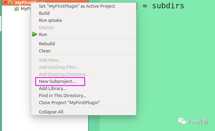 选中工程【MyFirstPlugin】后鼠标右键,【New SubProject...】。之后添加的子工程就像平时创建带有UI的工程一样,我选择的是继承QWidget。我的名称是PluginWidget