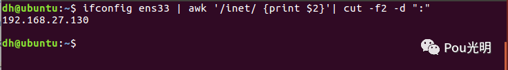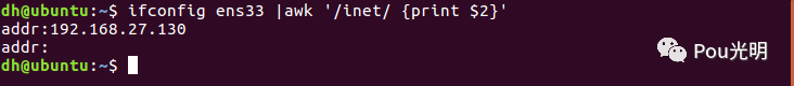 {print $2} 对第二列结果进行输出;以上面ifconfig ens33输出为例,按照空格来划分域,找到inet所在行并输出第二个域