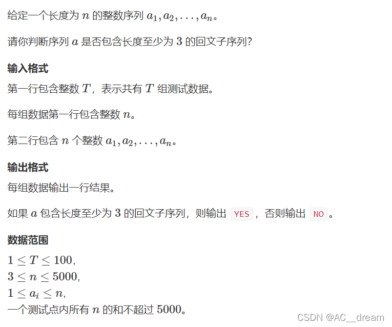 思路:注意子序列是不要求连续的序列,我们用p[i]记录i第一次出现的位置,这样等到i再次出现时,我们只需要判断他们的间隔有没有大于等于2即可