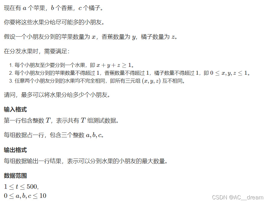 int cnta,cntb,cntc,ans=0,cnt;//cnta/b/c分别为小朋友分到的三种水果数目