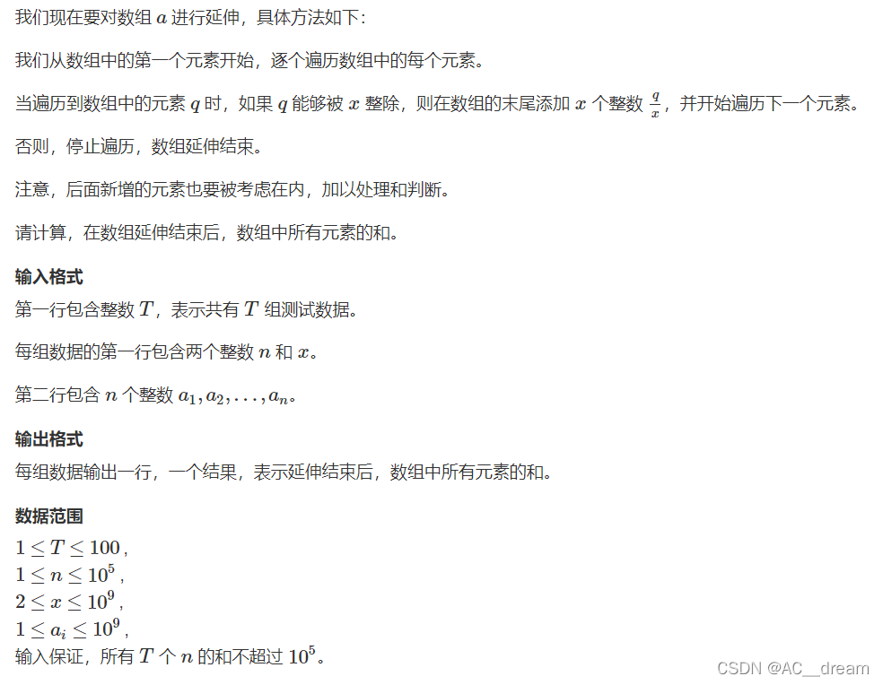 思路:当q被展开时,他会多出x个整数q/x,这些整数的和也是q,也就是被展开一次,这个数就会被重复计算一次,那么我们就不难想到,我们需要计算的是每个数能够被展开多少次,如果计算不会中途停止的话这个数也就会被计算多少次,但是由于题目中说当出现不能整除的情况时会停止,所以我们需要关注的是所有数能够被展开的次数的最小值cnt,并从头开始遍历,当出现某一个数的展开次数等于cnt时就终止