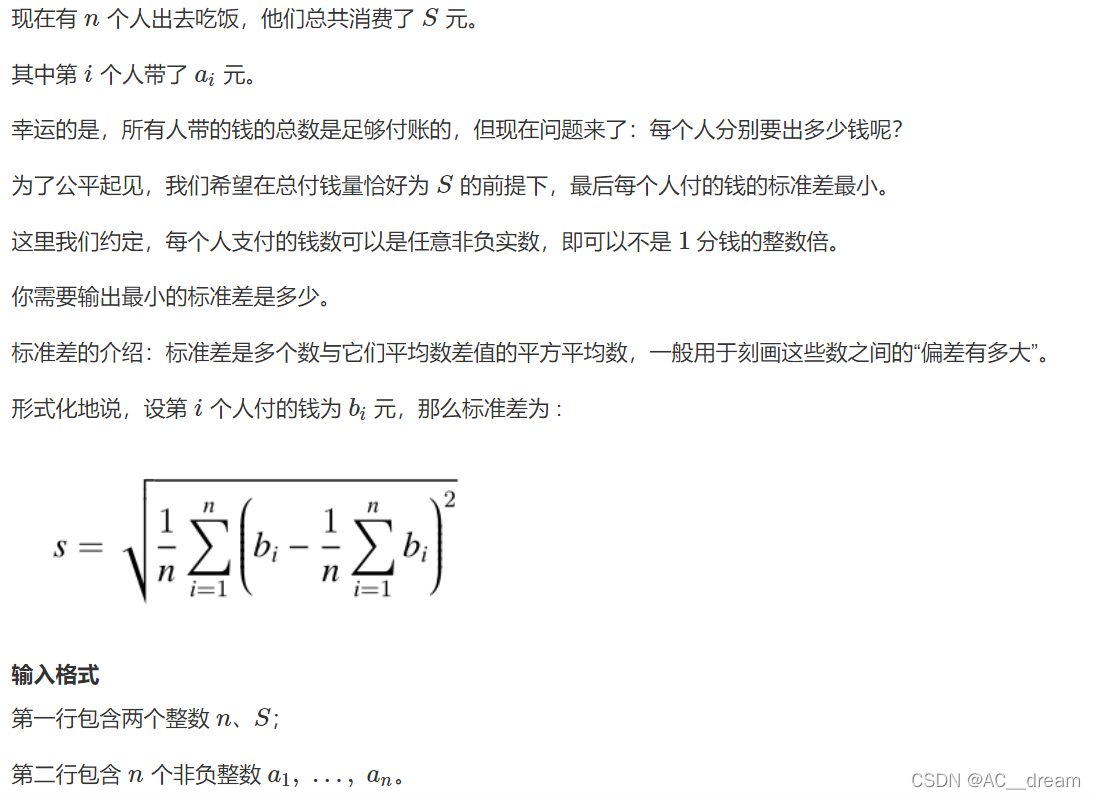 分析:这是一个贪心的问题,我们容易得到,如果所有人中拥有钱数最少的人的钱大于平均支付的钱,那么所有人都可以支付相同的钱数使得标准差为0,要想使标准差尽量小就要使得数与数之间的差距尽量小,我们可以维护一个当前剩余钱数以及当前需要支付钱数的平均值,我们先把所有人的钱从小到大排序,一个一个遍历,如果当前人所能够支付的钱数小于当前所需支付钱数的平均值,那么肯定就要把他所有的钱贡献出来,然后用所需支付的钱数减去当前的人所支付的钱数作为遍历到下一个人一共所需支付的钱数,如果当前人所能够支付的钱数大于等于当前所需支付钱数的平均值,那么之后的所有人也能够支付起平均值,那么所有人都支付平均值所需的钱数即可使得平均值最小,这就是这道题目贪心的策略。