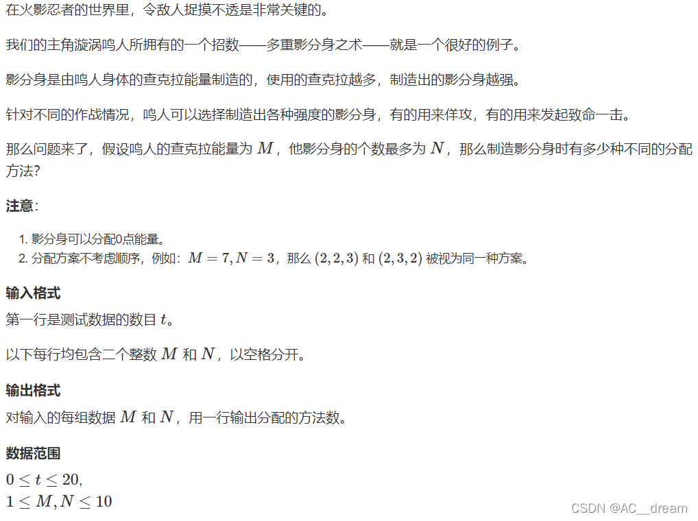 分析:这道题是一道比较经典的问题,就是求把n个苹果放在j个盘子里的方案数,设dp[i][j]就是把i分成j份的方案数,显然有dp[0][j]=1(就是每一份都为0),dp[i][0]=0(把i分成0份是不合法的),若i<j,也就是说盘子比苹果多,那么显然至少有j-i个盘子为空,那么对于这种情况就有dp[i][j]=dp[i][i],若不属于上述三种情况,那么就有i>=j,就有dp[i][j]=dp[i][j-1]+dp[i-j][j],这个转移方程是怎么得到的呢?其实这是按照有没有空盘子来划分的,先来看有空盘子的情况,那么至少有一个空盘子,也就是dp[i][j-1],这时候有小伙伴可能会有疑问,那为什么不能是有两个或者多个空盘子呢?其实有多个空盘子的情况是包含在dp[i][j-1]的,这一点希望大家好好理解一下,另一种情况就是没有空盘子的情况,i-j代表先拿出j个苹果放到j个盘子里面各一个,这样会保证每个盘子均不为空,剩余的i-j个苹果再继续分配,理解了这个状态转移方程就不难解决这道题目了,下面是代码: