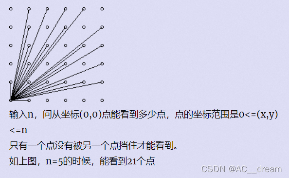 先来分析我们在x=8这条线上可以看到的点(1,8),(3,8),(5,8),(7,8),容易发现表示坐标的两个点是互质的,当然这也比较好理解,如果不互质说明两个数有公约数,也就是说这个点其实是被前面某个点遮住的,分析到这我们就能够得出一个结论,第一次看到的点在x=t这条线上的点的纵坐标一定与t互质,既然有了这个结论,那整个图可以看作是一条条满足x<=n的竖线所组成,也就是小于等于n的数的欧拉函数的和。所以结果就是小于等于n的欧拉函数的和的2倍+1.
