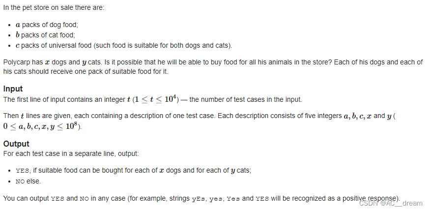 题意:给你a袋狗粮,b袋猫粮,c袋万能粮(万能粮可以作为猫粮也可以作为狗粮),x条狗,y只猫,问能否满足每个动物都有一袋适合自己的粮食。