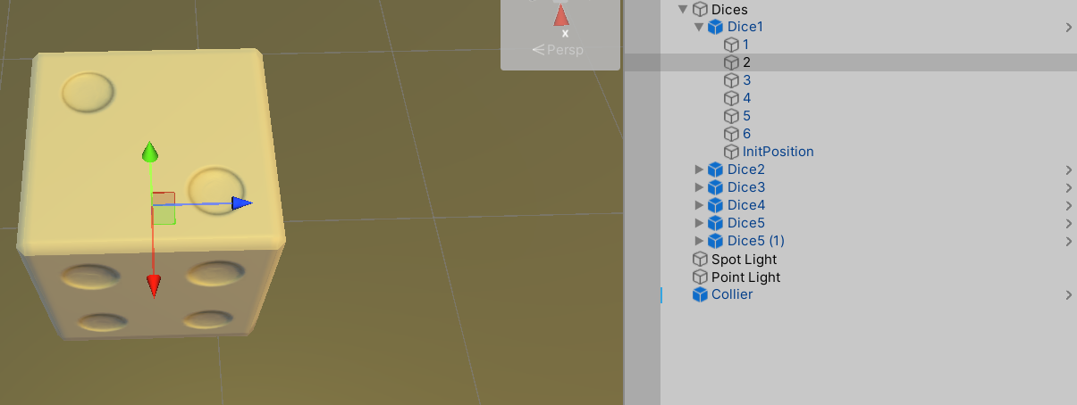 1.预先创建六个子空对象代表1~6六个面,并将它们向上方向依依旋转成其对应面方向。