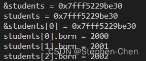 Student students[128]; printf("&students = %p\n", &students); printf("students = %p\n", students); printf("&students[0] = %p\n", &students[0]); Student * p = students; p[0].born = 2000; p[1].born = 2001; p[2].born = 2002; printf("students[0].born = %d\n", students[0].born); printf("students[1].born = %d\n", students[1].born); printf("students[2].born = %d\n", students[2].born);