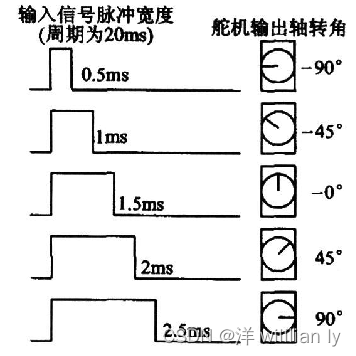 控制原理:输出周期为20ms的pwm波,控制不同的占空比,实现不同转动角的控制;