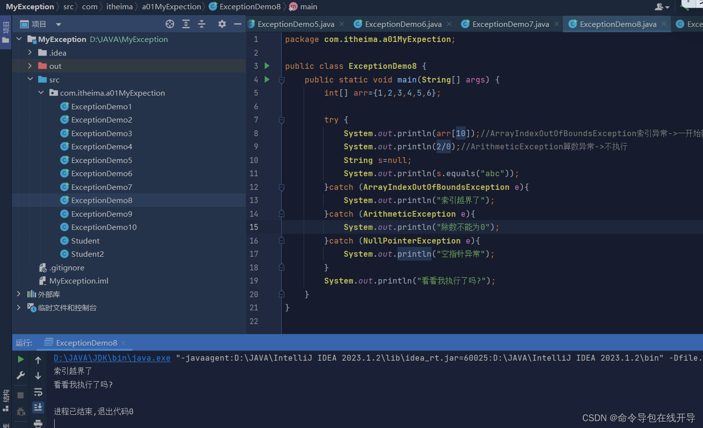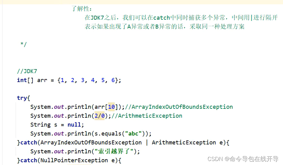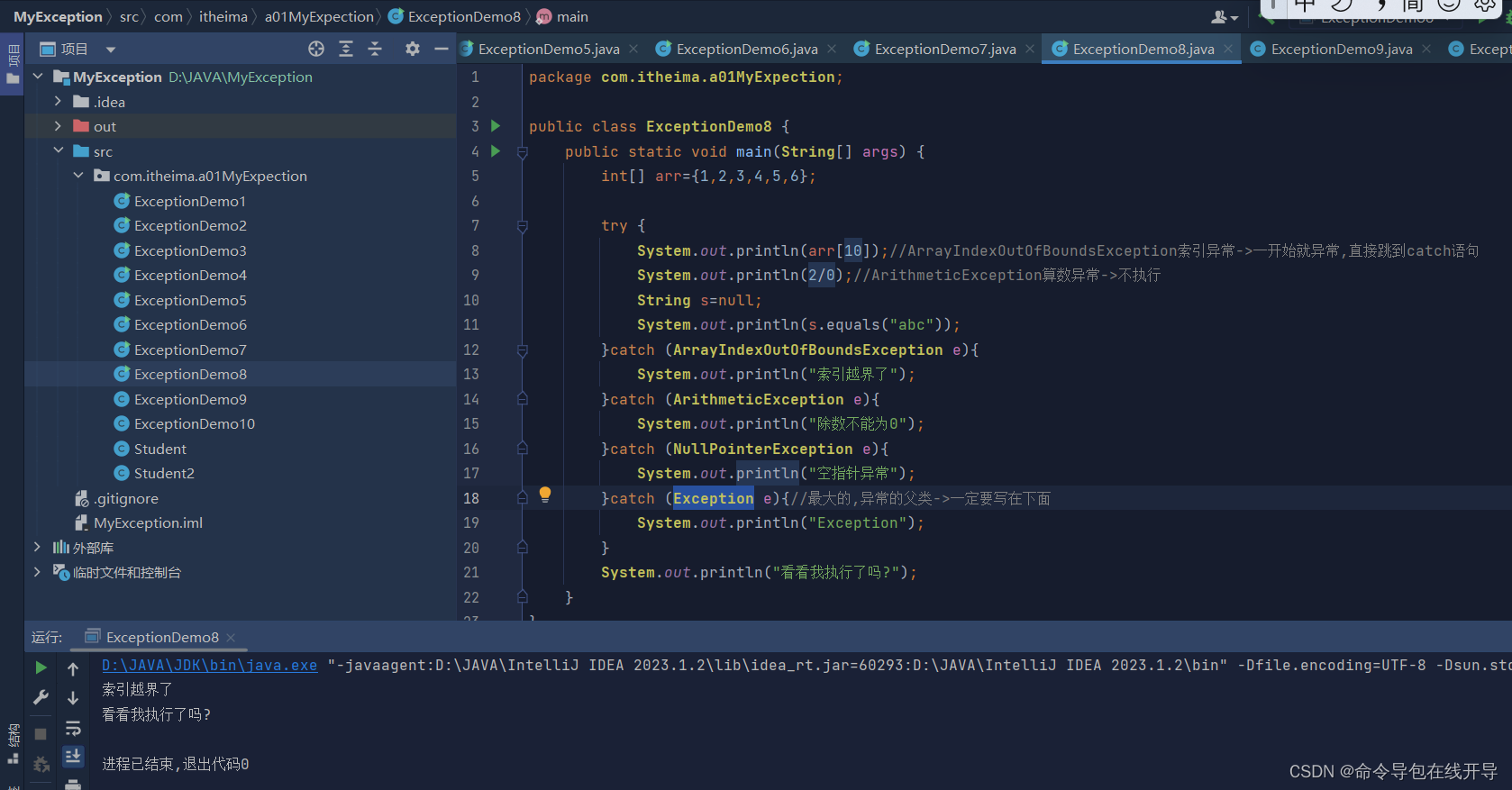 细节:如果我们要捕获多个异常,这些异常中如果存在父子关系的话,那么父类(Exception最大的异常)一定要写在最下面。**