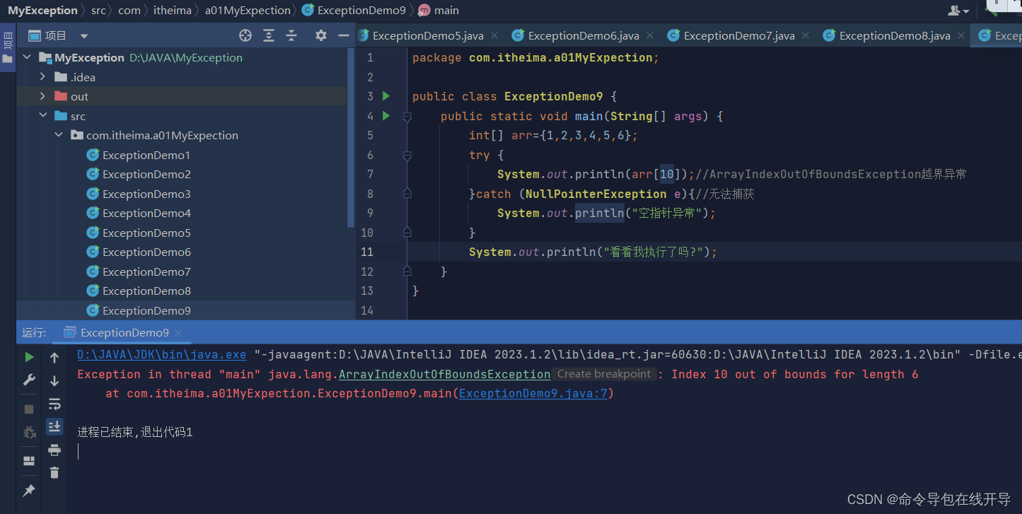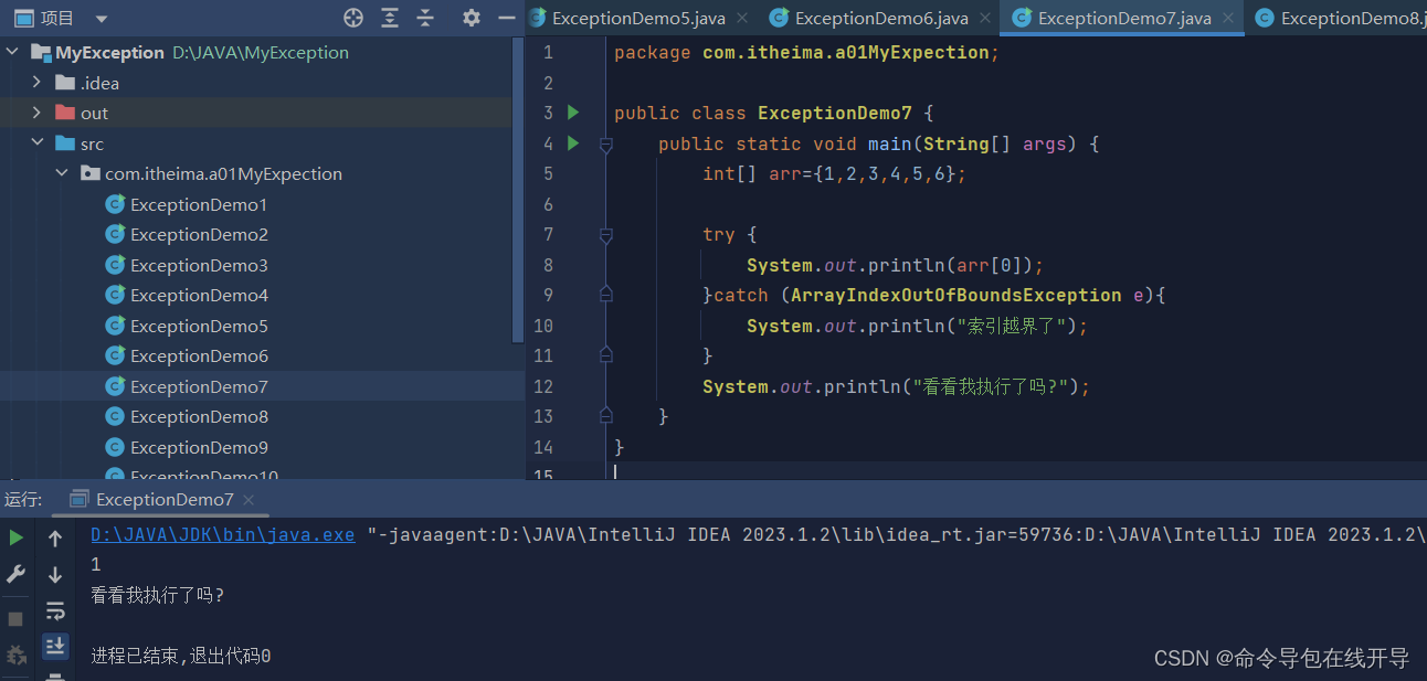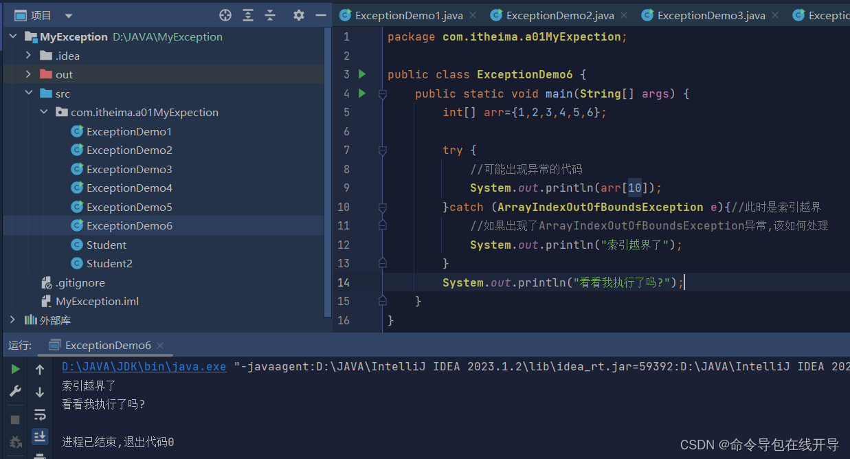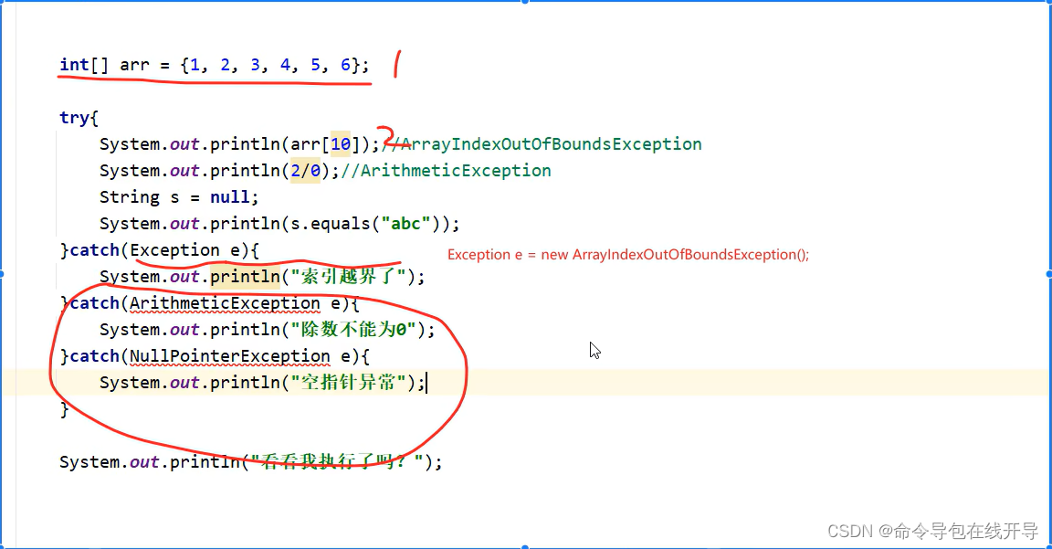 细节:如果我们要捕获多个异常,这些异常中如果存在父子关系的话,那么父类(Exception最大的异常)一定要写在最下面。**