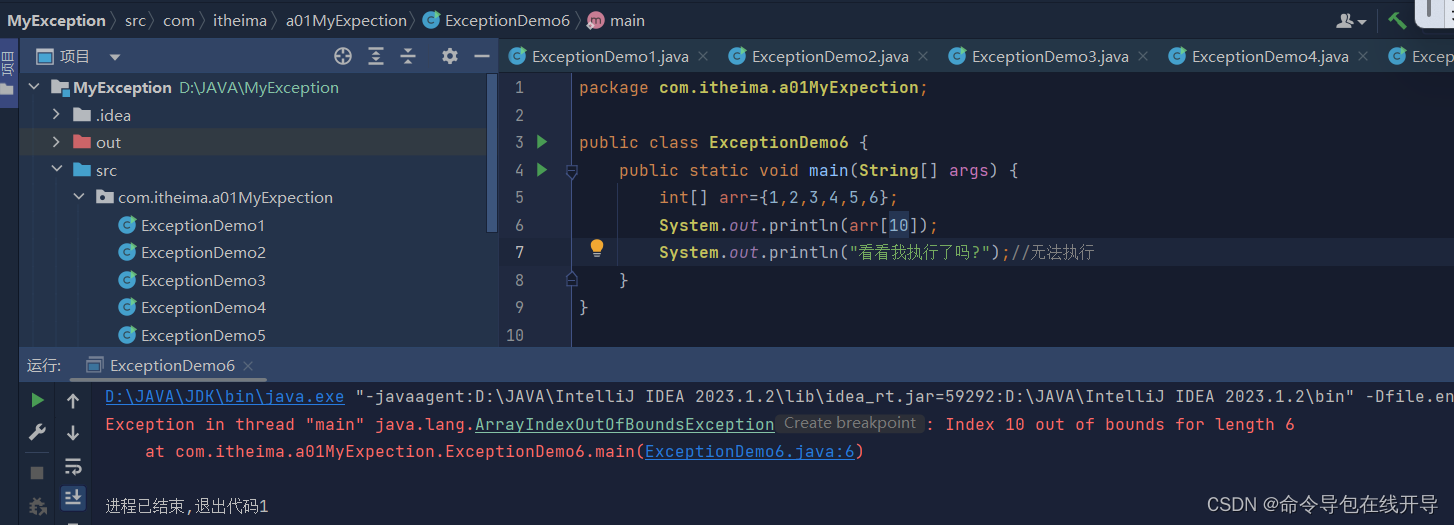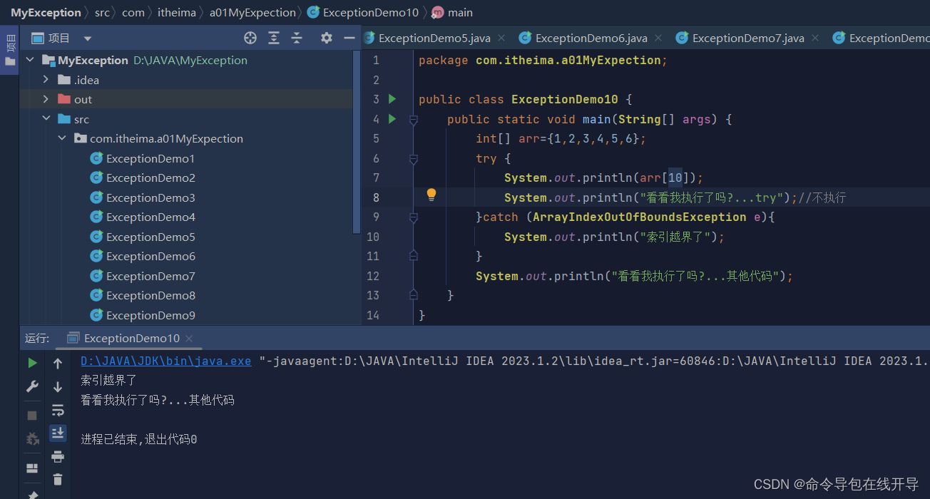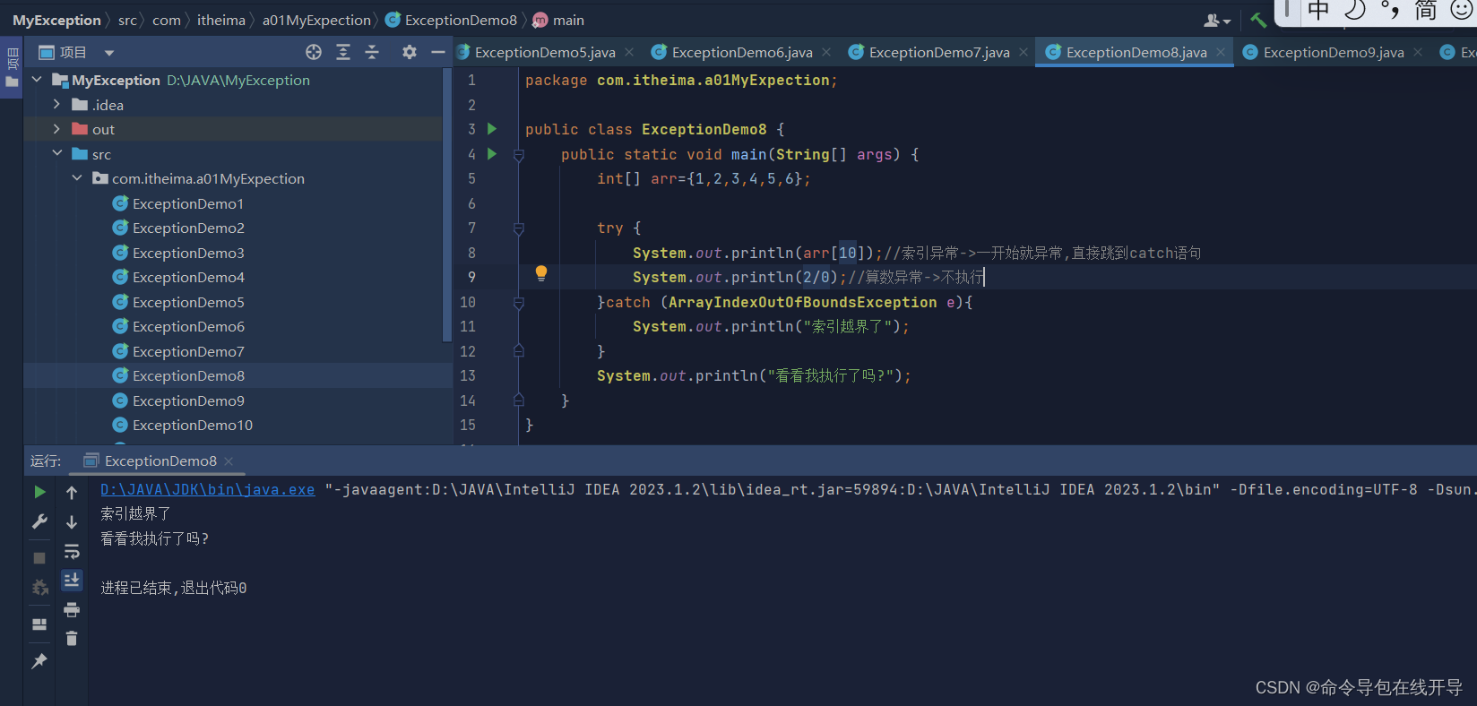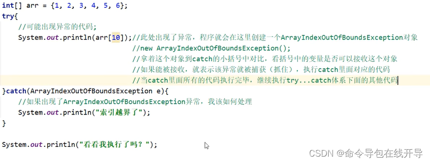 下面的代码就不会执行了,try中遇到的问题直接跳转到对应的catch语句当中,执行catch里面的语句体
