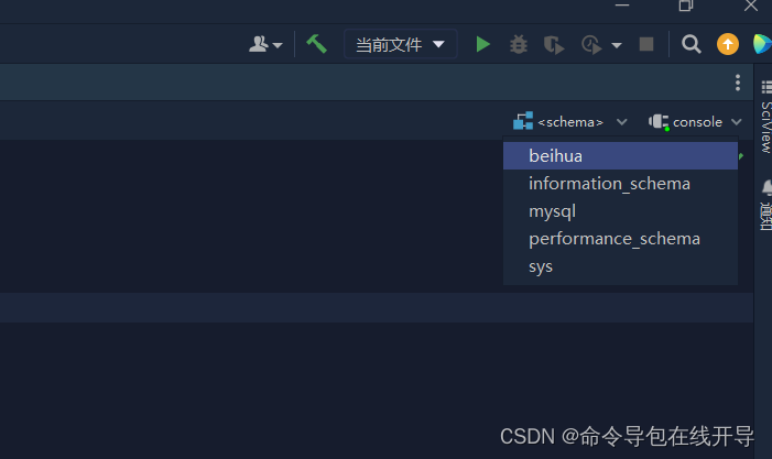 法二:点击右上方架构这个图标->在下拉框中选择要使用的数据库即可。