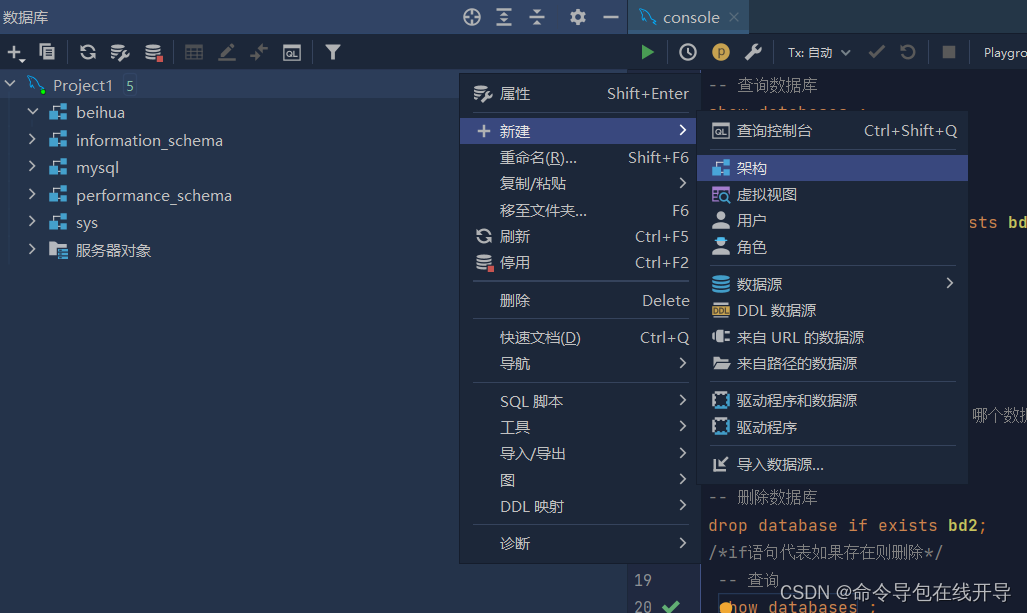法二:点左上角加(+)号下面的那一条->新建->架构(英译为Schema)->命名->创建即可。
