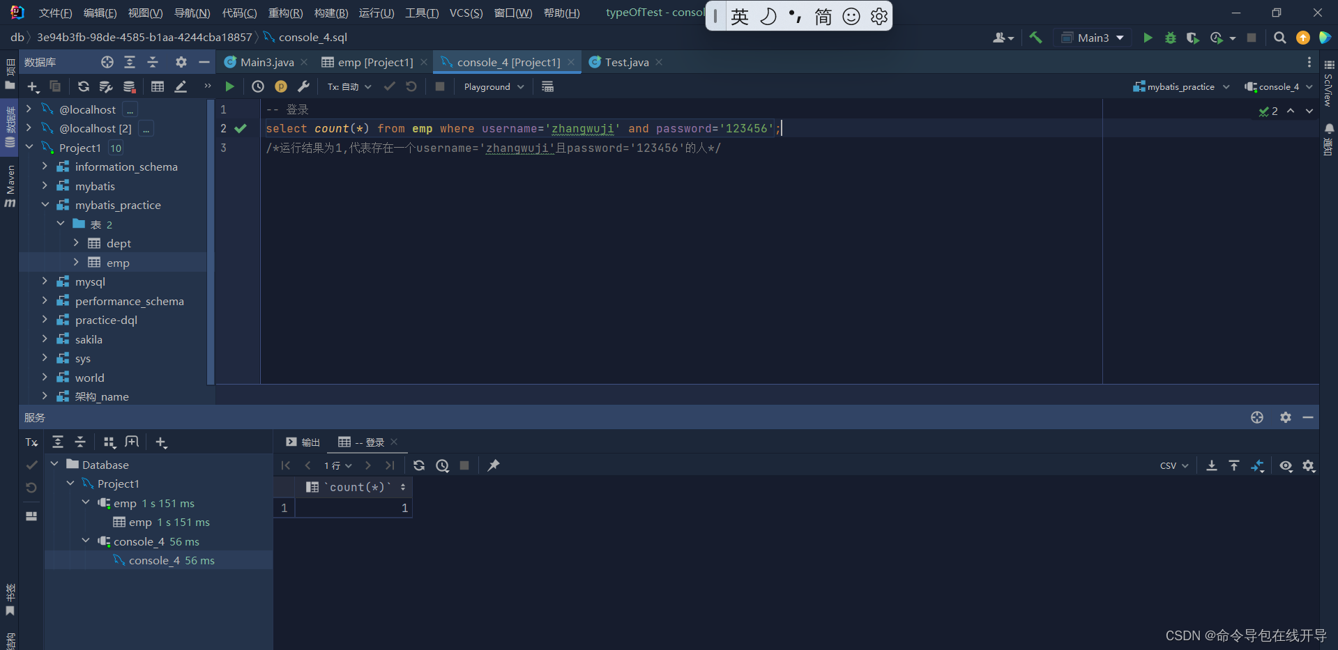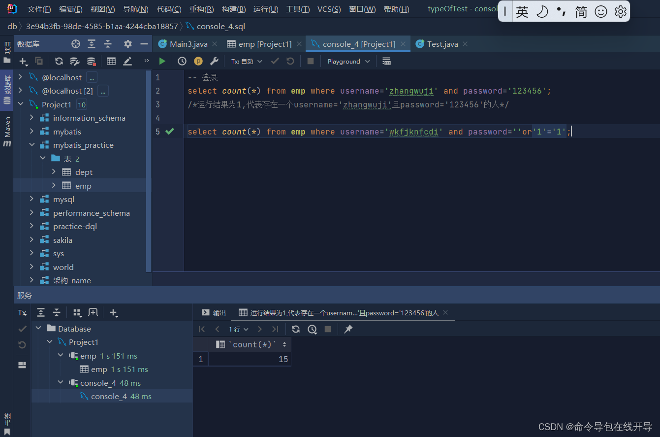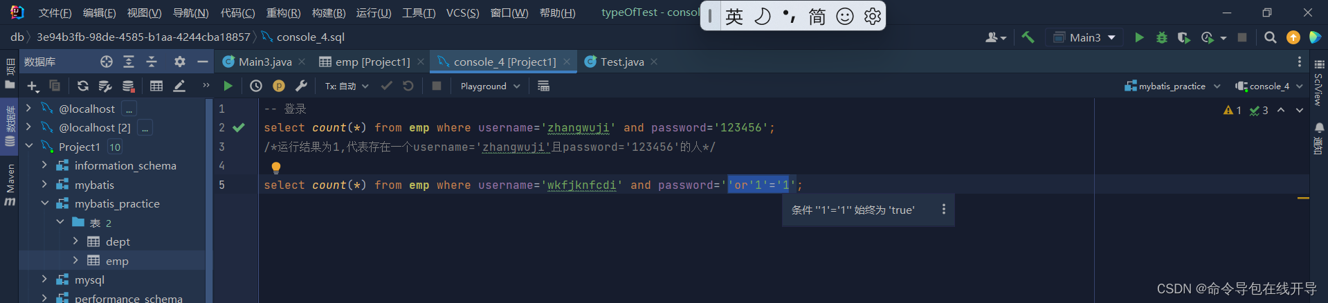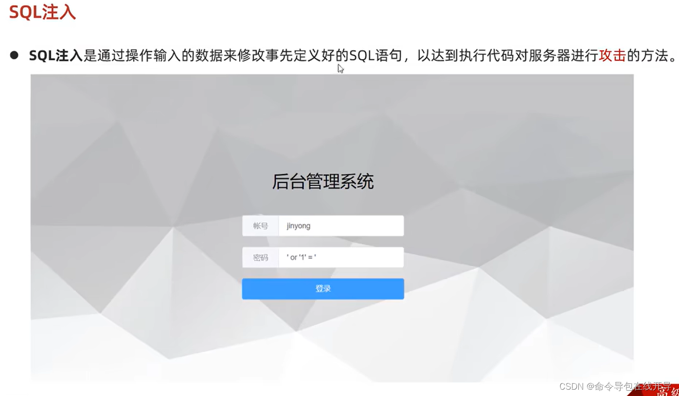 此时条件始终为true,用户名怎么输都是对的,密码输入'or'1'='1-->运行结果就是所有用户都被查询出来