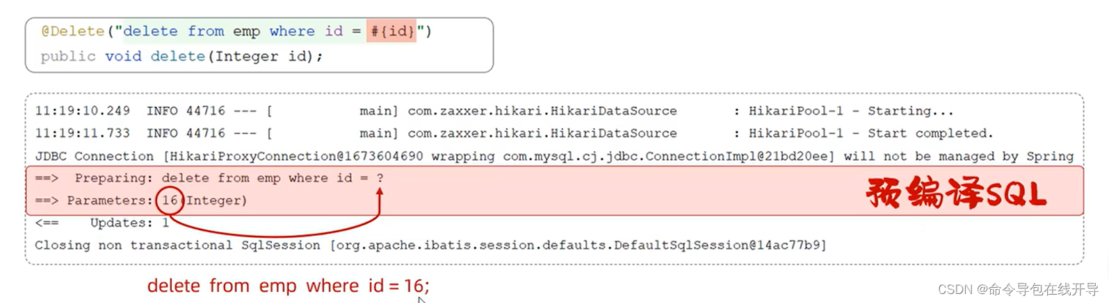 -->#{参数名称}这个占位符最终生成的就是预编译SQL