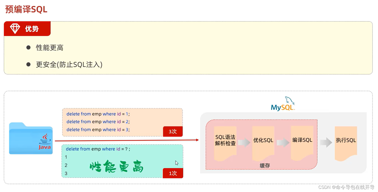 第二个参数占位符在运行时不会被?替代,而是直接拼接:此时不是预编译SQL-->性能低,也可能被攻击