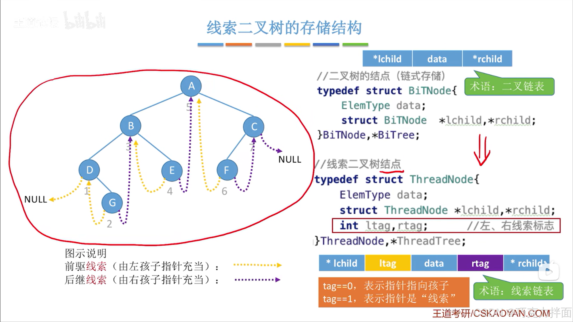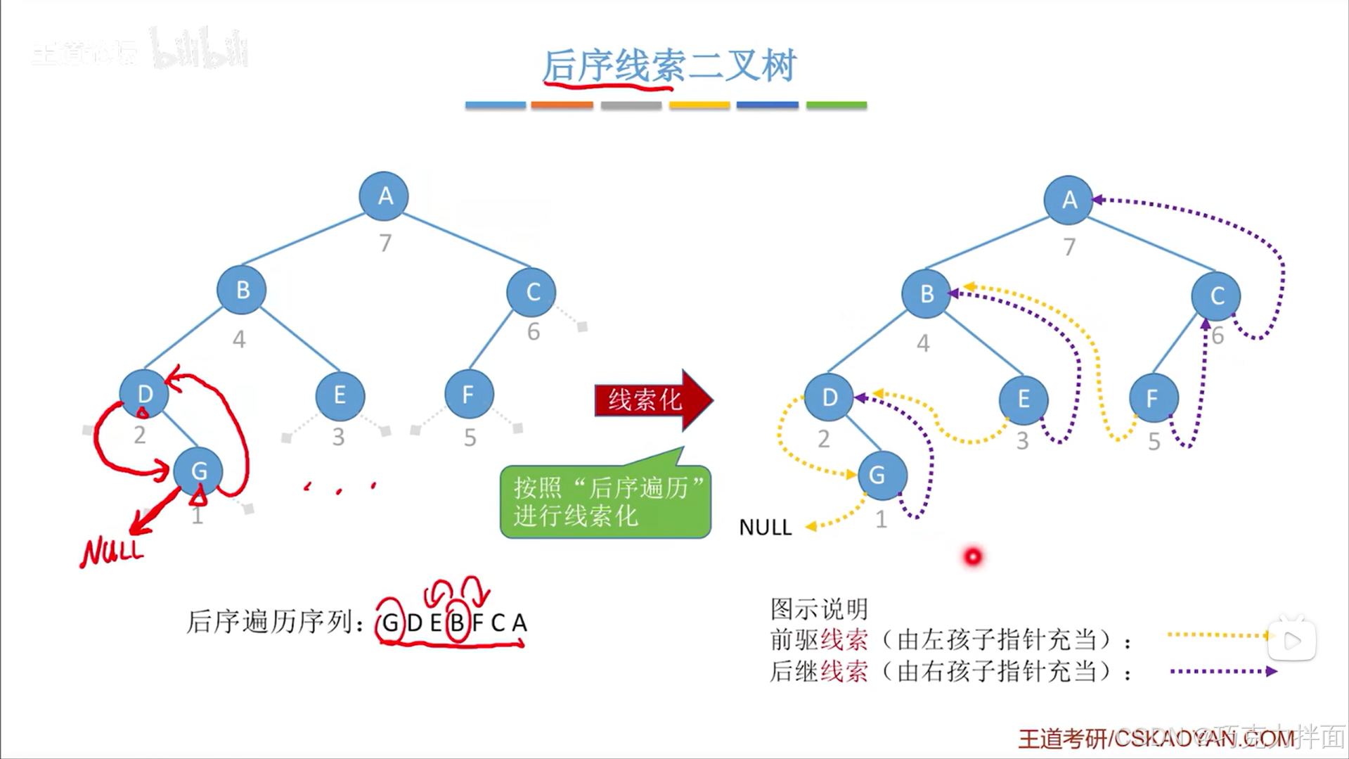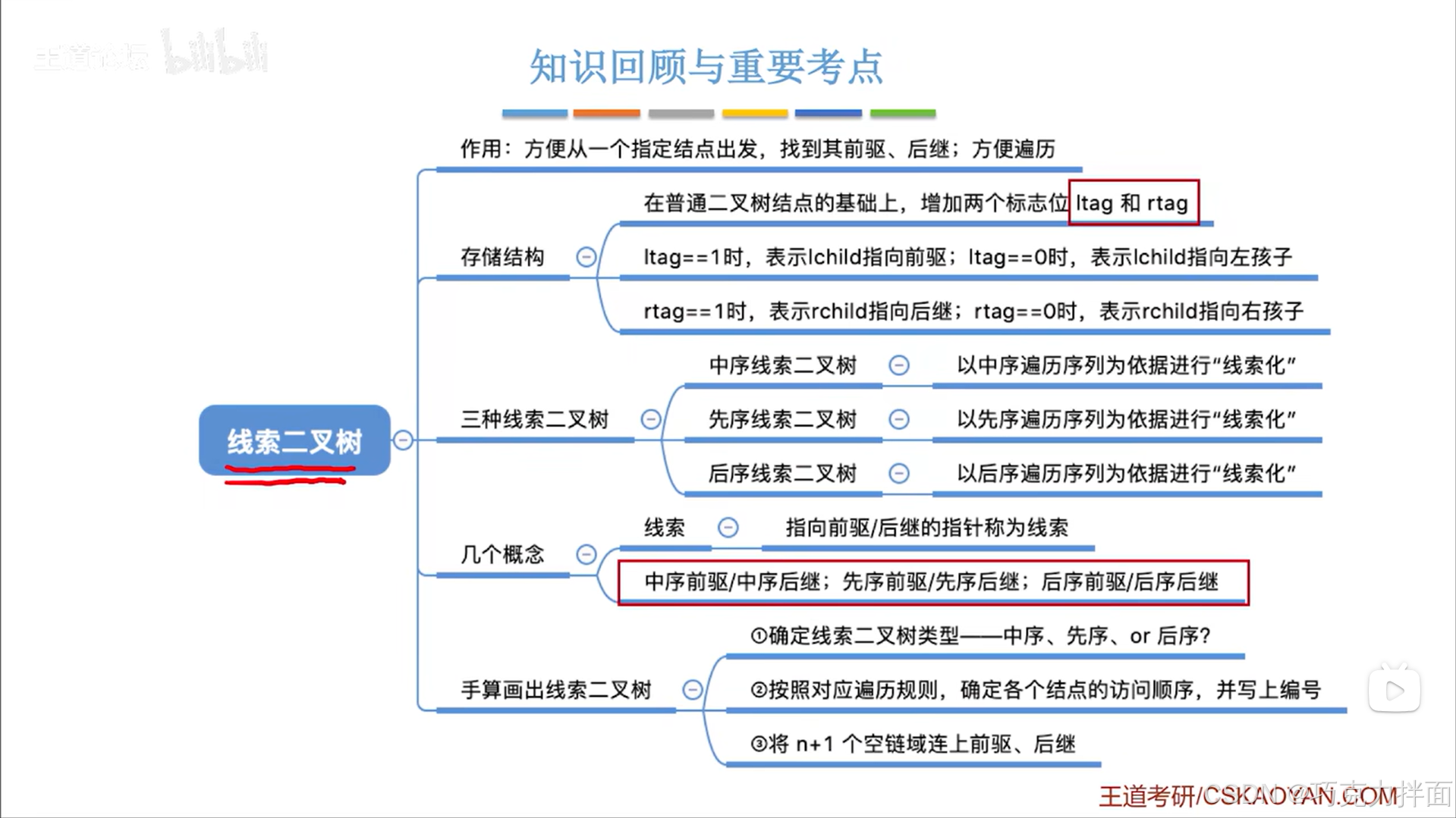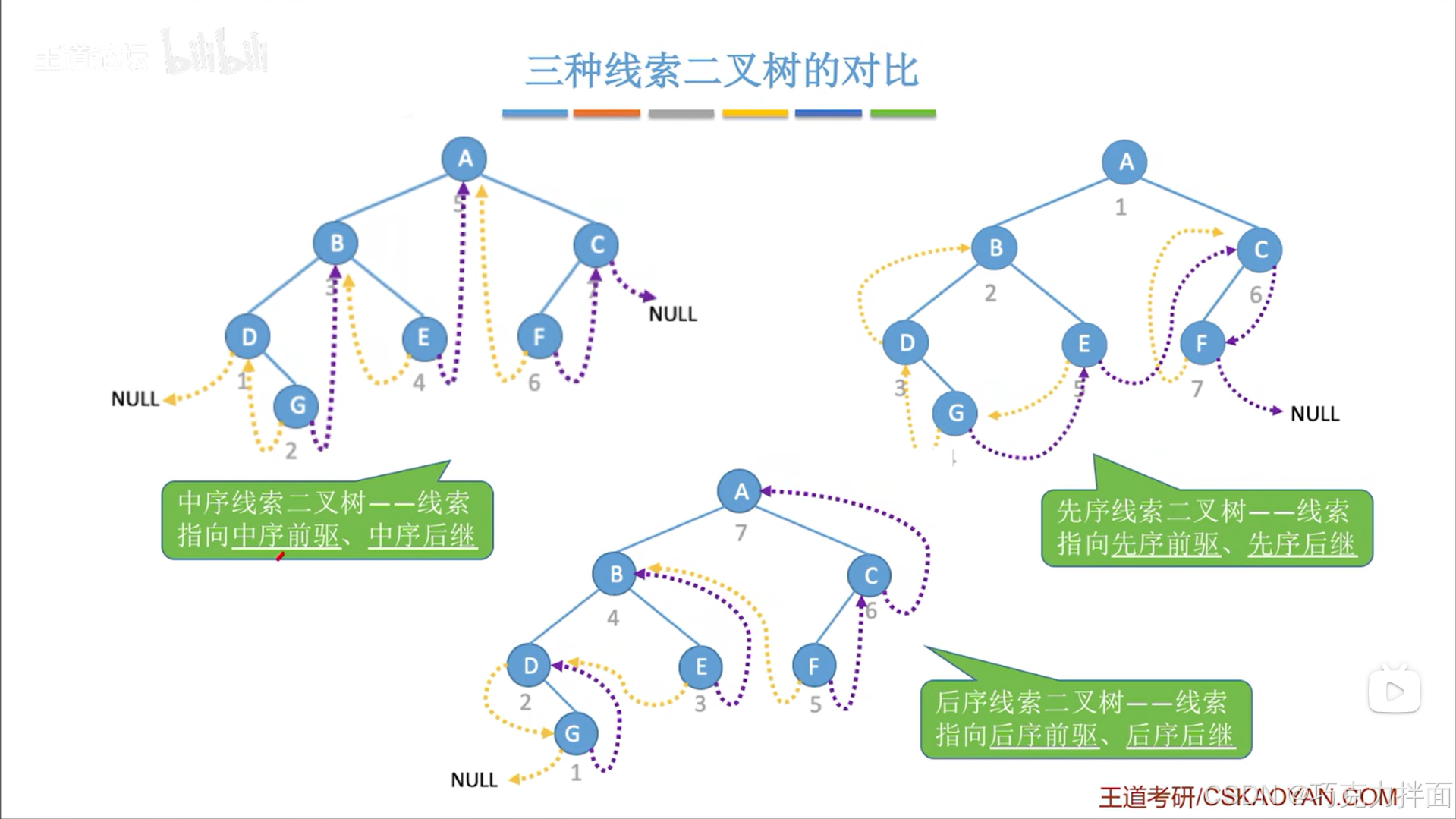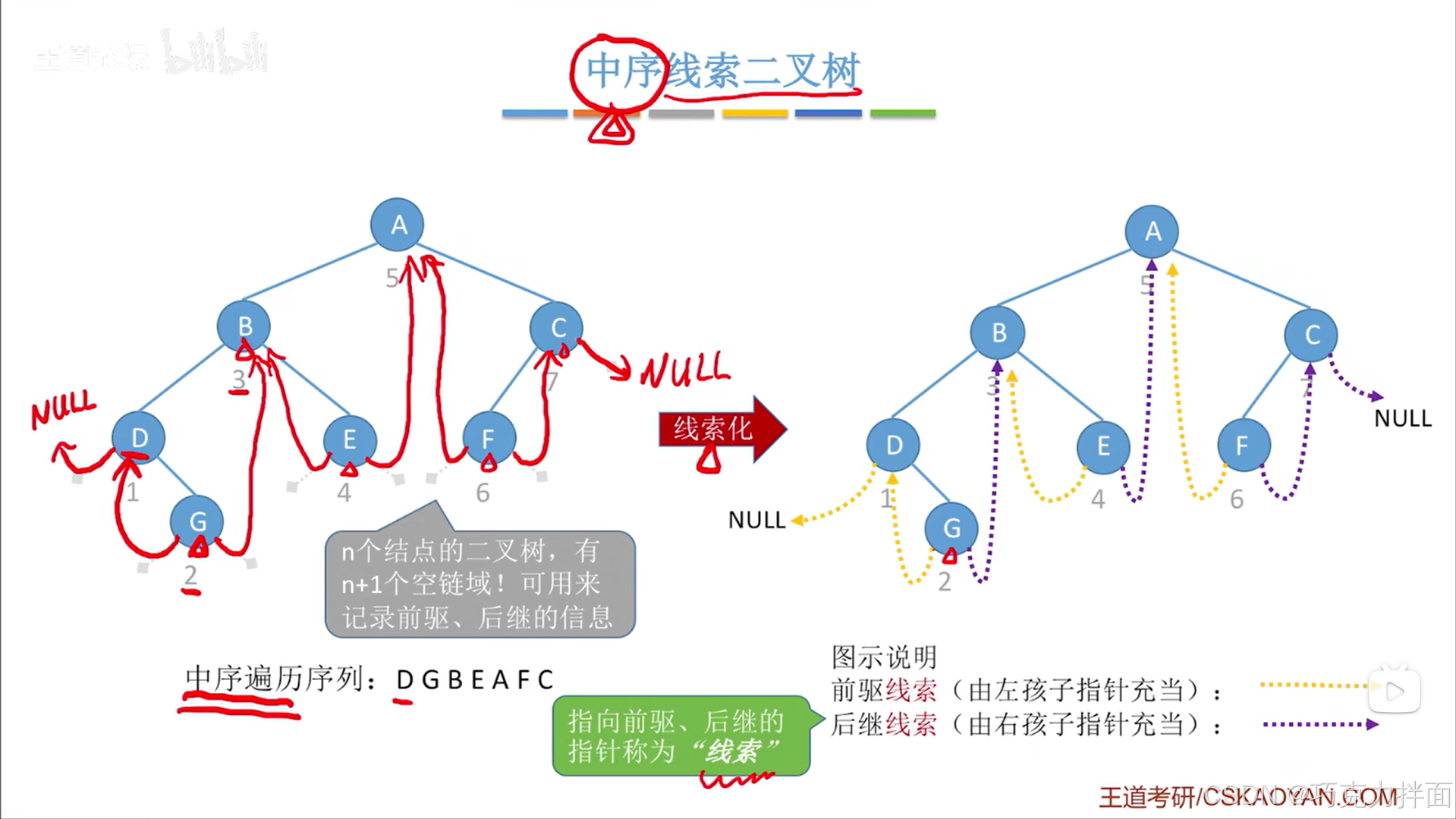 静态链表示意图:2.2 顺序表与链表的比较存储密度比较:顺序表:只存储数据元素、预分配存储空间链表:指针的结构性开销、链表中的元素个数没有限制按位查找:顺序表:O(1),随机存取链表:O(n),顺序存取插入和删除:顺序表:O(n),平均移动表长一半的元素链表:不用移动元素,合适位置的指针——O(1)时间复杂度:顺序表:若线性表频繁查找却很少进行插入和删除操作链表:若线性表需频繁插入和删除时空间复杂度:顺序表:知道线性表的大致长度,空间效率会更高链表:若线性表中元素个数变化较大或者未知2.3 栈 定义:限定仅在一端(栈顶)进行插入和删除操作的线性表,后进先出。栈示意图: 时间复杂度(插入与删除):顺序栈与链栈均为O(1) 空间复杂度:链栈多一个指针域,结构性开销较大,使用过程中元素个数变化较大时,用链栈;反之顺序栈。 出栈元素不同排列的个数: (卡特兰数) 共享栈: 两个栈共享一片内存空间, 两个栈从两边往中间增长。卡特兰数的应用:存储结构:顺序栈初始化:top=-1链栈初始化:top=NULL栈的应用: 1) 括号匹配 2) 递归 3) 中缀表达式 转 后缀表达式 4) 中缀表达式:设两个栈(数据栈和运算符栈),根据运算符栈的优先级进行运算。2.4 队列 定义: 只允许在一端插入, 在另一端删除。具有先进先出的特点。队列示意图: 时间复杂度:均为O(1) 空间复杂度:链队列多一个指针域,结构性开销较大;循环队列存在浪费空间和溢出问题。使用过程中元素个数变化较大时,用链队列;反之循环队列。 双端队列: 只允许从两端插入、两端删除的线性表。双端队列示意图: 存储结构: 链队列:队头指针指向队头元素的前一个位置,队尾指针指向队尾元素,先进先出。 循环队列: 1)队空:front=rear 2)队满:(rear+1)%QueueSize=front 3)队列元素个数:(队尾-队头+队长)%队长==(rear-front+QueueSize)%QueueSize队列的应用: 1) 树的层次遍历 2) 图的广度优先遍历2.4 数组与特殊矩阵一维数组的存储结构:二维数组的存储结构: 对称矩阵的压缩(行优先):下三角矩阵的压缩(行优先): 上三角(行优先):三对角矩阵的压缩(行优先):稀疏矩阵压缩:十字链表法压缩稀疏矩阵:2.5 串 串,即字符串(String)是由零个或多个字符组成的有限序列。串是一种特殊的线性表,数据元素之间呈线性关系。字符串模式匹配: 1)朴素模式匹配算法 2)KMP算法手算KMP的next数组示意图:求next[2] :求next[3]: 求next[4]: 求next[5]: C语言求KMP的next数组代码示例:void Createnext(char *sub, int *next){ assert(sub != NULL && next != NULL); int j = 2; //模式串的next指针 int k = 0; //next数组的回溯值,初始化为next[1]=0 int lenSub = strlen(sub); assert(lenSub != 0); next[0] = -1; next[1] = 0; while (j < lenSub){ if (sub[j-1] == sub[k]){ next[j] = ++k; j++; } else{ k = next[k]; if (k == -1){ k = 0; next[j] = k; j++; } } }}求nextValue:void nextValue(char *sub, int *next) { int lenSub = strlen(sub); for(int j=2;j<lensub; j++){ if(sub[j]==sub[next[j]]) next[j]=next[next[j]] }}备注: 1) 实现next有多种不同方式, 对应不同的next数组使用 2) 根据实现方式不同, next数组整体+1不影响KMP算法。第三章 树和二叉树3.1 树和森林 定义(树):n(n≥0)个结点(数据元素)的有限集合,当 n=0 时,称为空树。3.1.1 树的基本术语 结点的度:结点所拥有的子树的个数。 叶子结点:度为 0 的结点,也称为终端结点。 分支结点:度不为 0 的结点,也称为非终端结点。 孩子:树中某结点子树的根结点称为这个结点的孩子结点。 双亲:这个结点称为它孩子结点的双亲结点。 兄弟:具有同一个双亲的孩子结点互称为兄弟。 路径:结点序列 n1, n2, …, nk 称为一条由 n1 至 nk 的路径,当且仅当满足结点 ni 是 ni+1 的双亲(1<=i<k)的关系。 路径长度:路径上经过的边的个数。 祖先、子孙:如果有一条路径从结点 x 到结点 y,则 x 称为 y 的祖先,而 y 称为 x 的子孙。 结点所在层数:根结点的层数为 1;对其余结点,若某结点在第 k 层,则其孩子结点在第 k+1 层。 树的深度(高度):树中所有结点的最大层数。 树的宽度:树中每一层结点个数的最大值。 树的度:树中各结点度的最大值。 树的路径长度: 从根到每个结点的路径长度总和 备注: 在线性结构中,逻辑关系表现为前驱——后继,一对一; 在树结构中,逻辑关系表现为双亲——孩子,一对多。 森林: 森林是m(m≥0)棵互不相交的树的集合, m可为0, 即空森林。3.1.2 树的性质 结点数=总度数+1 度为m的树第 i 层至多有 个结点(i≥1) 高度为h的m叉树至多有 个结点 具有n个结点的m叉树的最小高度为 最小高度推理过程图:3.1.3 树与森林的遍历树的遍历:先根遍历(先根后子树)后根遍历(先子树后根)层序遍历森林的遍历:前序遍历(先根, 后子树)中序遍历(先子树后根, 其实就是后序遍历树)区别与联系: 1) 树的前序遍历等价于其树转化二叉树的前序遍历! 2) 树的后序遍历等价于其树转化二叉树的中序遍历!3.1.4 树的存储结构双亲表示法图:孩子表示法图:孩子兄弟表示法图(树/森林转化为二叉树):3.1.5 树转二叉树在树转为二叉树后, 有以下结论: 1) 树的叶子结点数量 = 二叉树左空指针数量(形象理解为树越宽, 兄弟越多, 越是向右长) 2) 树的非叶子结点数量 = 二叉树右空指针-1(非叶子必有儿子, 右指针由儿子提供, -1是根节点多了一个右空指针)3.2 二叉树3.2.1 二叉树的性质斜树:左斜树:所有结点都只有左子树的二叉树右斜树:所有结点都只有右子树的二叉树 满二叉树:所有分支结点都存在左子树和右子树,且