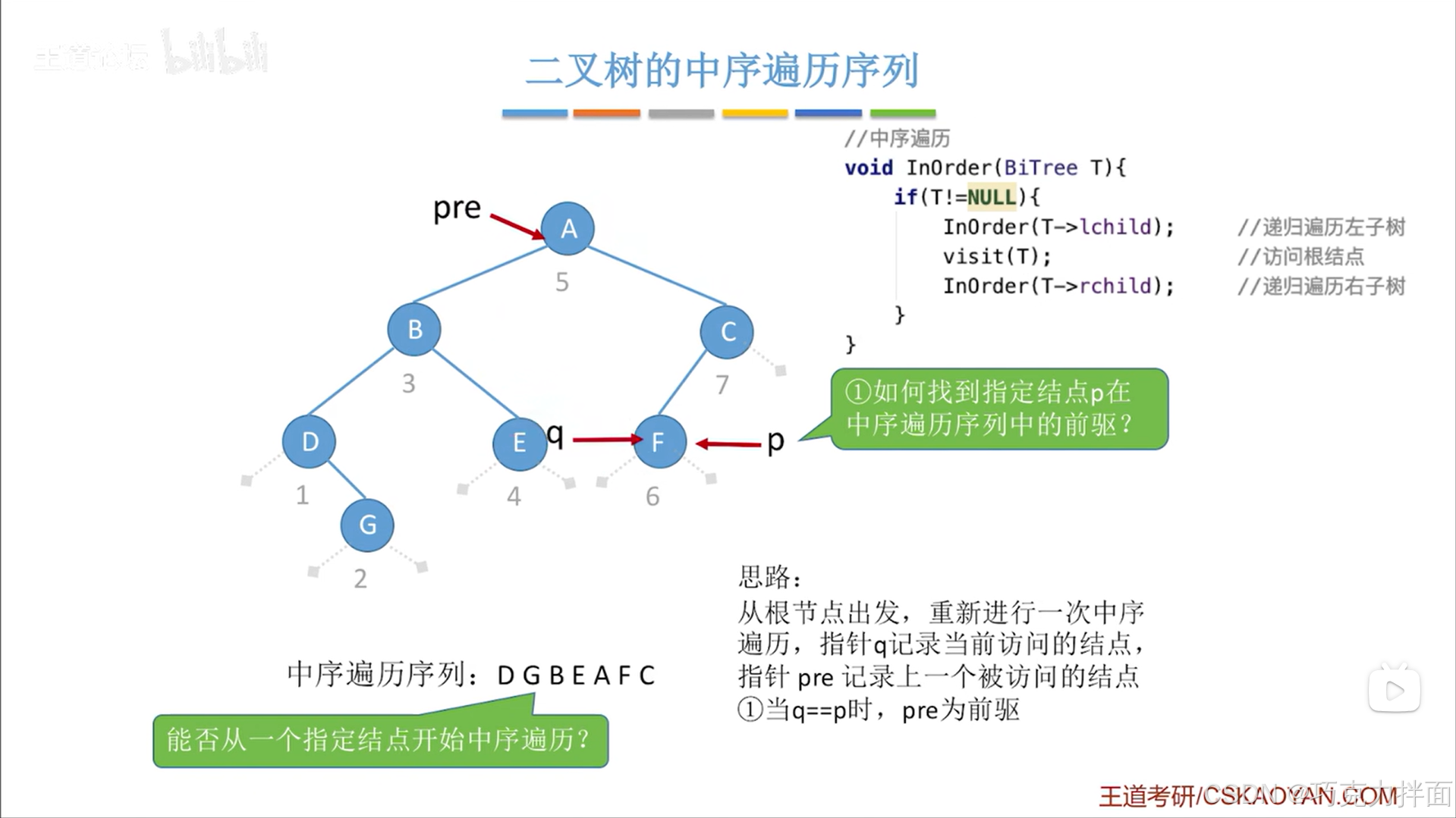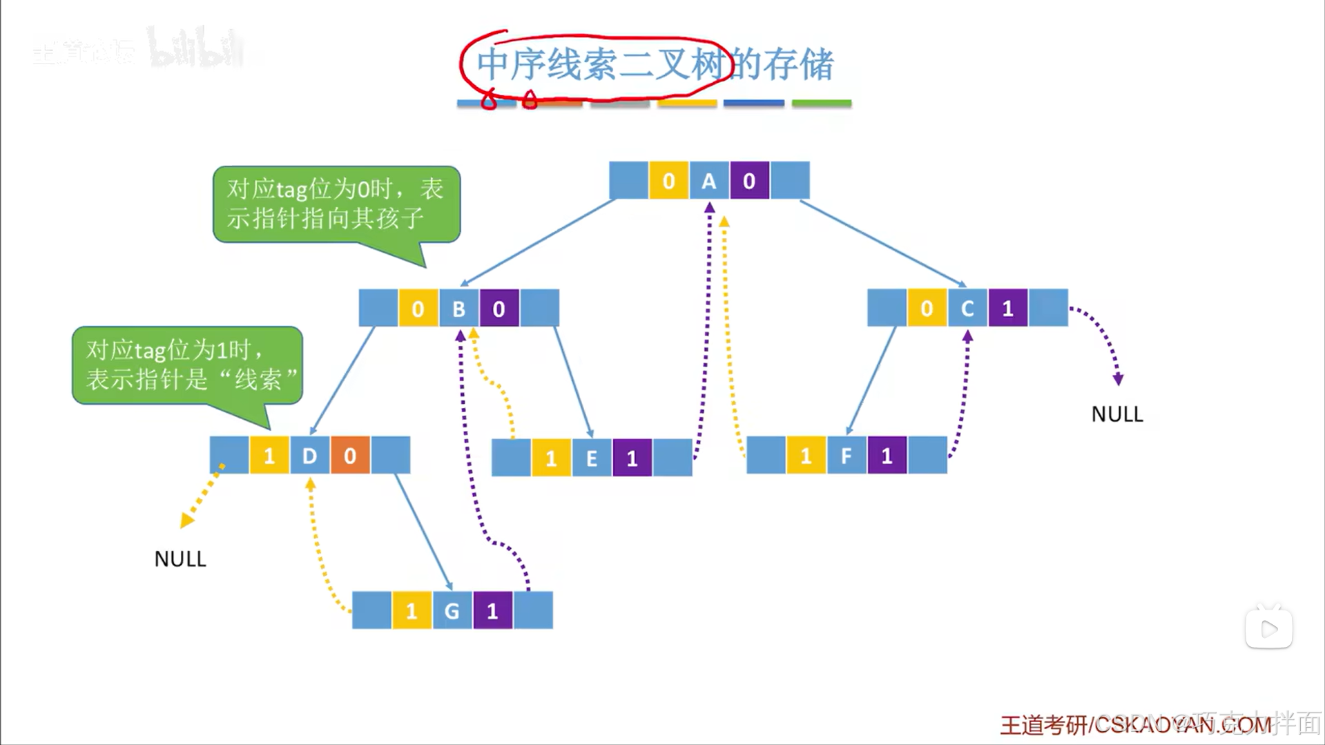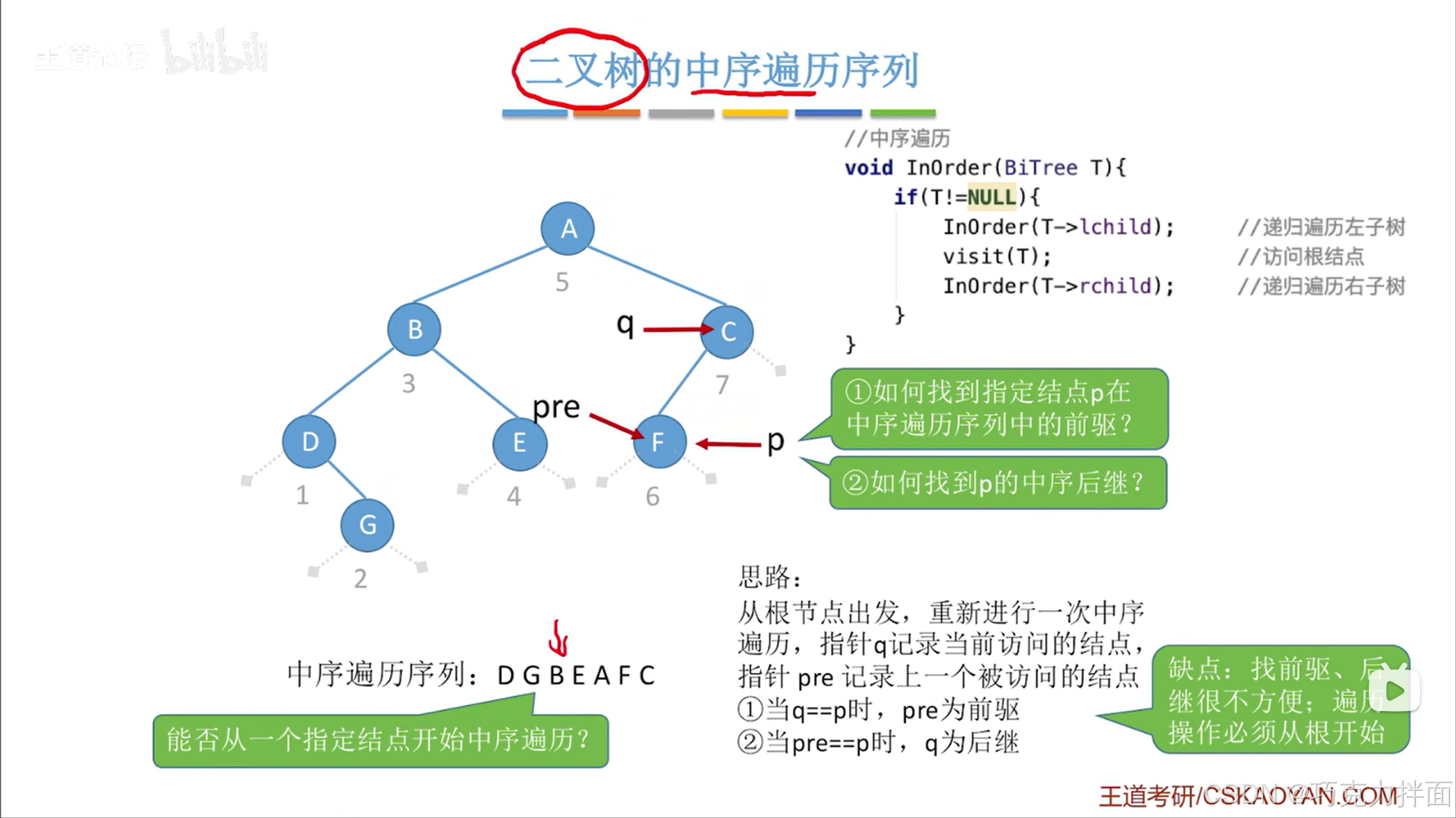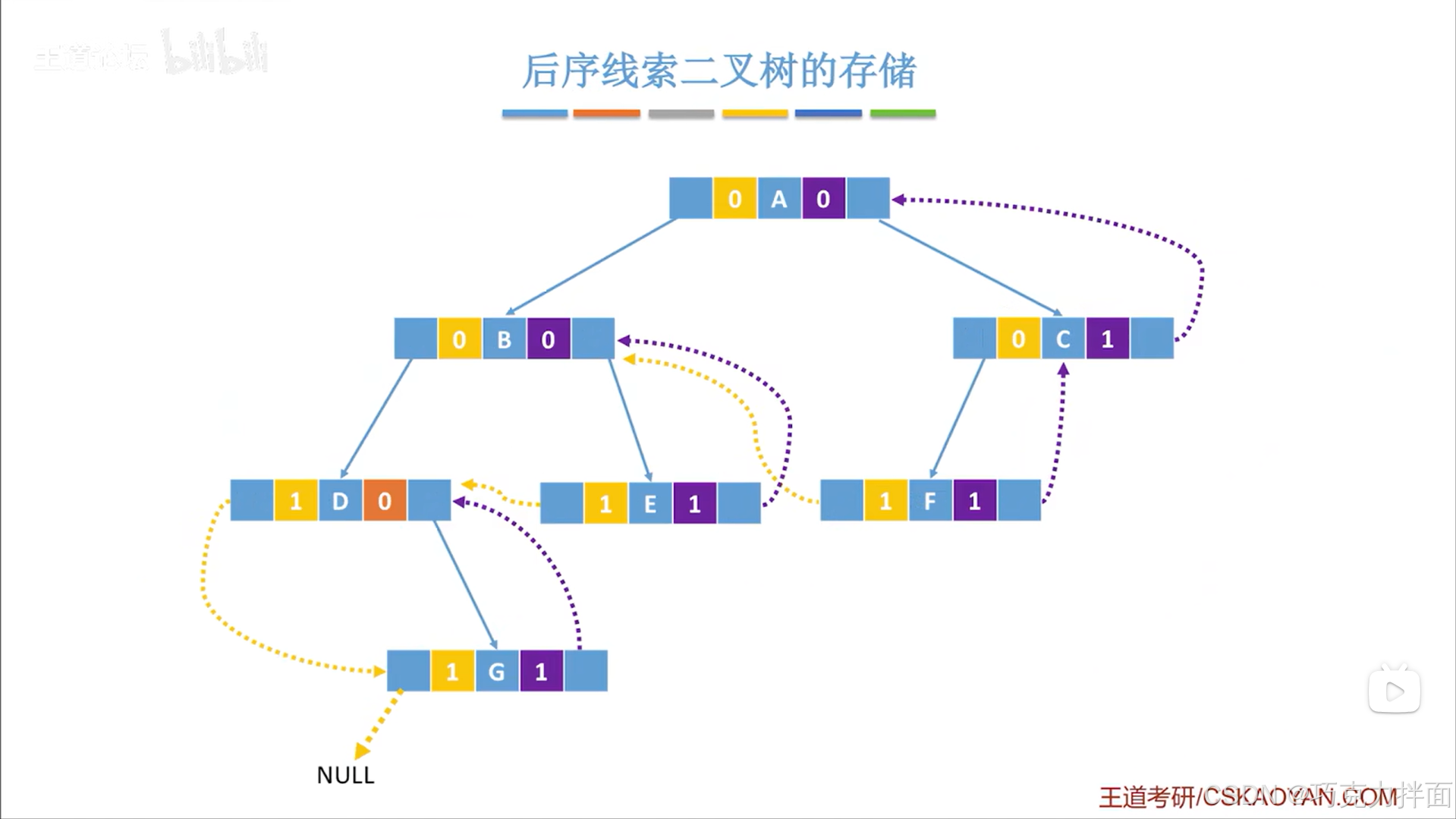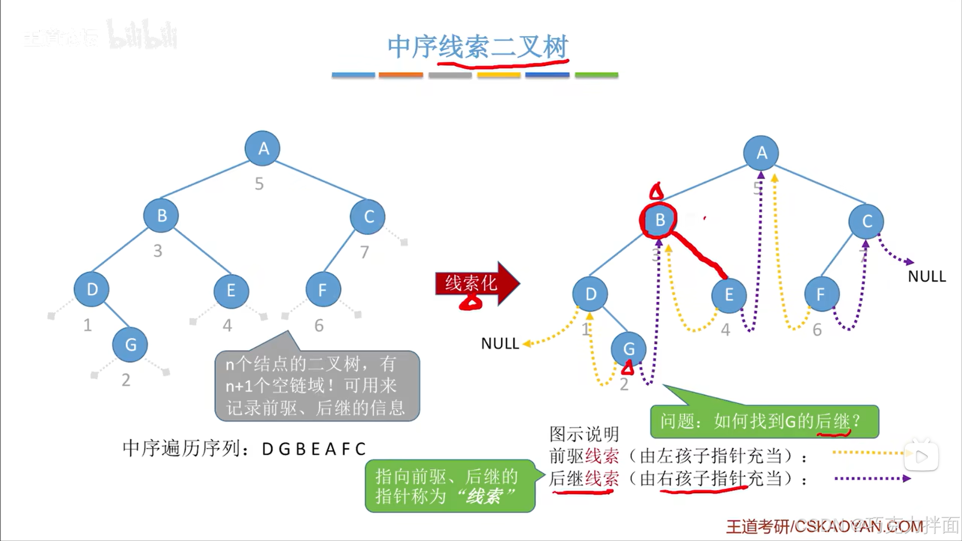 静态链表示意图:2.2 顺序表与链表的比较存储密度比较:顺序表:只存储数据元素、预分配存储空间链表:指针的结构性开销、链表中的元素个数没有限制按位查找:顺序表:O(1),随机存取链表:O(n),顺序存取插入和删除:顺序表:O(n),平均移动表长一半的元素链表:不用移动元素,合适位置的指针——O(1)时间复杂度:顺序表:若线性表频繁查找却很少进行插入和删除操作链表:若线性表需频繁插入和删除时空间复杂度:顺序表:知道线性表的大致长度,空间效率会更高链表:若线性表中元素个数变化较大或者未知2.3 栈 定义:限定仅在一端(栈顶)进行插入和删除操作的线性表,后进先出。栈示意图: 时间复杂度(插入与删除):顺序栈与链栈均为O(1) 空间复杂度:链栈多一个指针域,结构性开销较大,使用过程中元素个数变化较大时,用链栈;反之顺序栈。 出栈元素不同排列的个数: (卡特兰数) 共享栈: 两个栈共享一片内存空间, 两个栈从两边往中间增长。卡特兰数的应用:存储结构:顺序栈初始化:top=-1链栈初始化:top=NULL栈的应用: 1) 括号匹配 2) 递归 3) 中缀表达式 转 后缀表达式 4) 中缀表达式:设两个栈(数据栈和运算符栈),根据运算符栈的优先级进行运算。2.4 队列 定义: 只允许在一端插入, 在另一端删除。具有先进先出的特点。队列示意图: 时间复杂度:均为O(1) 空间复杂度:链队列多一个指针域,结构性开销较大;循环队列存在浪费空间和溢出问题。使用过程中元素个数变化较大时,用链队列;反之循环队列。 双端队列: 只允许从两端插入、两端删除的线性表。双端队列示意图: 存储结构: 链队列:队头指针指向队头元素的前一个位置,队尾指针指向队尾元素,先进先出。 循环队列: 1)队空:front=rear 2)队满:(rear+1)%QueueSize=front 3)队列元素个数:(队尾-队头+队长)%队长==(rear-front+QueueSize)%QueueSize队列的应用: 1) 树的层次遍历 2) 图的广度优先遍历2.4 数组与特殊矩阵一维数组的存储结构:二维数组的存储结构: 对称矩阵的压缩(行优先):下三角矩阵的压缩(行优先): 上三角(行优先):三对角矩阵的压缩(行优先):稀疏矩阵压缩:十字链表法压缩稀疏矩阵:2.5 串 串,即字符串(String)是由零个或多个字符组成的有限序列。串是一种特殊的线性表,数据元素之间呈线性关系。字符串模式匹配: 1)朴素模式匹配算法 2)KMP算法手算KMP的next数组示意图:求next[2] :求next[3]: 求next[4]: 求next[5]: C语言求KMP的next数组代码示例:void Createnext(char *sub, int *next){ assert(sub != NULL && next != NULL); int j = 2; //模式串的next指针 int k = 0; //next数组的回溯值,初始化为next[1]=0 int lenSub = strlen(sub); assert(lenSub != 0); next[0] = -1; next[1] = 0; while (j < lenSub){ if (sub[j-1] == sub[k]){ next[j] = ++k; j++; } else{ k = next[k]; if (k == -1){ k = 0; next[j] = k; j++; } } }}求nextValue:void nextValue(char *sub, int *next) { int lenSub = strlen(sub); for(int j=2;j<lensub; j++){ if(sub[j]==sub[next[j]]) next[j]=next[next[j]] }}备注: 1) 实现next有多种不同方式, 对应不同的next数组使用 2) 根据实现方式不同, next数组整体+1不影响KMP算法。第三章 树和二叉树3.1 树和森林 定义(树):n(n≥0)个结点(数据元素)的有限集合,当 n=0 时,称为空树。3.1.1 树的基本术语 结点的度:结点所拥有的子树的个数。 叶子结点:度为 0 的结点,也称为终端结点。 分支结点:度不为 0 的结点,也称为非终端结点。 孩子:树中某结点子树的根结点称为这个结点的孩子结点。 双亲:这个结点称为它孩子结点的双亲结点。 兄弟:具有同一个双亲的孩子结点互称为兄弟。 路径:结点序列 n1, n2, …, nk 称为一条由 n1 至 nk 的路径,当且仅当满足结点 ni 是 ni+1 的双亲(1<=i<k)的关系。 路径长度:路径上经过的边的个数。 祖先、子孙:如果有一条路径从结点 x 到结点 y,则 x 称为 y 的祖先,而 y 称为 x 的子孙。 结点所在层数:根结点的层数为 1;对其余结点,若某结点在第 k 层,则其孩子结点在第 k+1 层。 树的深度(高度):树中所有结点的最大层数。 树的宽度:树中每一层结点个数的最大值。 树的度:树中各结点度的最大值。 树的路径长度: 从根到每个结点的路径长度总和 备注: 在线性结构中,逻辑关系表现为前驱——后继,一对一; 在树结构中,逻辑关系表现为双亲——孩子,一对多。 森林: 森林是m(m≥0)棵互不相交的树的集合, m可为0, 即空森林。3.1.2 树的性质 结点数=总度数+1 度为m的树第 i 层至多有 个结点(i≥1) 高度为h的m叉树至多有 个结点 具有n个结点的m叉树的最小高度为 最小高度推理过程图:3.1.3 树与森林的遍历树的遍历:先根遍历(先根后子树)后根遍历(先子树后根)层序遍历森林的遍历:前序遍历(先根, 后子树)中序遍历(先子树后根, 其实就是后序遍历树)区别与联系: 1) 树的前序遍历等价于其树转化二叉树的前序遍历! 2) 树的后序遍历等价于其树转化二叉树的中序遍历!3.1.4 树的存储结构双亲表示法图:孩子表示法图:孩子兄弟表示法图(树/森林转化为二叉树):3.1.5 树转二叉树在树转为二叉树后, 有以下结论: 1) 树的叶子结点数量 = 二叉树左空指针数量(形象理解为树越宽, 兄弟越多, 越是向右长) 2) 树的非叶子结点数量 = 二叉树右空指针-1(非叶子必有儿子, 右指针由儿子提供, -1是根节点多了一个右空指针)3.2 二叉树3.2.1 二叉树的性质斜树:左斜树:所有结点都只有左子树的二叉树右斜树:所有结点都只有右子树的二叉树 满二叉树:所有分支结点都存在左子树和右子树,且