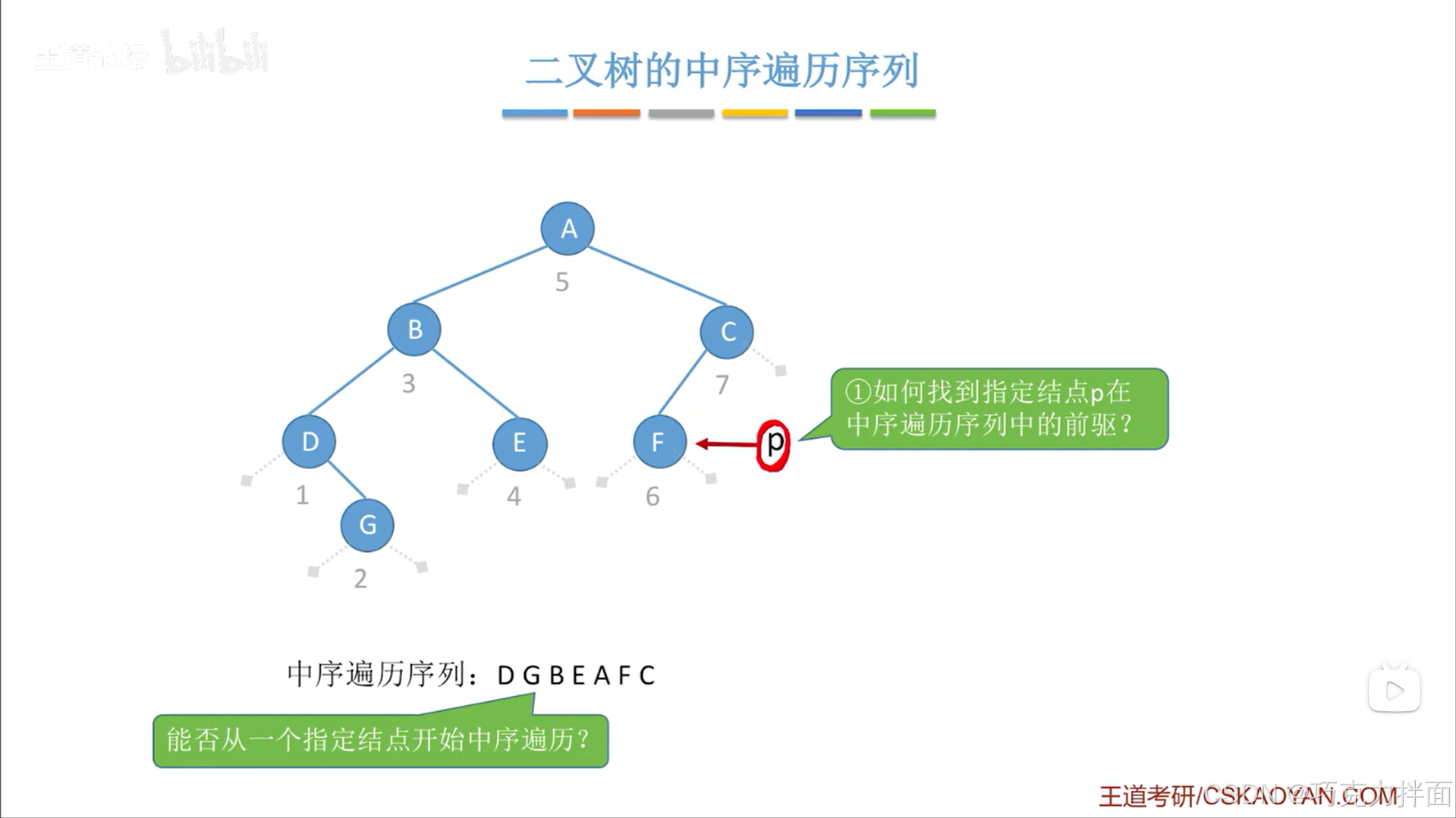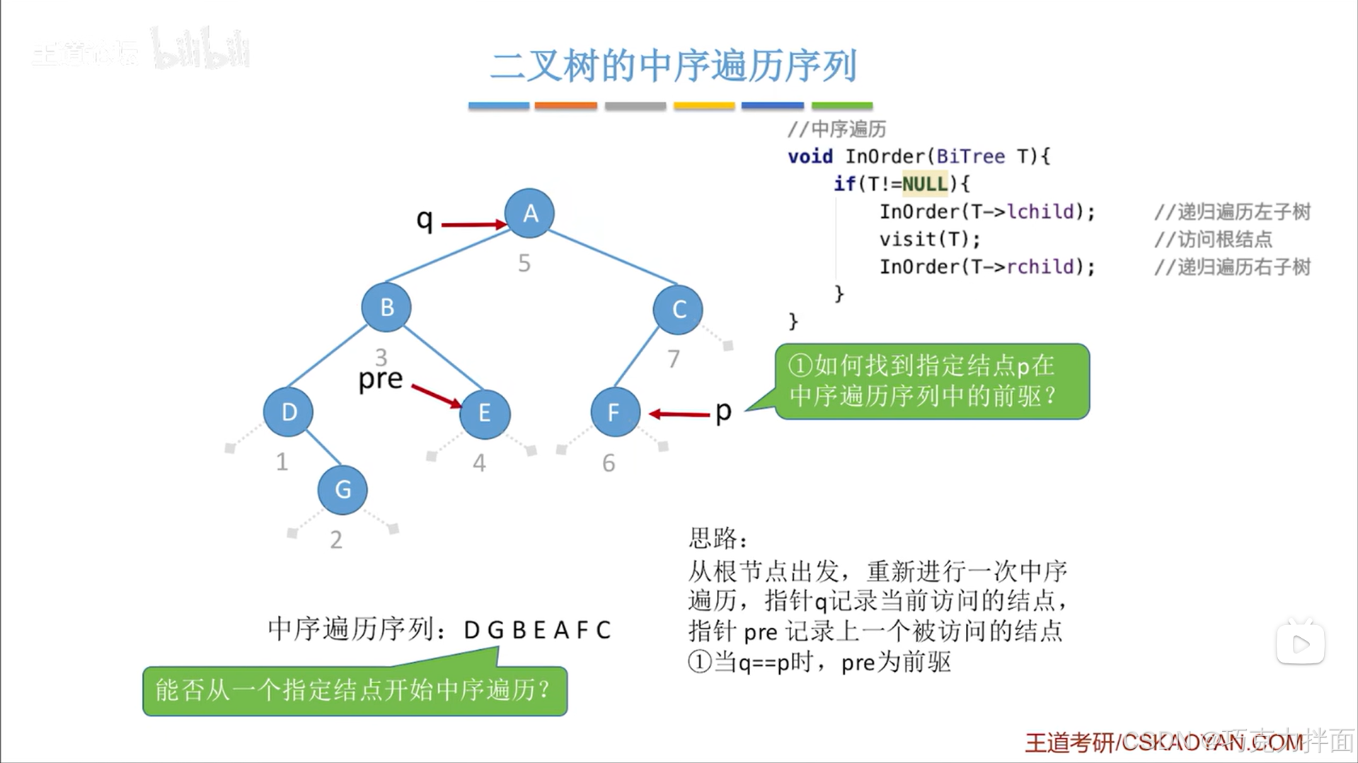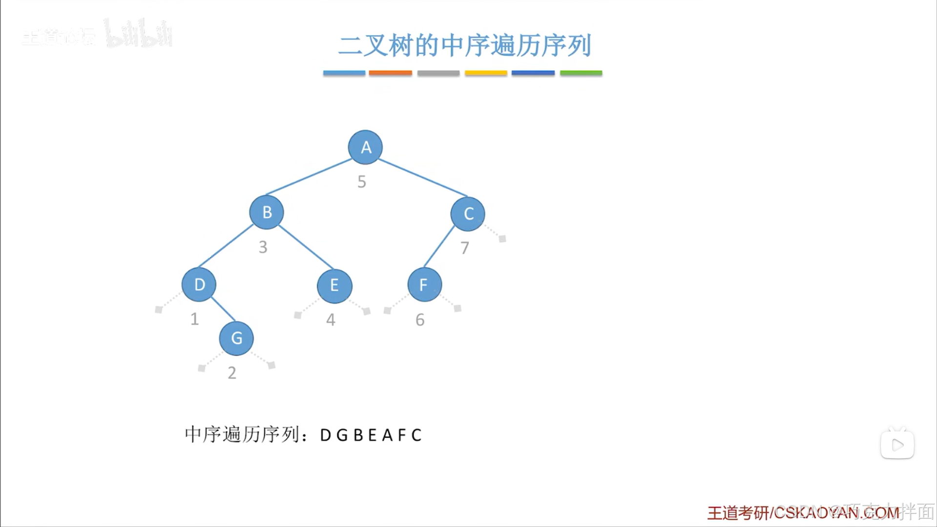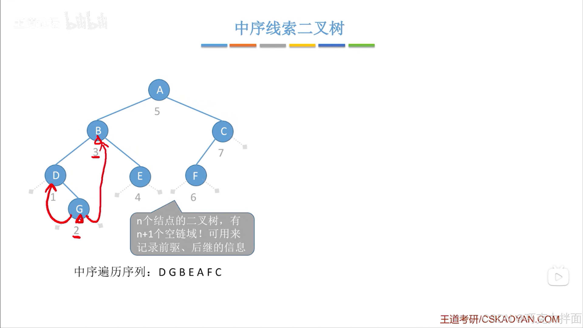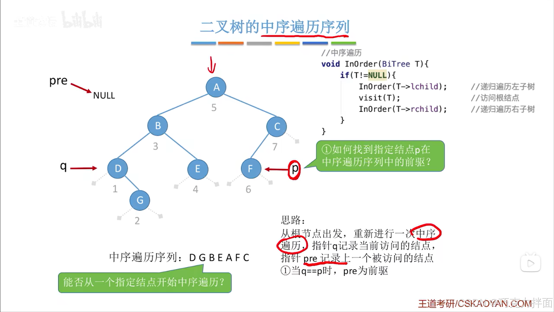 静态链表示意图:2.2 顺序表与链表的比较存储密度比较:顺序表:只存储数据元素、预分配存储空间链表:指针的结构性开销、链表中的元素个数没有限制按位查找:顺序表:O(1),随机存取链表:O(n),顺序存取插入和删除:顺序表:O(n),平均移动表长一半的元素链表:不用移动元素,合适位置的指针——O(1)时间复杂度:顺序表:若线性表频繁查找却很少进行插入和删除操作链表:若线性表需频繁插入和删除时空间复杂度:顺序表:知道线性表的大致长度,空间效率会更高链表:若线性表中元素个数变化较大或者未知2.3 栈 定义:限定仅在一端(栈顶)进行插入和删除操作的线性表,后进先出。栈示意图: 时间复杂度(插入与删除):顺序栈与链栈均为O(1) 空间复杂度:链栈多一个指针域,结构性开销较大,使用过程中元素个数变化较大时,用链栈;反之顺序栈。 出栈元素不同排列的个数: (卡特兰数) 共享栈: 两个栈共享一片内存空间, 两个栈从两边往中间增长。卡特兰数的应用:存储结构:顺序栈初始化:top=-1链栈初始化:top=NULL栈的应用: 1) 括号匹配 2) 递归 3) 中缀表达式 转 后缀表达式 4) 中缀表达式:设两个栈(数据栈和运算符栈),根据运算符栈的优先级进行运算。2.4 队列 定义: 只允许在一端插入, 在另一端删除。具有先进先出的特点。队列示意图: 时间复杂度:均为O(1) 空间复杂度:链队列多一个指针域,结构性开销较大;循环队列存在浪费空间和溢出问题。使用过程中元素个数变化较大时,用链队列;反之循环队列。 双端队列: 只允许从两端插入、两端删除的线性表。双端队列示意图: 存储结构: 链队列:队头指针指向队头元素的前一个位置,队尾指针指向队尾元素,先进先出。 循环队列: 1)队空:front=rear 2)队满:(rear+1)%QueueSize=front 3)队列元素个数:(队尾-队头+队长)%队长==(rear-front+QueueSize)%QueueSize队列的应用: 1) 树的层次遍历 2) 图的广度优先遍历2.4 数组与特殊矩阵一维数组的存储结构:二维数组的存储结构: 对称矩阵的压缩(行优先):下三角矩阵的压缩(行优先): 上三角(行优先):三对角矩阵的压缩(行优先):稀疏矩阵压缩:十字链表法压缩稀疏矩阵:2.5 串 串,即字符串(String)是由零个或多个字符组成的有限序列。串是一种特殊的线性表,数据元素之间呈线性关系。字符串模式匹配: 1)朴素模式匹配算法 2)KMP算法手算KMP的next数组示意图:求next[2] :求next[3]: 求next[4]: 求next[5]: C语言求KMP的next数组代码示例:void Createnext(char *sub, int *next){ assert(sub != NULL && next != NULL); int j = 2; //模式串的next指针 int k = 0; //next数组的回溯值,初始化为next[1]=0 int lenSub = strlen(sub); assert(lenSub != 0); next[0] = -1; next[1] = 0; while (j < lenSub){ if (sub[j-1] == sub[k]){ next[j] = ++k; j++; } else{ k = next[k]; if (k == -1){ k = 0; next[j] = k; j++; } } }}求nextValue:void nextValue(char *sub, int *next) { int lenSub = strlen(sub); for(int j=2;j<lensub; j++){ if(sub[j]==sub[next[j]]) next[j]=next[next[j]] }}备注: 1) 实现next有多种不同方式, 对应不同的next数组使用 2) 根据实现方式不同, next数组整体+1不影响KMP算法。第三章 树和二叉树3.1 树和森林 定义(树):n(n≥0)个结点(数据元素)的有限集合,当 n=0 时,称为空树。3.1.1 树的基本术语 结点的度:结点所拥有的子树的个数。 叶子结点:度为 0 的结点,也称为终端结点。 分支结点:度不为 0 的结点,也称为非终端结点。 孩子:树中某结点子树的根结点称为这个结点的孩子结点。 双亲:这个结点称为它孩子结点的双亲结点。 兄弟:具有同一个双亲的孩子结点互称为兄弟。 路径:结点序列 n1, n2, …, nk 称为一条由 n1 至 nk 的路径,当且仅当满足结点 ni 是 ni+1 的双亲(1<=i<k)的关系。 路径长度:路径上经过的边的个数。 祖先、子孙:如果有一条路径从结点 x 到结点 y,则 x 称为 y 的祖先,而 y 称为 x 的子孙。 结点所在层数:根结点的层数为 1;对其余结点,若某结点在第 k 层,则其孩子结点在第 k+1 层。 树的深度(高度):树中所有结点的最大层数。 树的宽度:树中每一层结点个数的最大值。 树的度:树中各结点度的最大值。 树的路径长度: 从根到每个结点的路径长度总和 备注: 在线性结构中,逻辑关系表现为前驱——后继,一对一; 在树结构中,逻辑关系表现为双亲——孩子,一对多。 森林: 森林是m(m≥0)棵互不相交的树的集合, m可为0, 即空森林。3.1.2 树的性质 结点数=总度数+1 度为m的树第 i 层至多有 个结点(i≥1) 高度为h的m叉树至多有 个结点 具有n个结点的m叉树的最小高度为 最小高度推理过程图:3.1.3 树与森林的遍历树的遍历:先根遍历(先根后子树)后根遍历(先子树后根)层序遍历森林的遍历:前序遍历(先根, 后子树)中序遍历(先子树后根, 其实就是后序遍历树)区别与联系: 1) 树的前序遍历等价于其树转化二叉树的前序遍历! 2) 树的后序遍历等价于其树转化二叉树的中序遍历!3.1.4 树的存储结构双亲表示法图:孩子表示法图:孩子兄弟表示法图(树/森林转化为二叉树):3.1.5 树转二叉树在树转为二叉树后, 有以下结论: 1) 树的叶子结点数量 = 二叉树左空指针数量(形象理解为树越宽, 兄弟越多, 越是向右长) 2) 树的非叶子结点数量 = 二叉树右空指针-1(非叶子必有儿子, 右指针由儿子提供, -1是根节点多了一个右空指针)3.2 二叉树3.2.1 二叉树的性质斜树:左斜树:所有结点都只有左子树的二叉树右斜树:所有结点都只有右子树的二叉树 满二叉树:所有分支结点都存在左子树和右子树,且