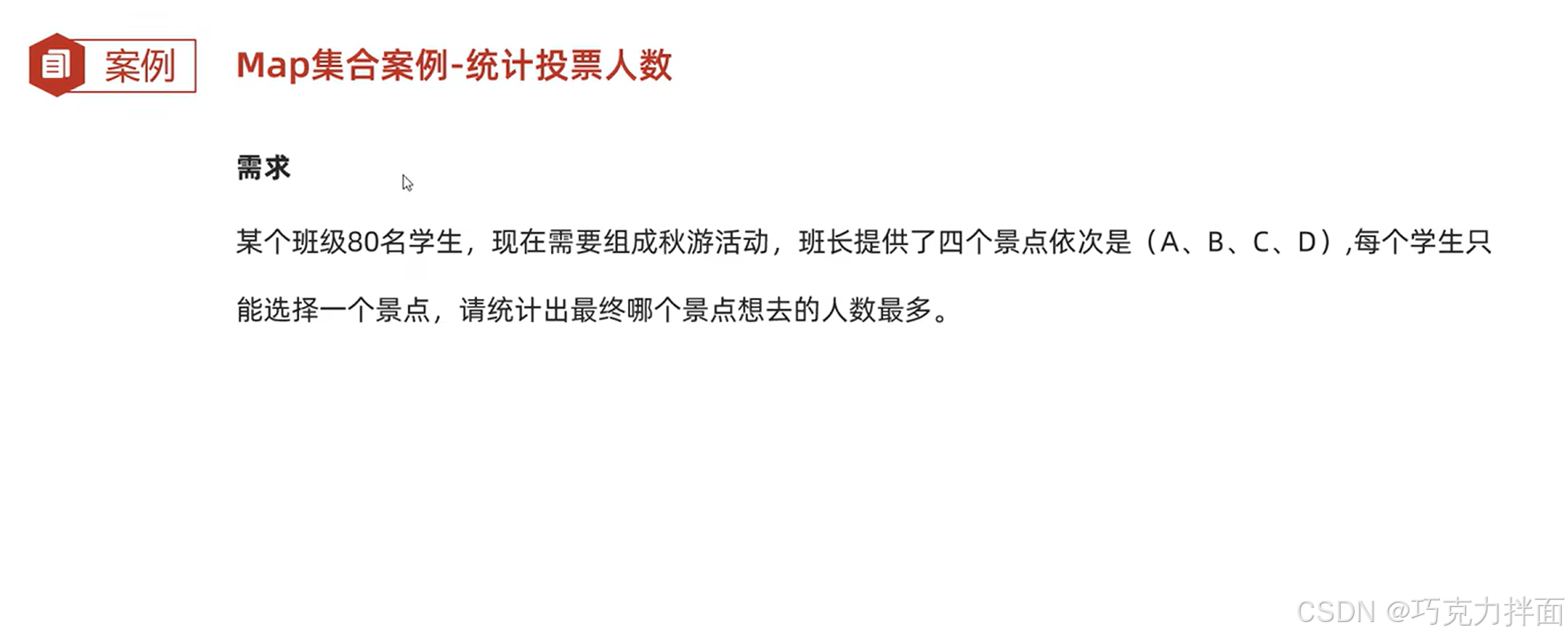 创建一个Map集合,键存储景点的名称,值统计该景点被投票的次数,接下来就可以依次得到80名学生每一个人的投票信息: