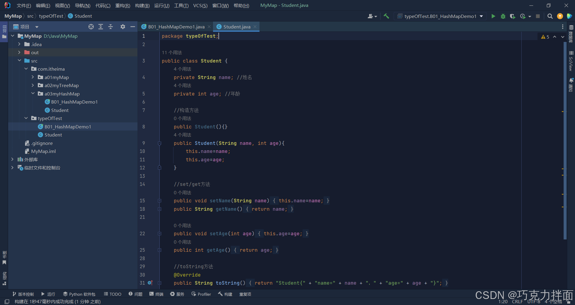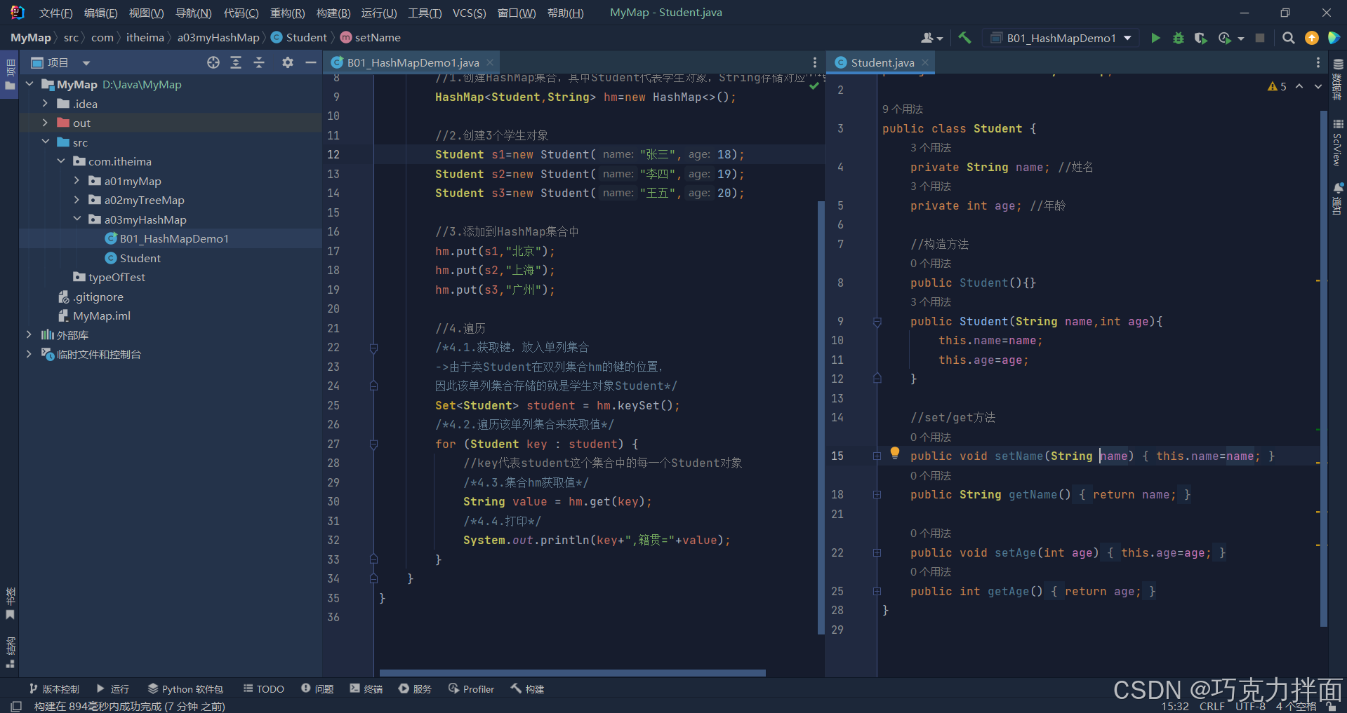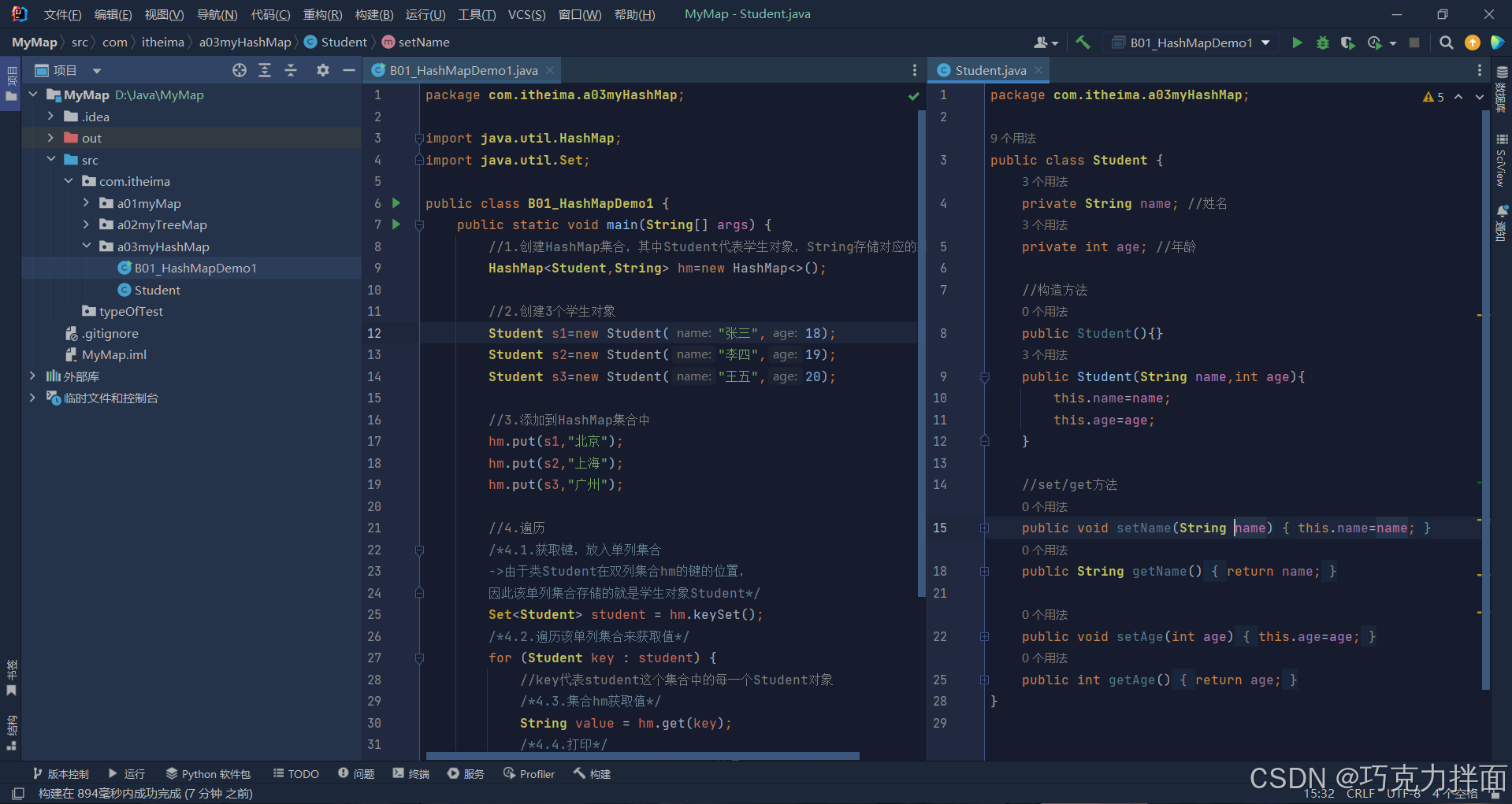 ->对于HashMap集合的键,由于学生对象(Student)属于引用数据类型,且学生对象(Student)位于键的位置,重写hashCode方法和equals方法就能实现键即学生对象(Student)的唯一性