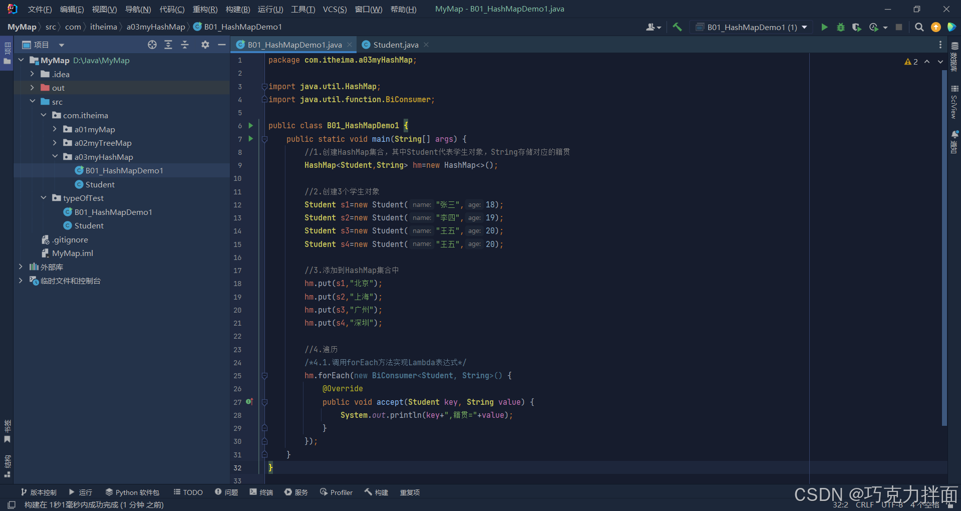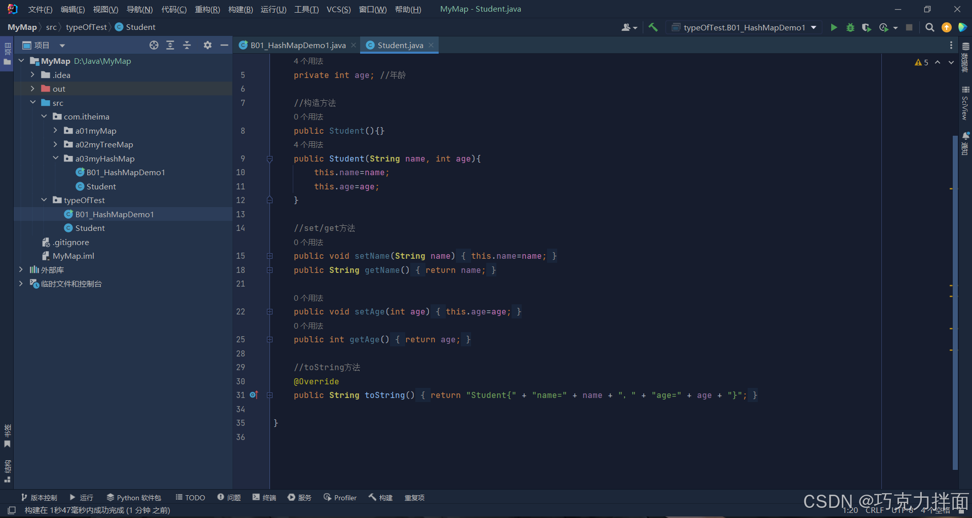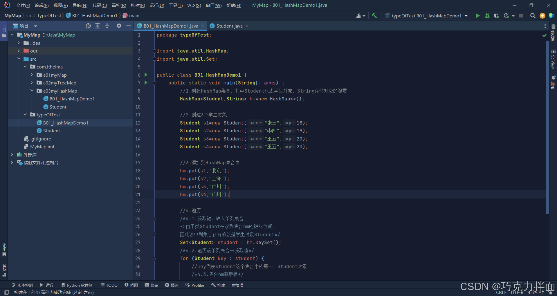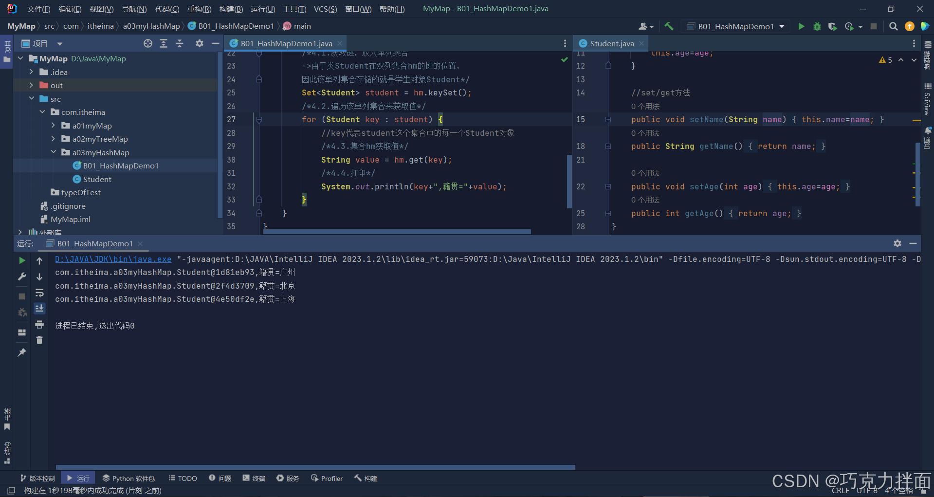 ->对于HashMap集合的键,由于学生对象(Student)属于引用数据类型,且学生对象(Student)位于键的位置,重写hashCode方法和equals方法就能实现键即学生对象(Student)的唯一性