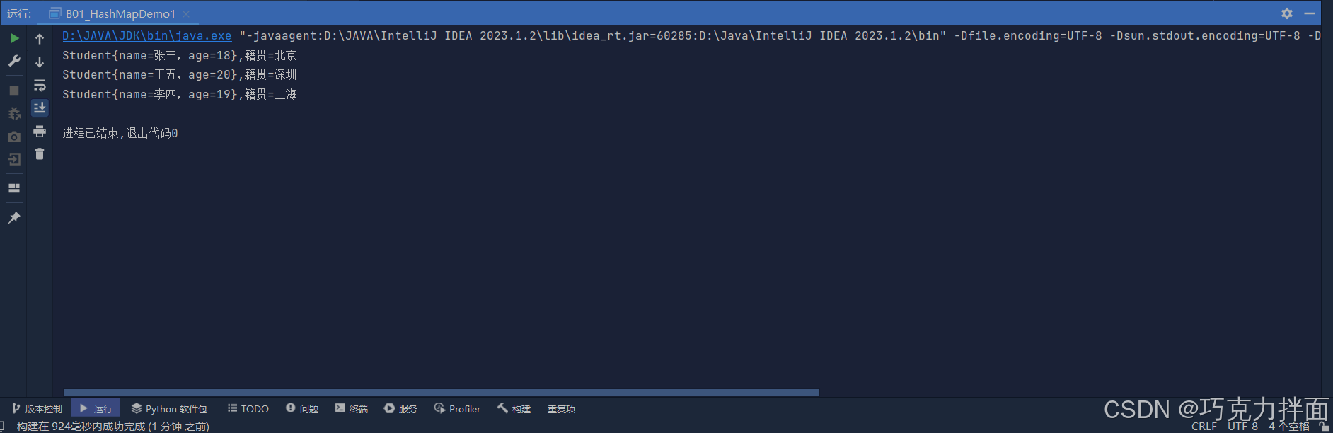 数据s3和s4的属性值一样,而且s3和s4是Student型,此时位于HashMap集合的键的位置,由于Student类中没有重写equals方法和hashCode方法,此时就不会去除重复的数据,运行结果如下->注:去重只针对键,和值无关: