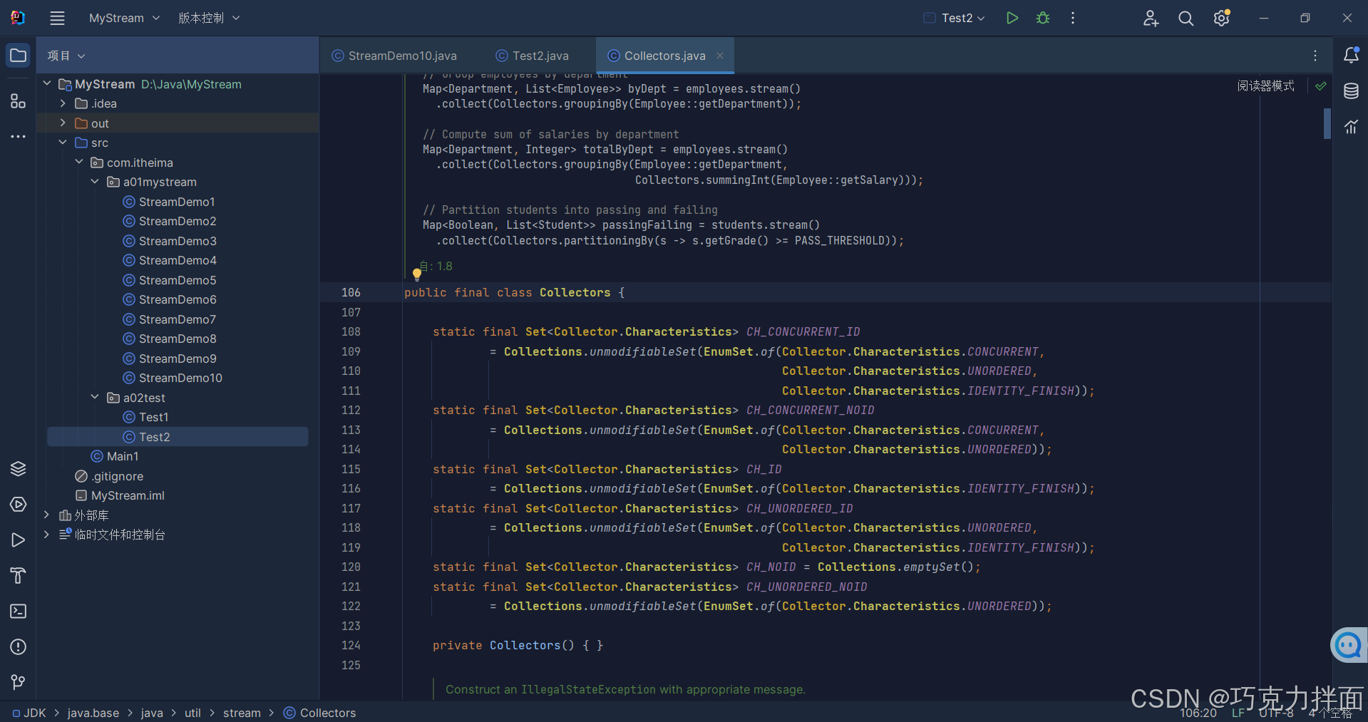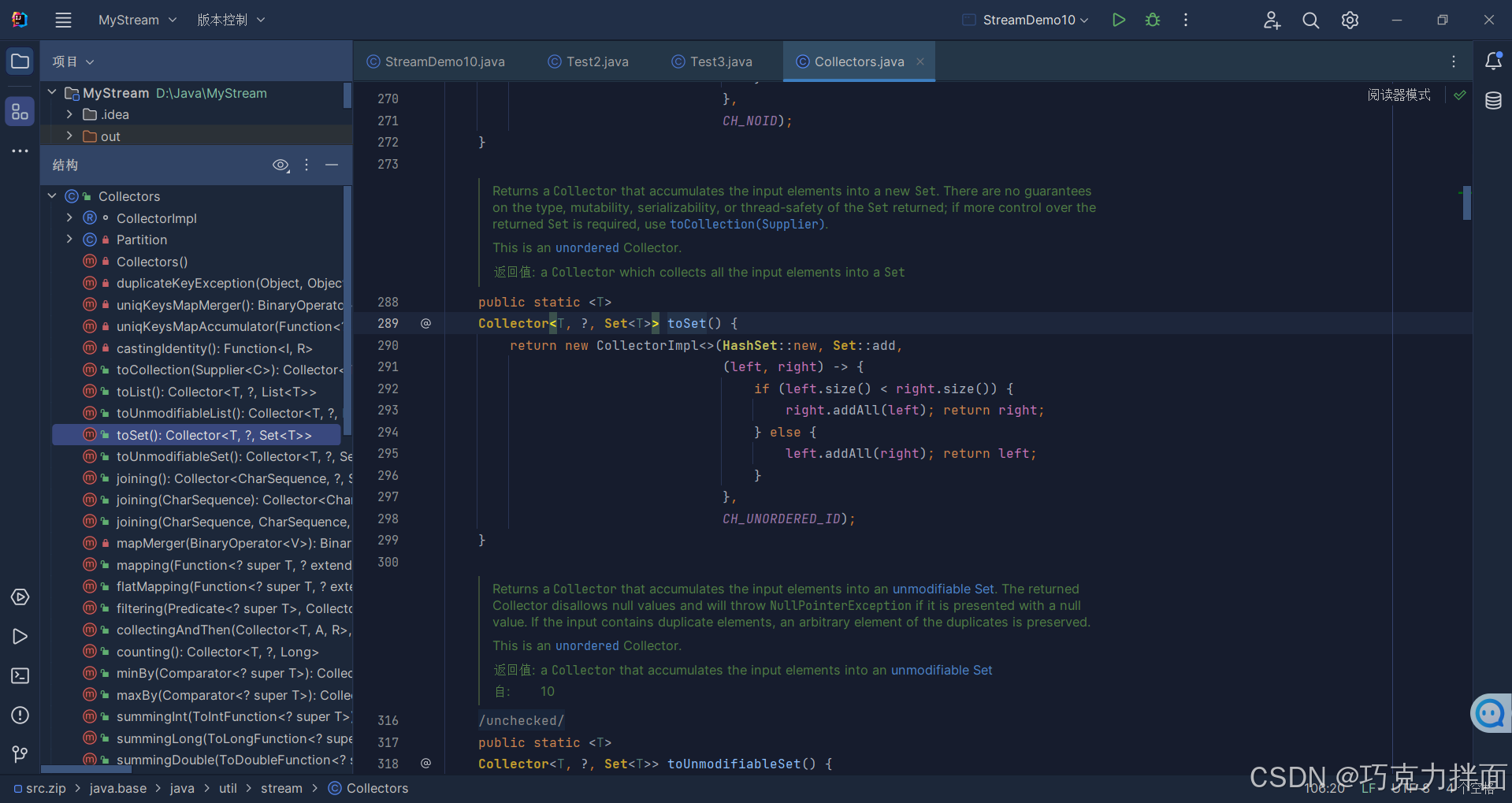 stream流里有一个工具类Collectors,工具类Collectors里有一个静态方法toSet,toSet方法的底层会帮我们创建一个HashSet集合,然后把stream流里面的所有数据都收集到单列集合Set中(HashSet集合属于单列集合Set的实现类),toSet方法常和stream流里的collect方法结合使用: