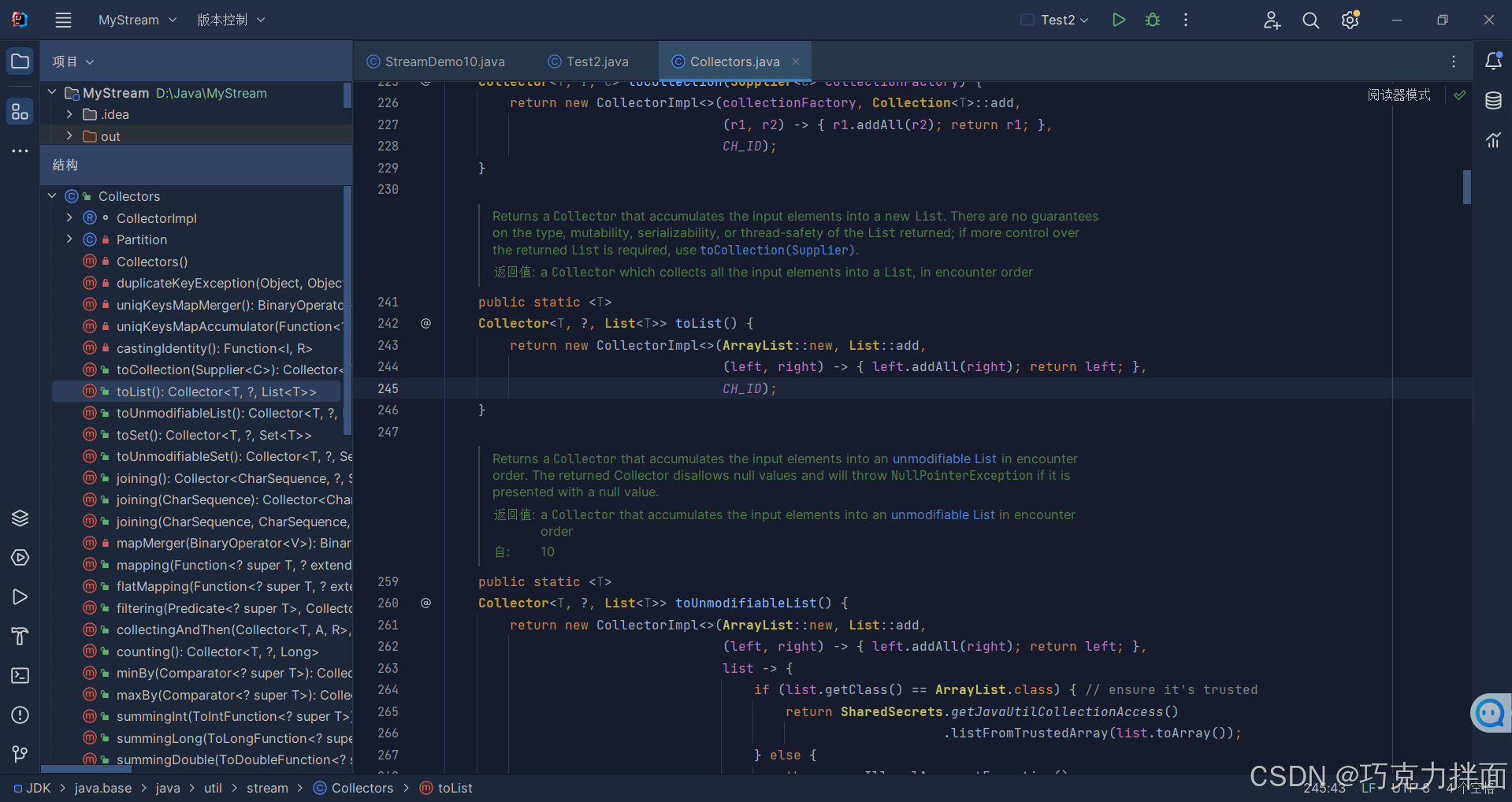 stream流里有一个工具类Collectors,工具类Collectors里有一个静态方法toList,toList方法的底层会帮我们创建一个ArrayList集合,然后把stream流里面的所有数据都收集到单列集合List中(ArrayList集合属于单列集合List的实现类),toList方法常和stream流里的collect方法结合使用: