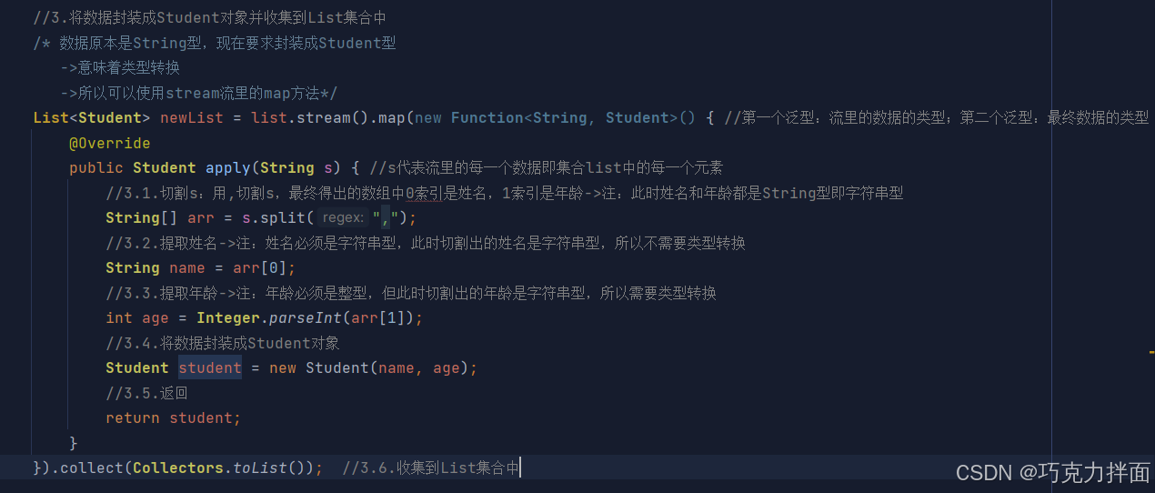 map方法中通过apply方法实现了将数据封装成Student对象->map方法就是用于把流里的字符串对象转换为Student对象: