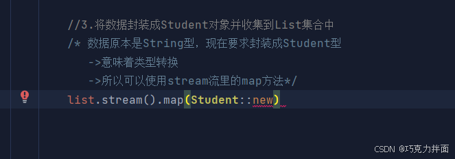 ->3和4.被引用的方法的形参和返回值,需要跟抽象方法的形参和返回值保持一致,而且被引用的方法的功能需要满足当前的需求,这里要注意的是:此时引用的是构造方法,引用构造方法时就不需要考虑方法的返回值了,此时的抽象方法指的是apply方法,apply方法的形参类型是String型,作用是实现将数据封装成Student对象,但在Student类里并没有形参类型是String型、作用是实现将数据封装成Student对象的构造方法,不符合,