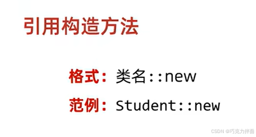 在方法引用的4个前提条件中第三条需要特别注意:构造方法没有返回值,意味着构造方法无法返回和抽象方法一样的返回值,但是在构造方法运行完之后,对应的类对象就已经存在了->所以在引用构造方法时,构造方法的返回值不需要考虑,只需要保证构造方法运行完之后,生成的对象和抽象方法的返回值保持一致即可,其他的前提条件依旧
