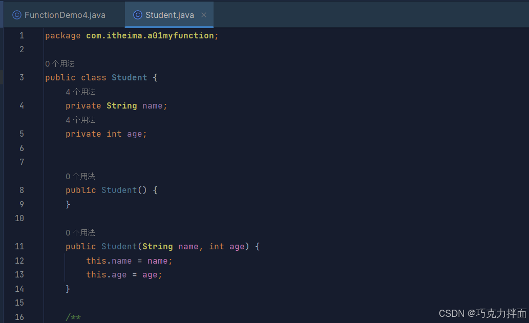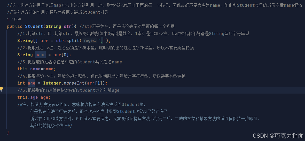 该构造方法用于实现map方法中的方法引用,所以该构造方法的形参依次表示流里面的每一个数据,因此该构造方法的形参最好不要命名为name和age,防止和Student类里的成员变量name和age混淆: