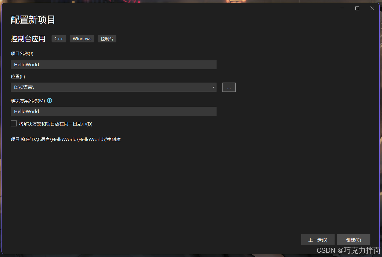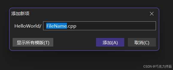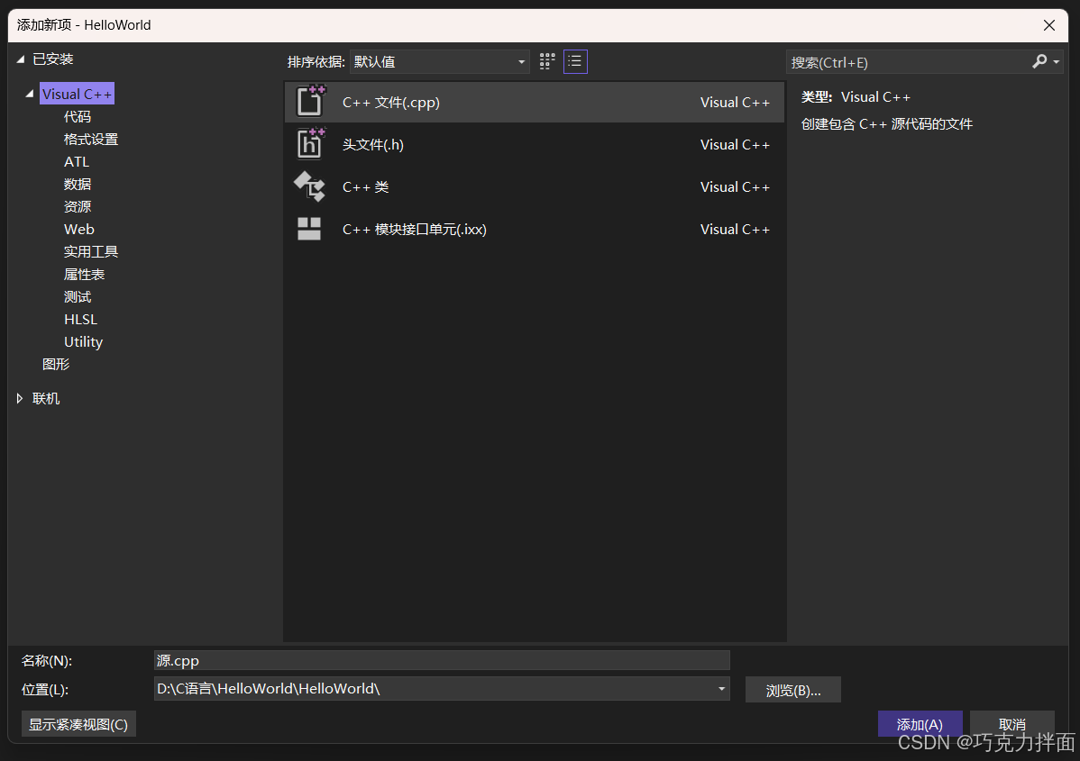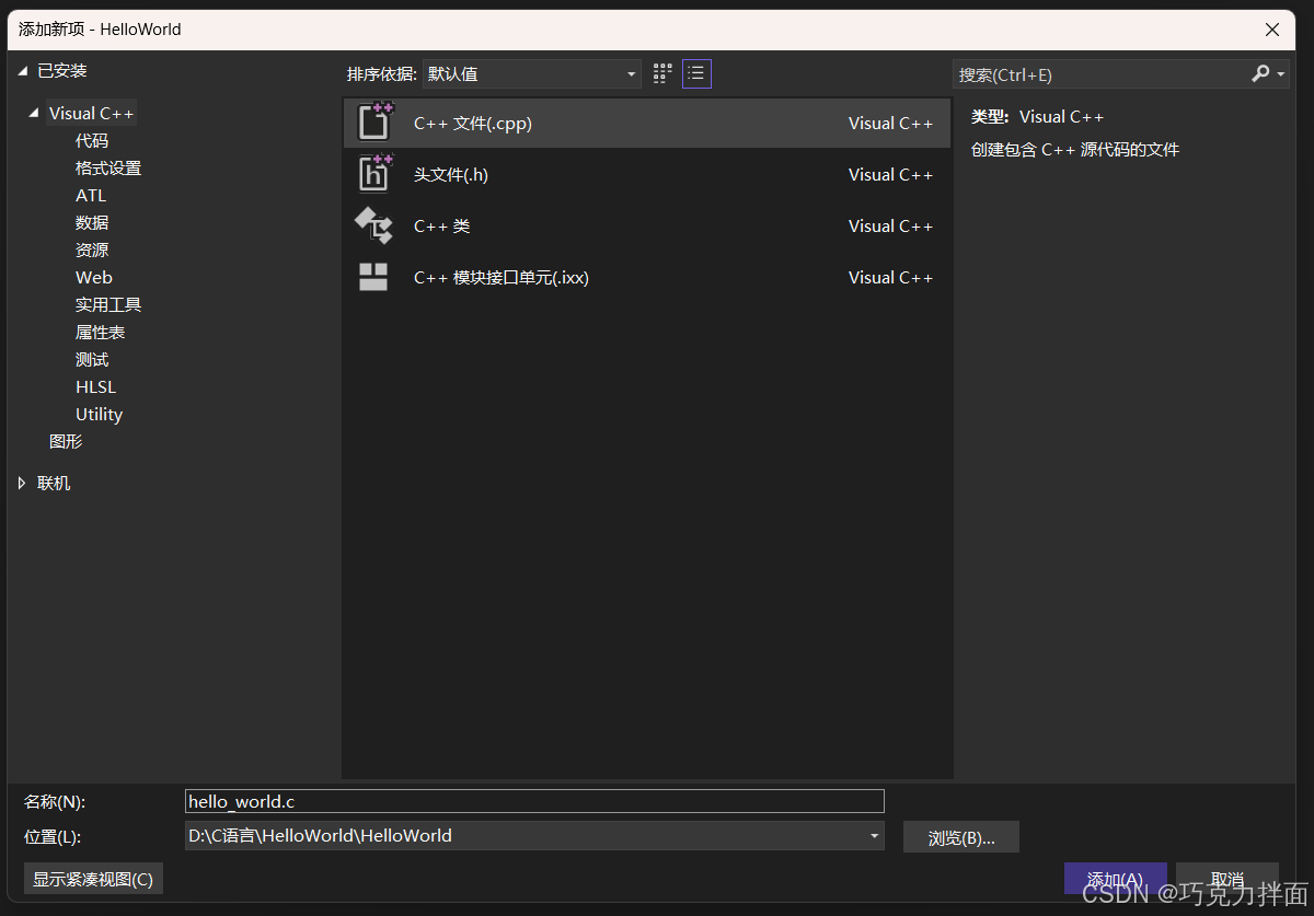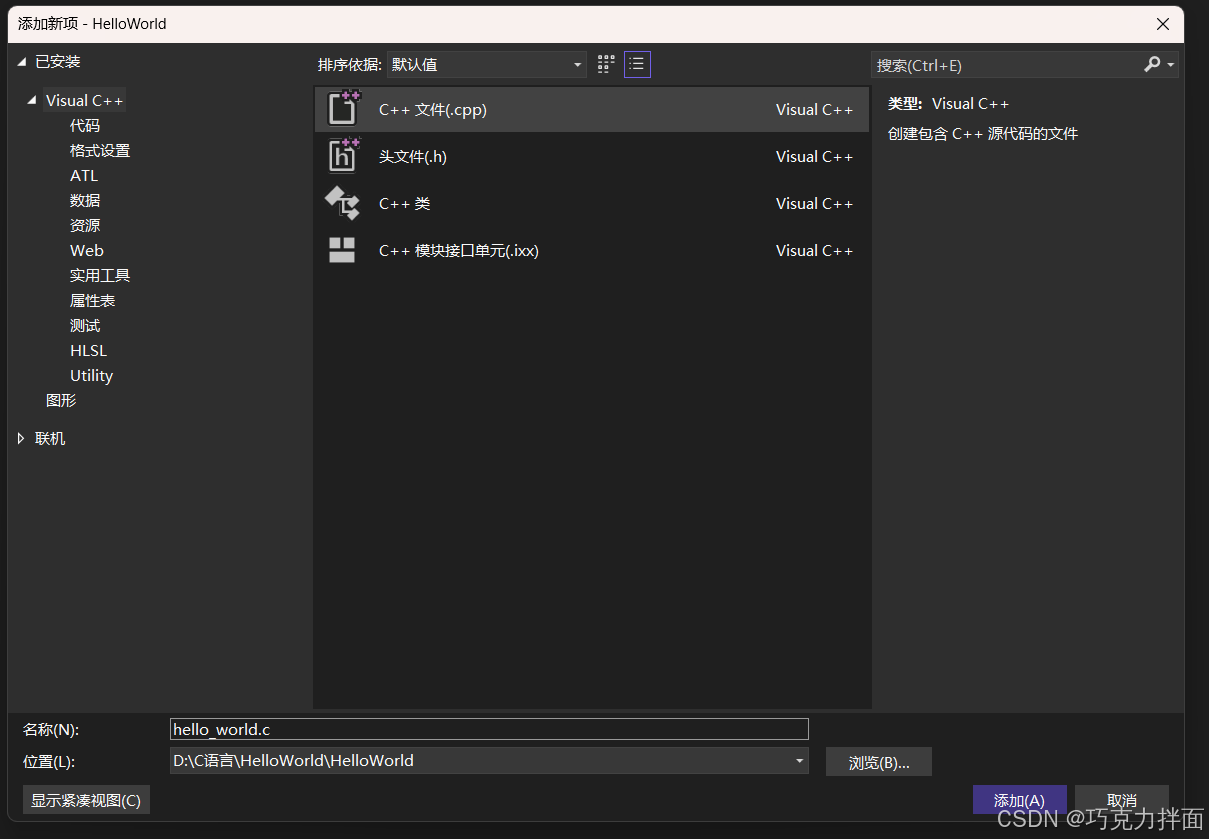 步骤十三:创建一个C++文件,所以选择第一个"C++文件(.cpp)",在下方"名称"处进行命名,此时创建的是文件,可以命名为"hello_world.c"-->这里可能会有疑问,现在整的是C语言,那什么是C++呢,C++就是C语言衍生出来的另外的一个语言,所以在文件命名是必须要手动写后缀名.c,如果不写.c,此时就是C++的环境,就不是C语言了