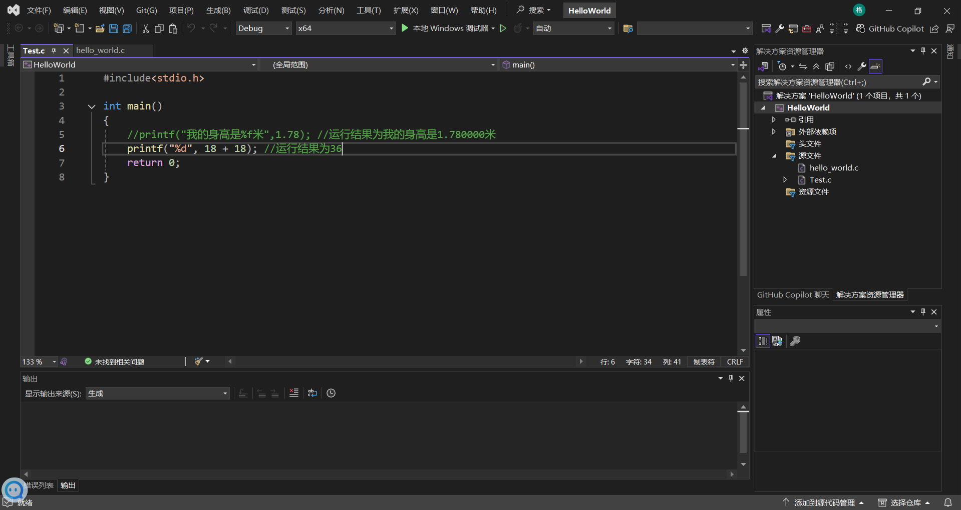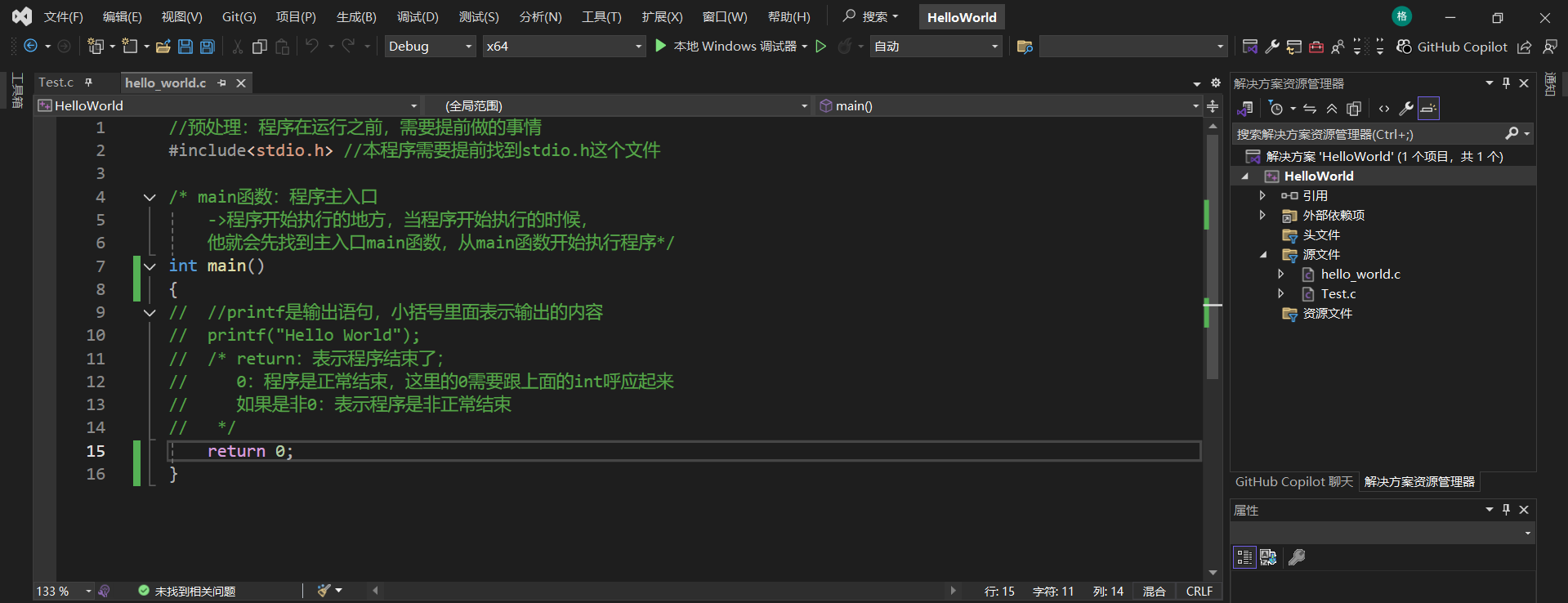 上述图片的源文件中有两个项目,分别是Test.c和hello_world.c,