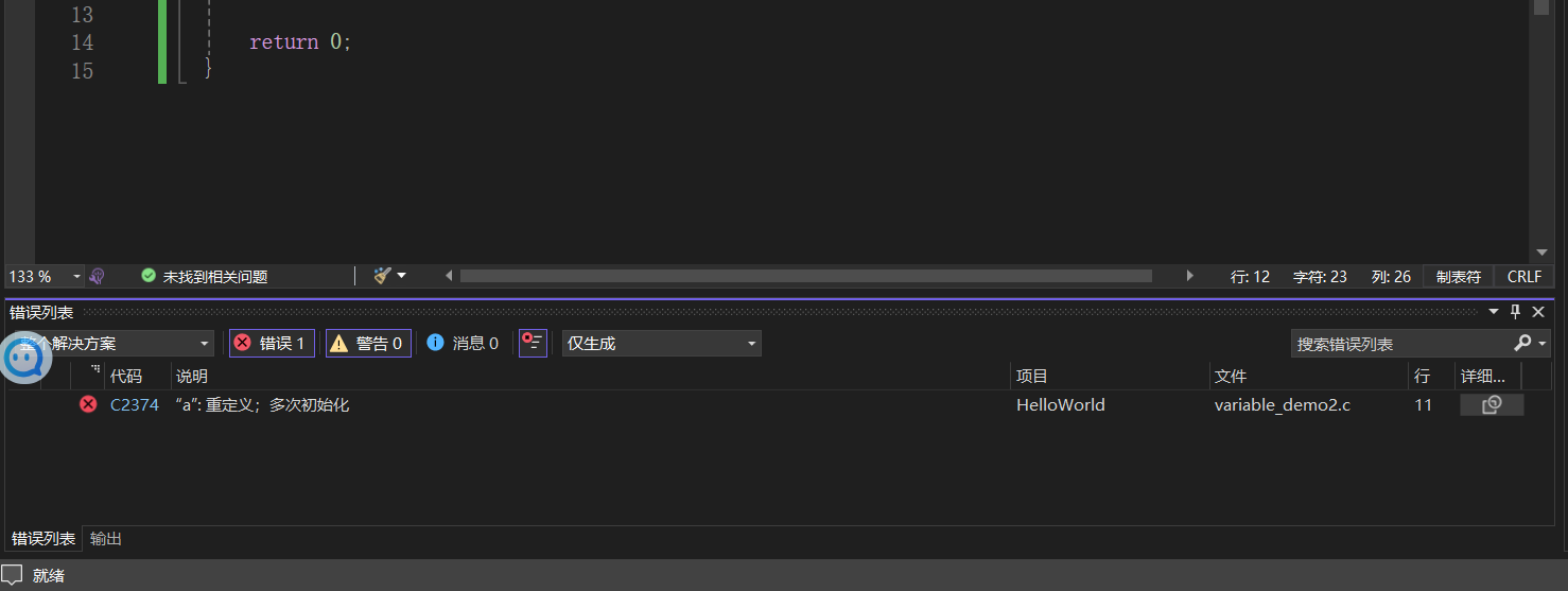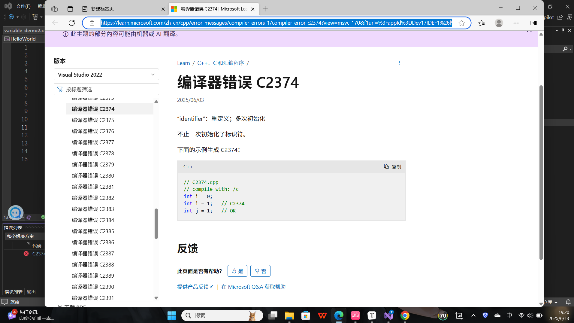 左下角有一个报错代码"C2374",点击"C2374"即可在浏览器中弹出错误的原因,