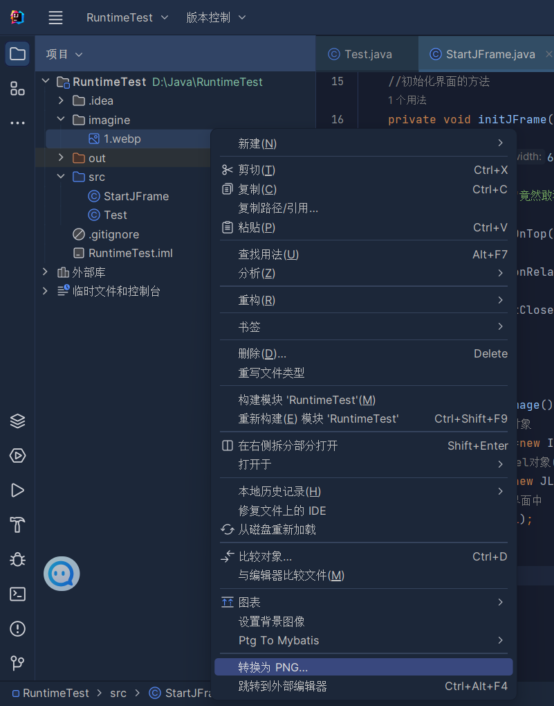 如下图,只需要右击该图片1.webp->"转换为PNG...":