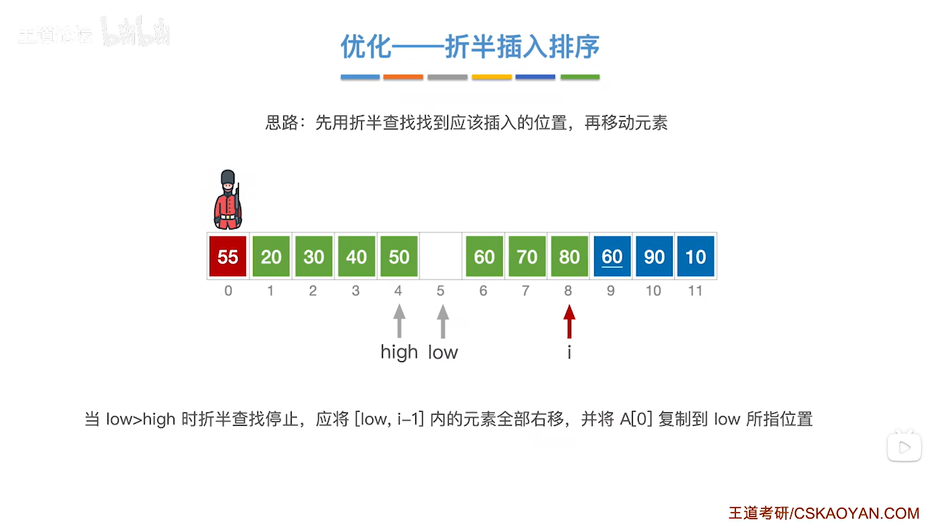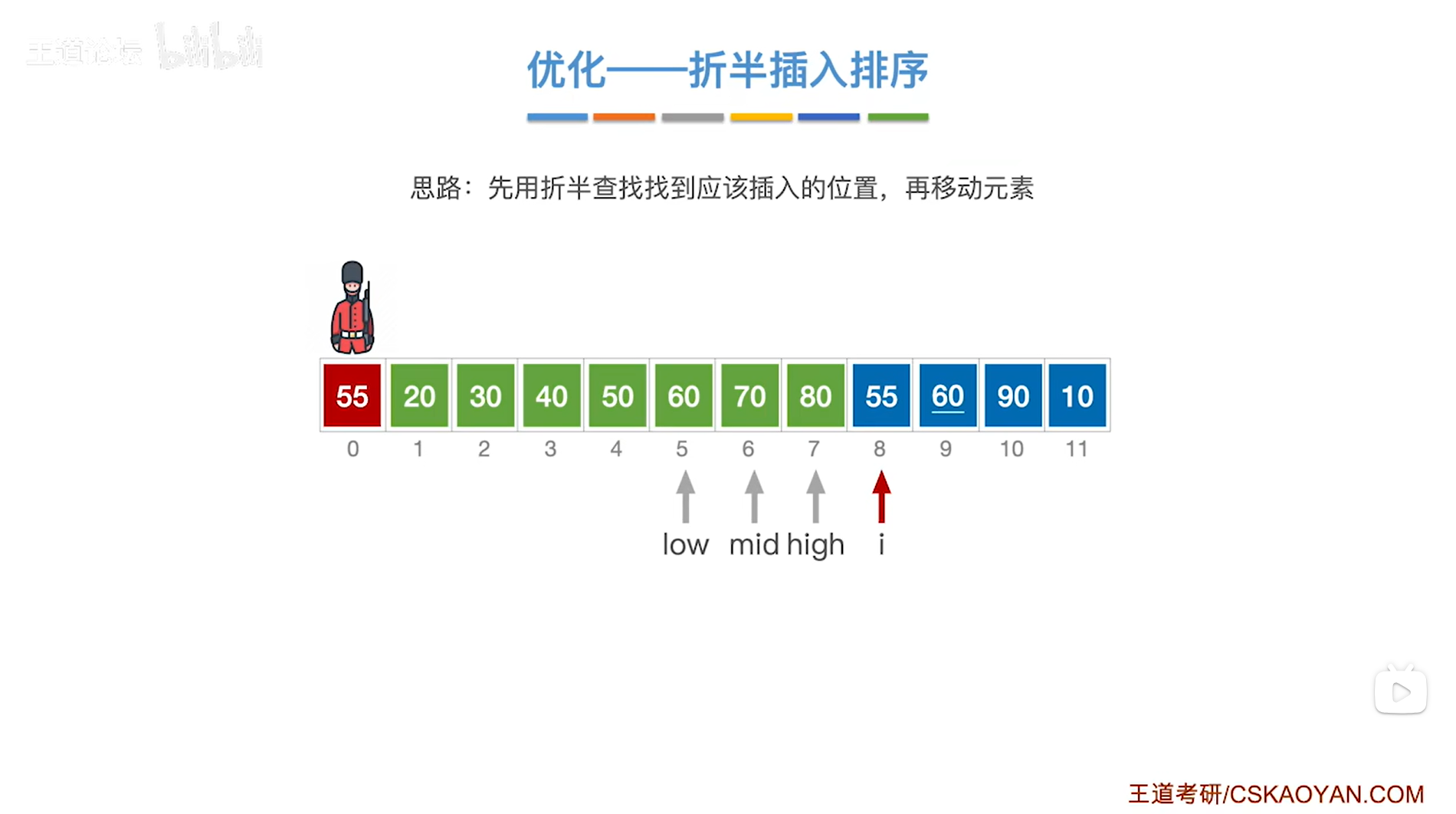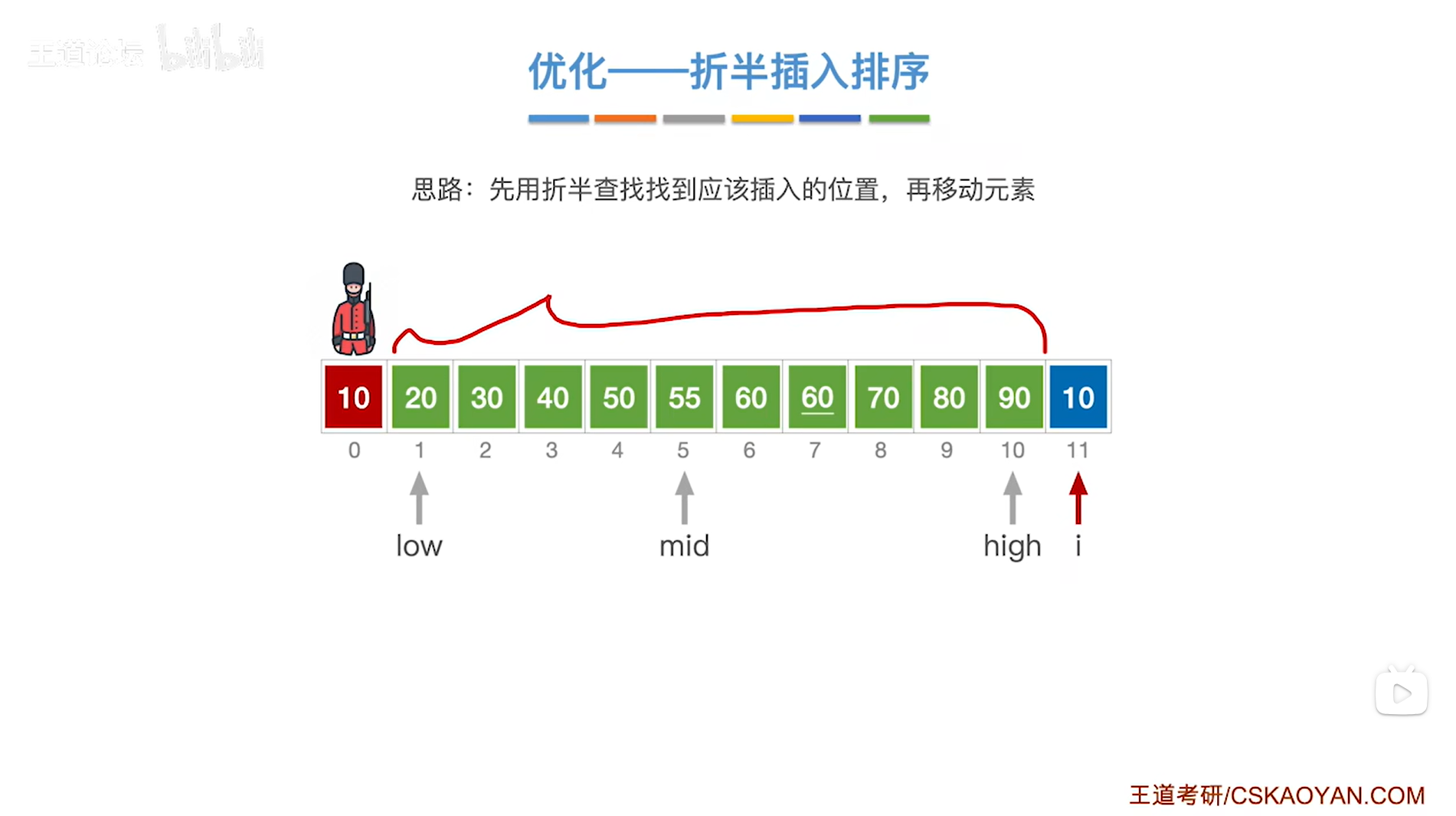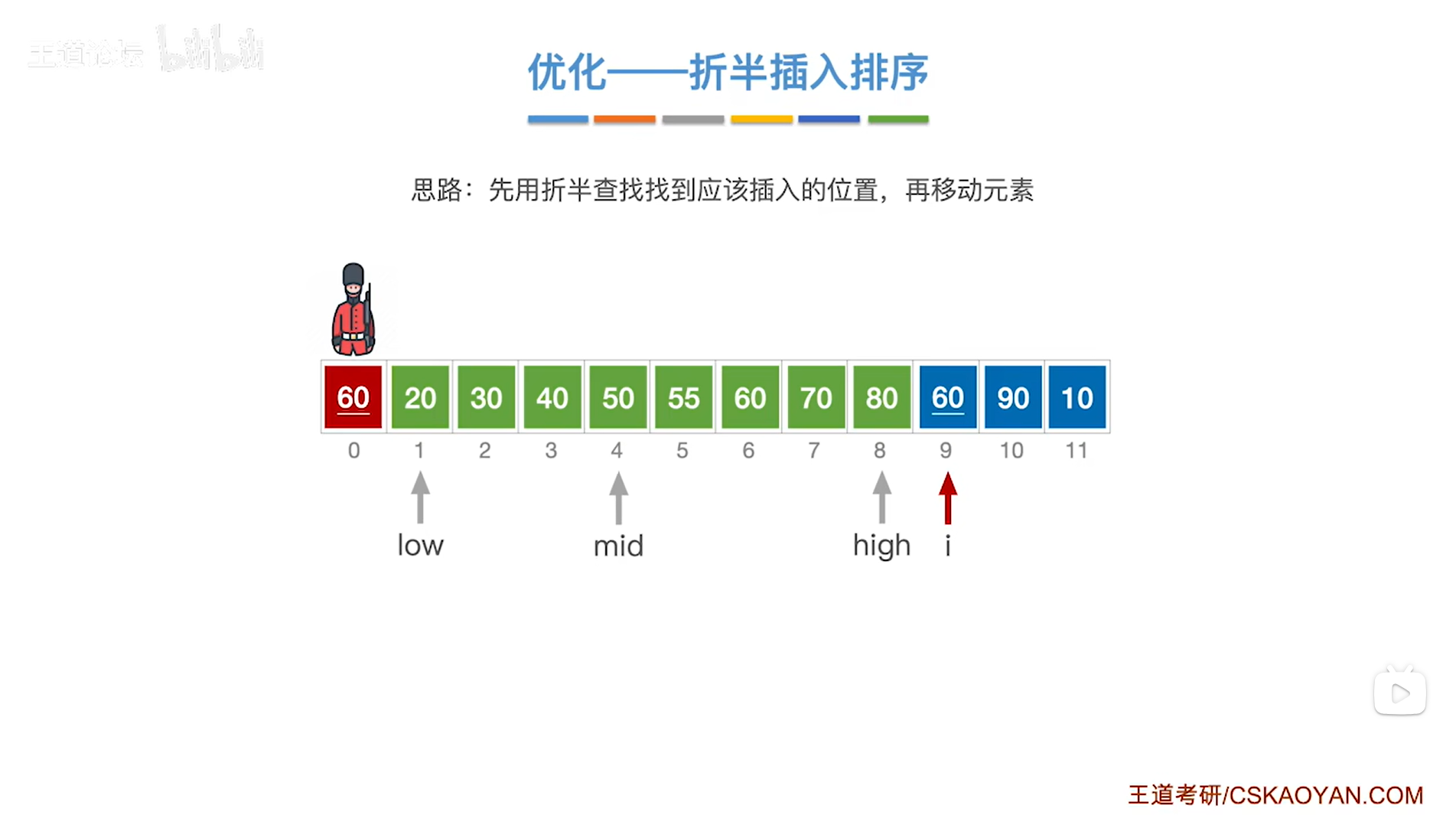 总之,在插入排序中,确定当前处理的元素应该插入的位置的时候,由于该元素前面的序列已经是有序的状态,所以可以使用折半查找的方式来更快的确定应插入的位置,