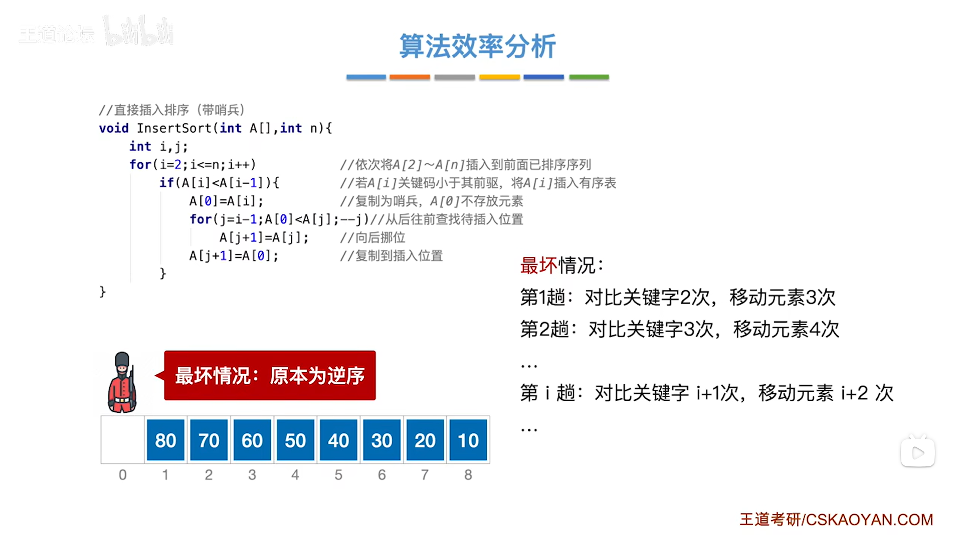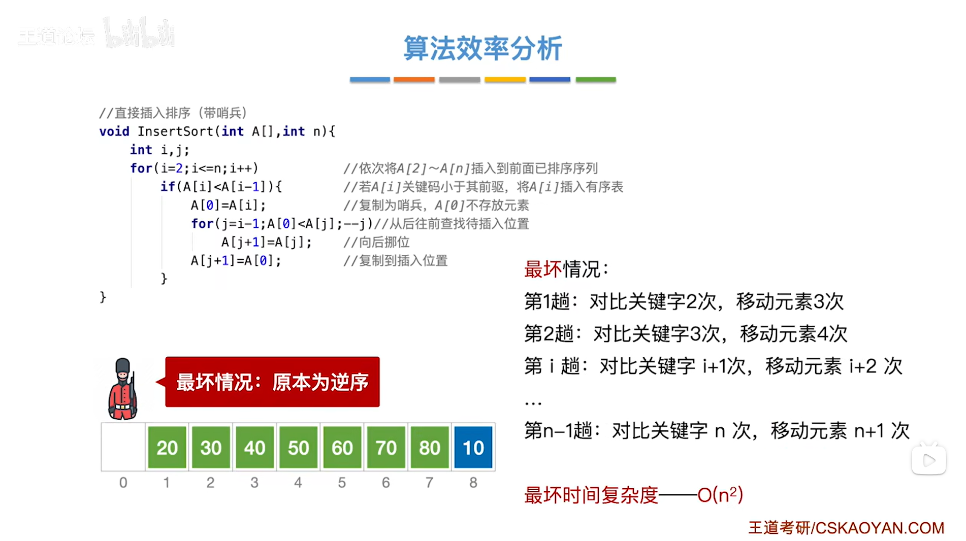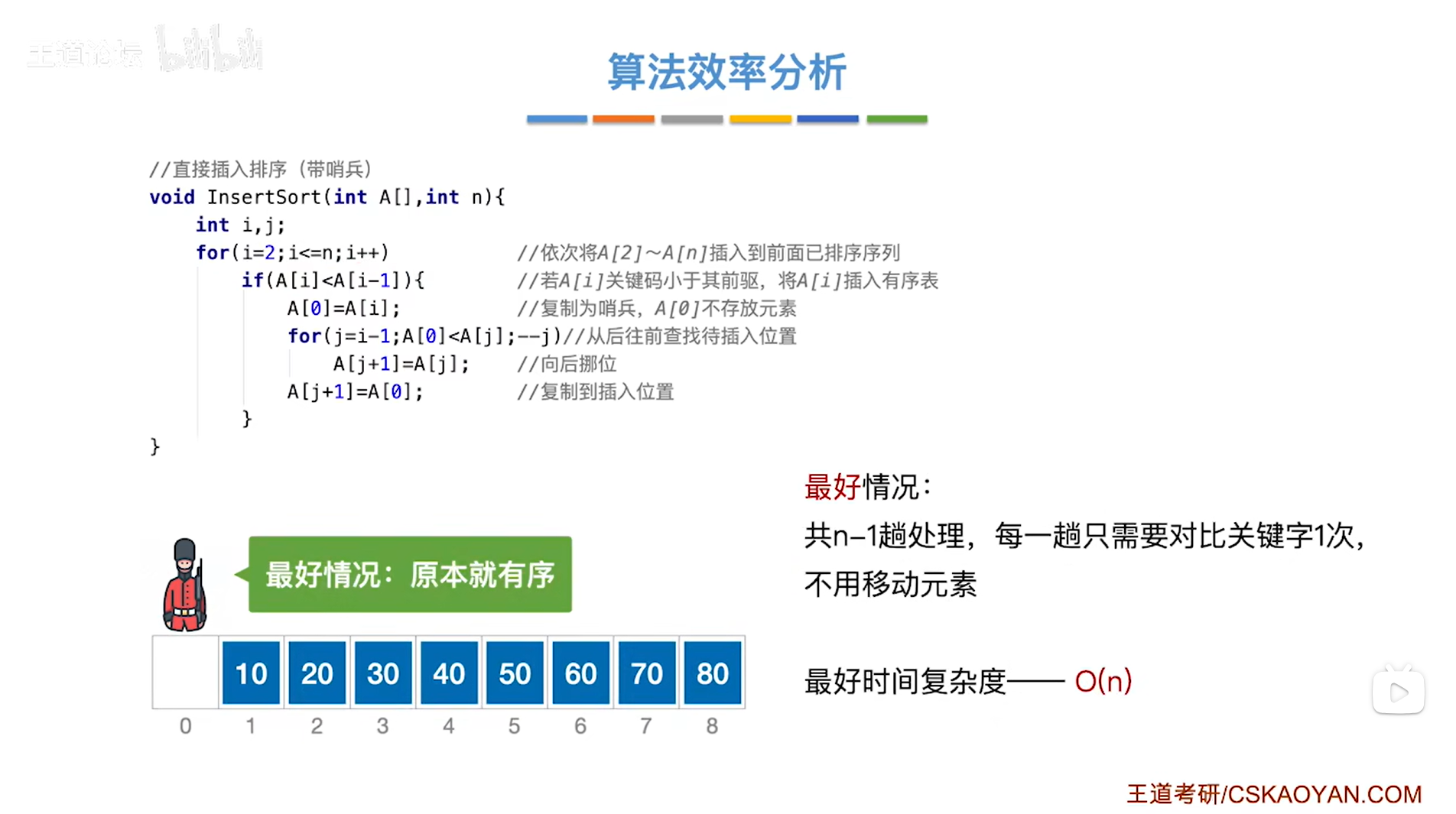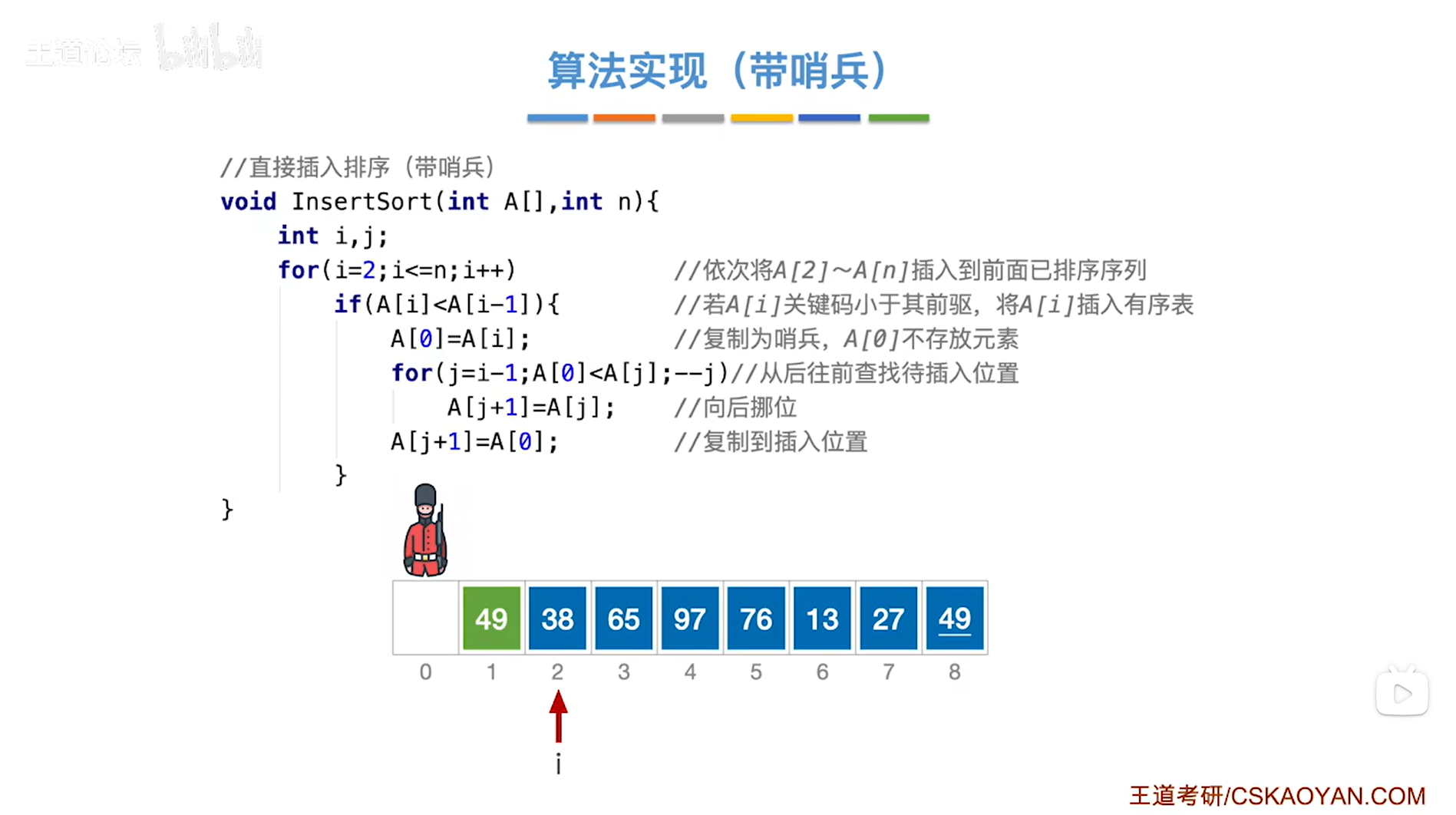 for(i=2;i<=n;i++) //依次将A[2]~A[n]插入到前面已排序序列(为什么到A[n],main函数里的例子可以解释)