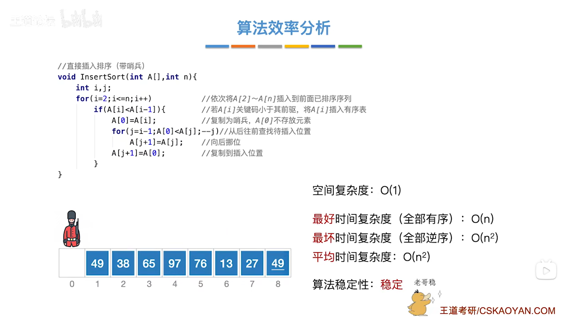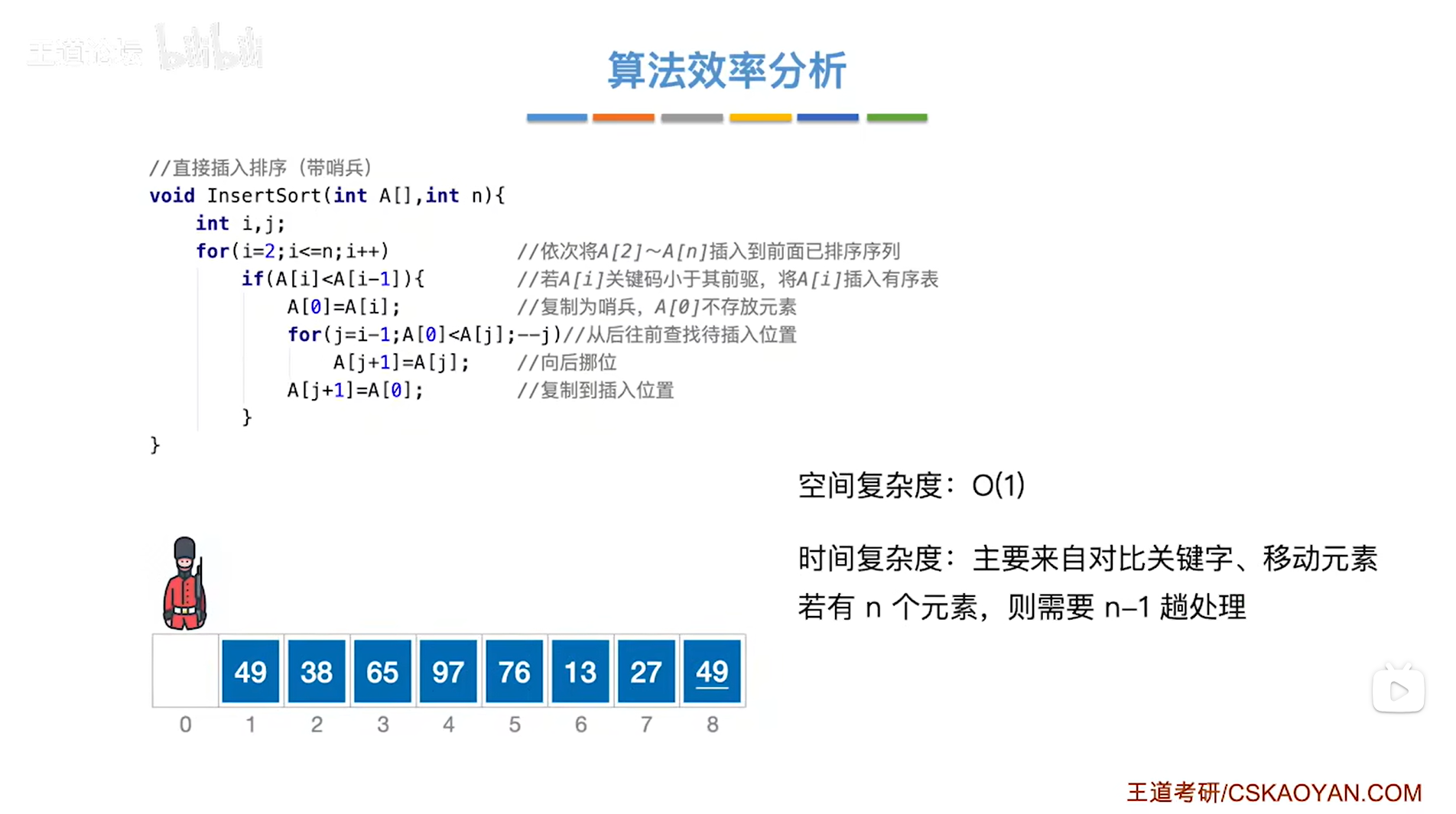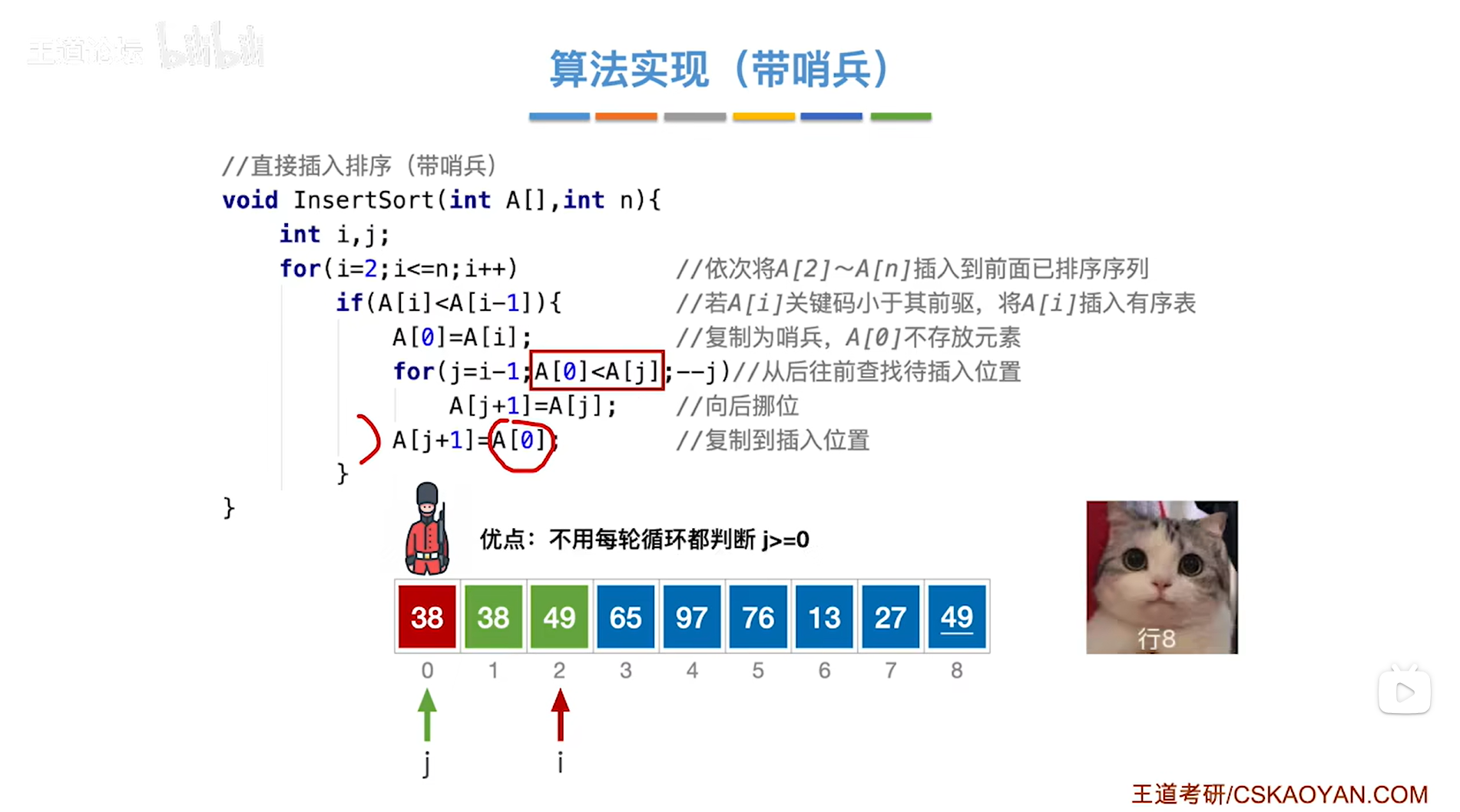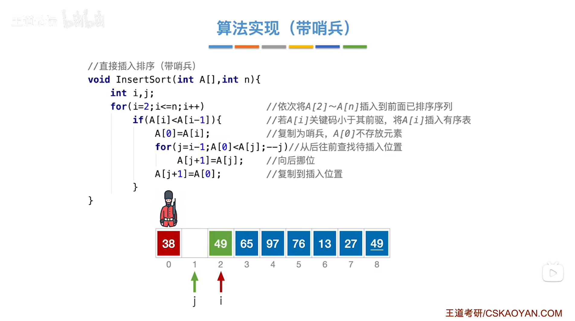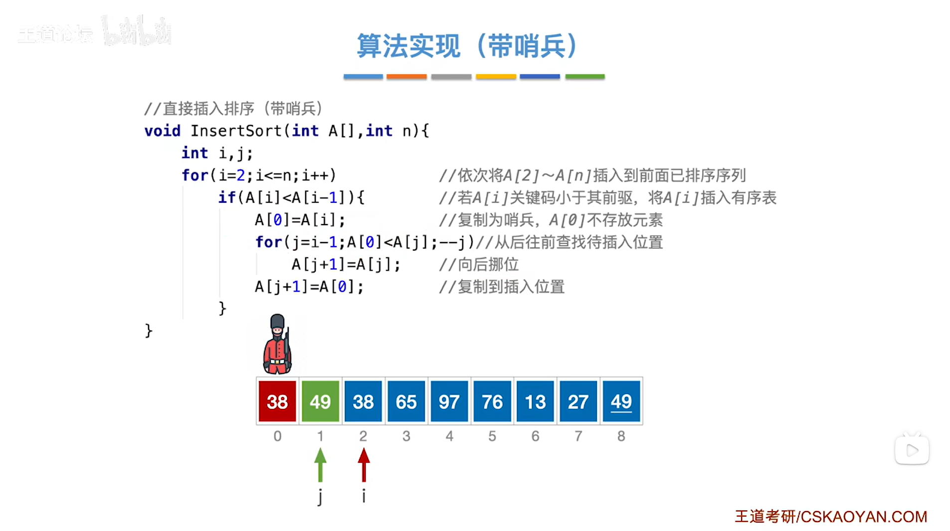 for(i=2;i<=n;i++) //依次将A[2]~A[n]插入到前面已排序序列(为什么到A[n],main函数里的例子可以解释)