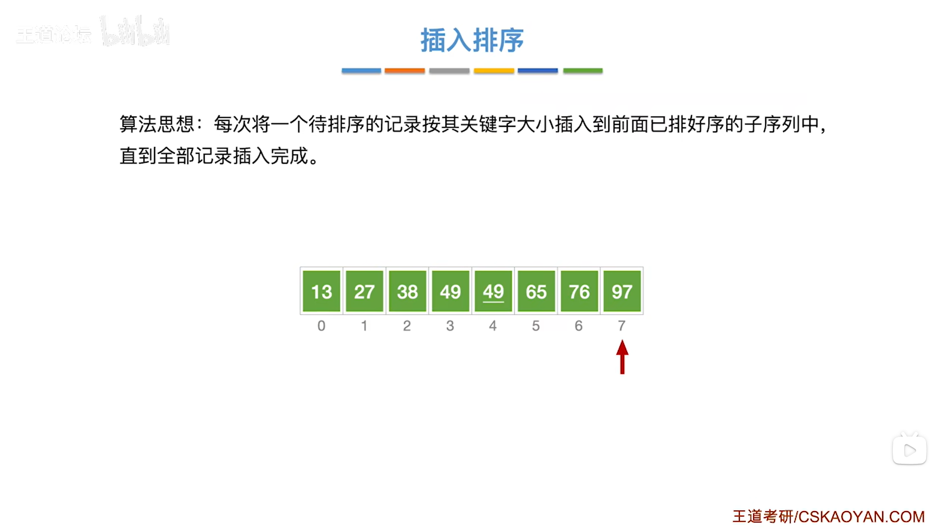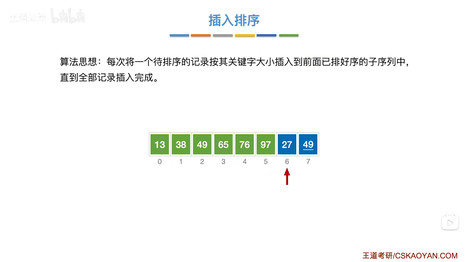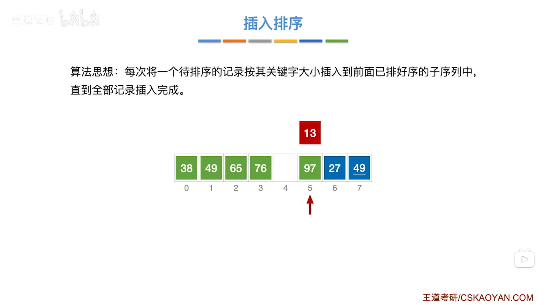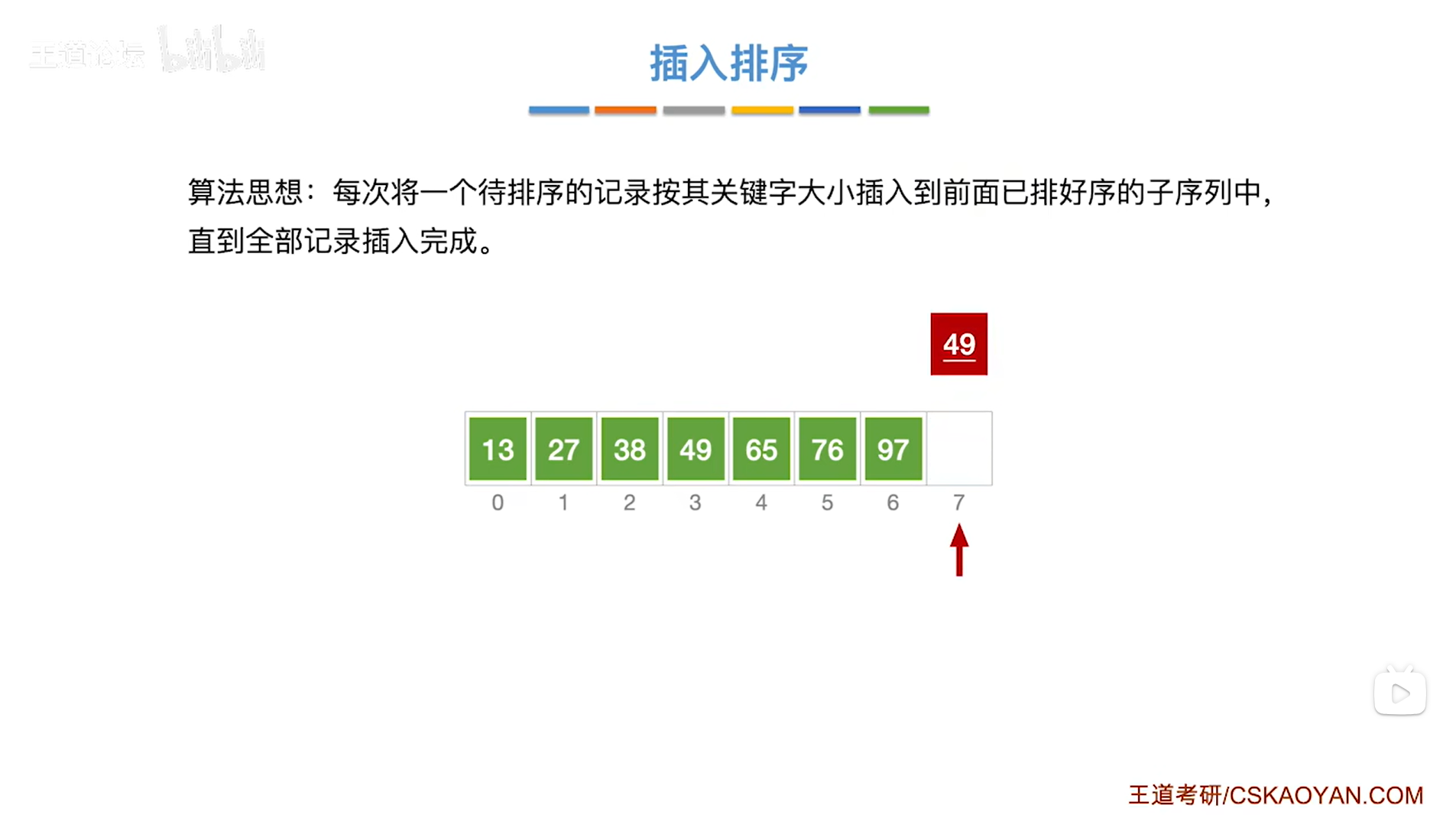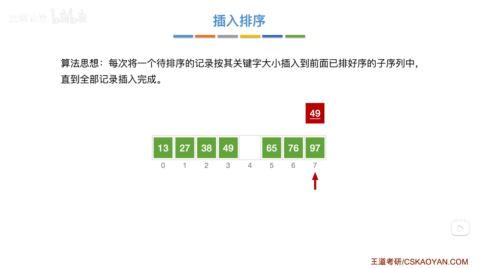 7索引上的49前面已排好序的子序列依次为13、27、38、49、65、76、97,