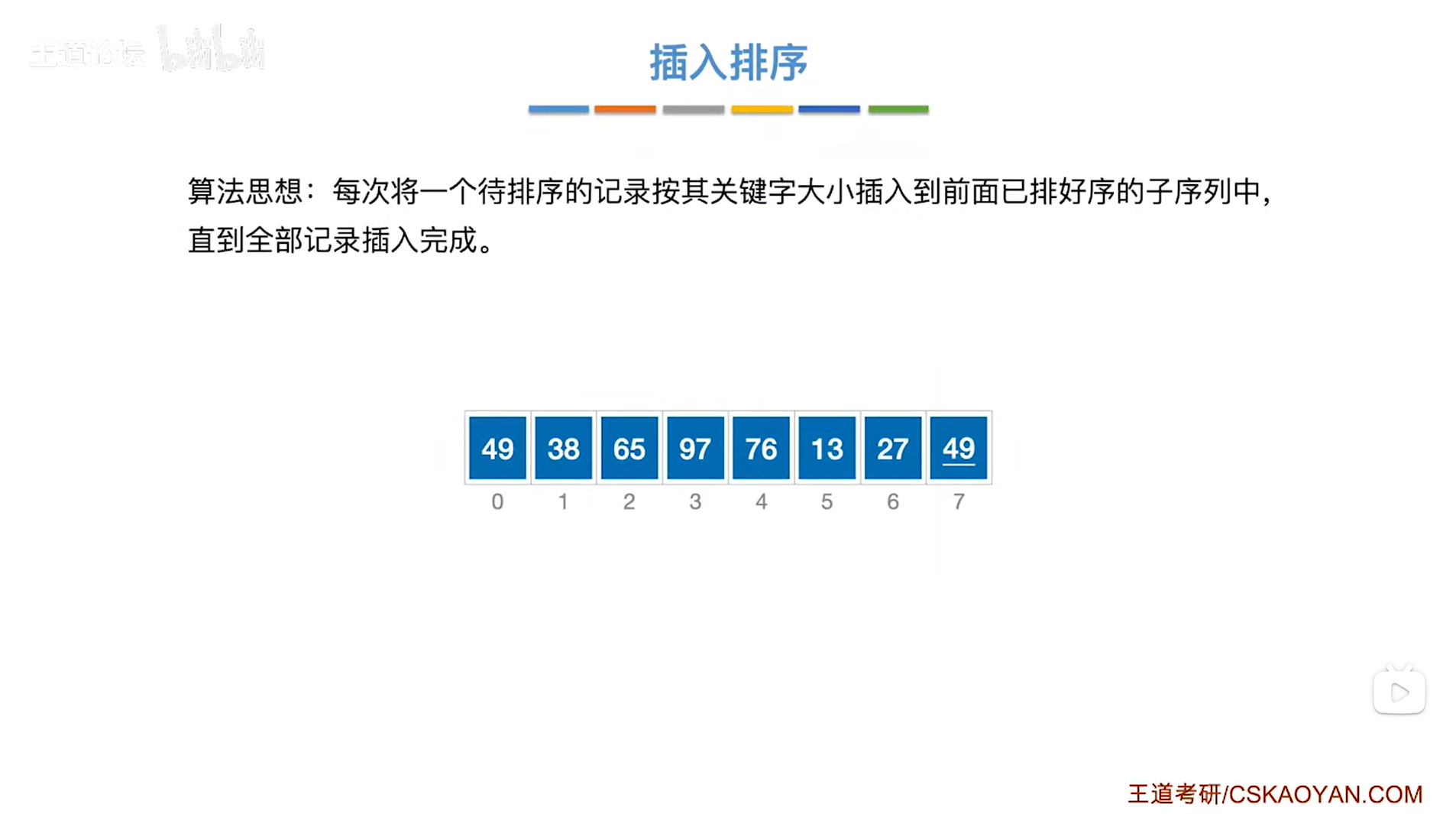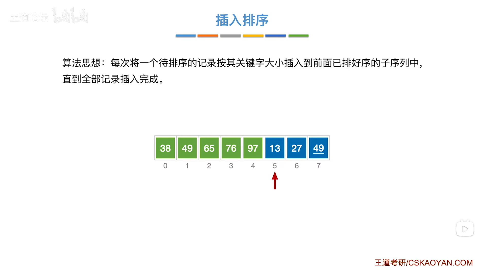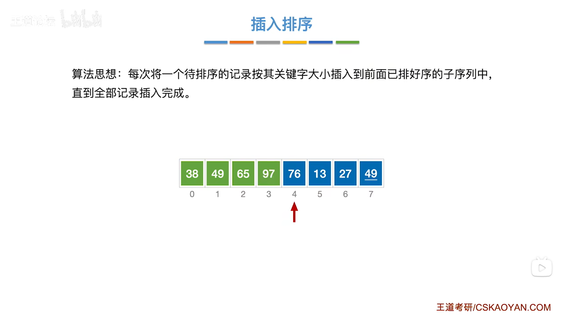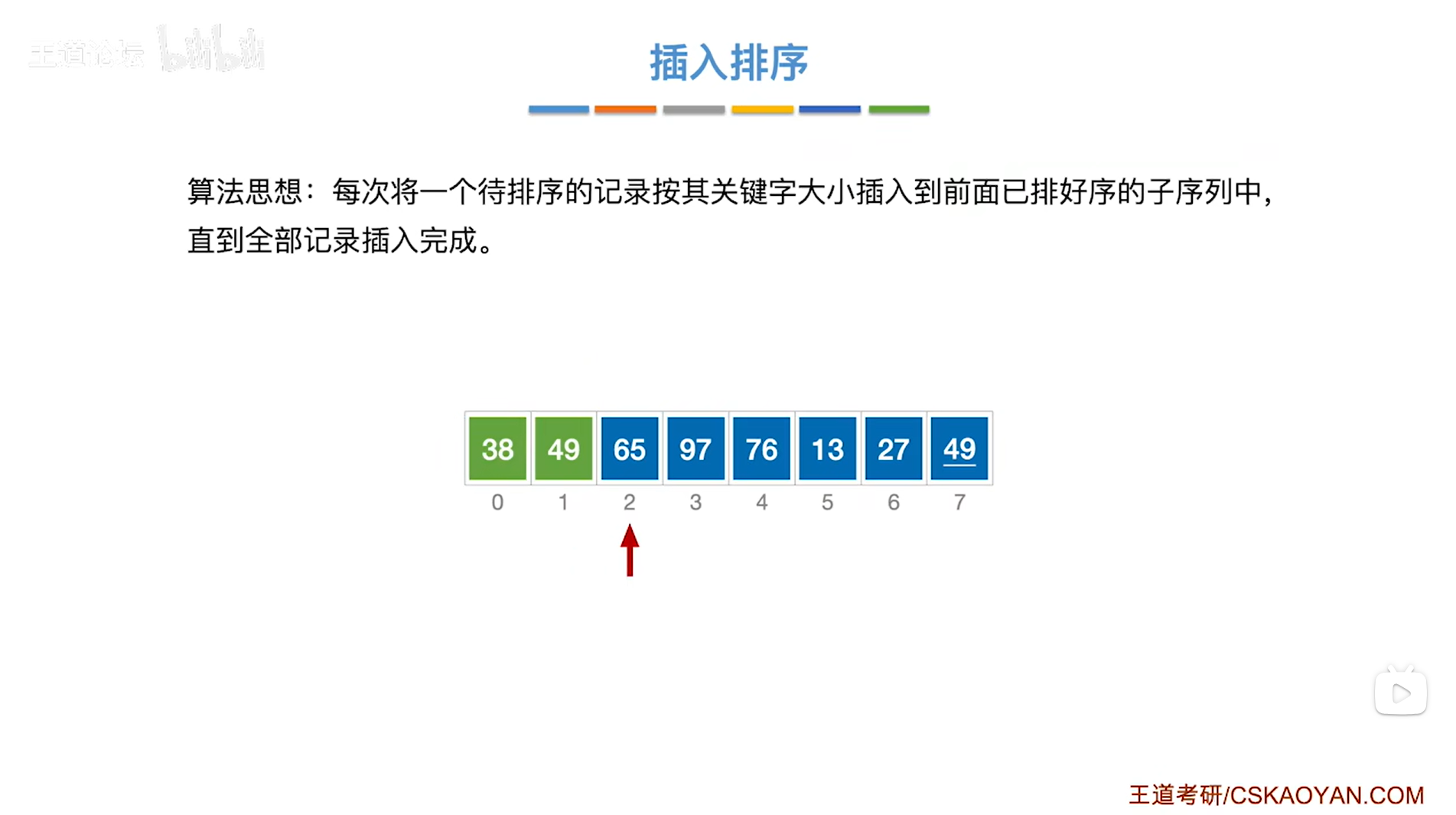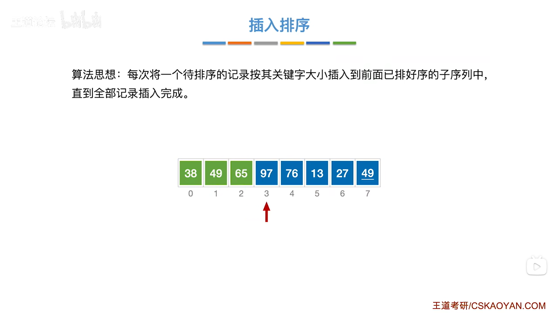7索引上的49前面已排好序的子序列依次为13、27、38、49、65、76、97,
