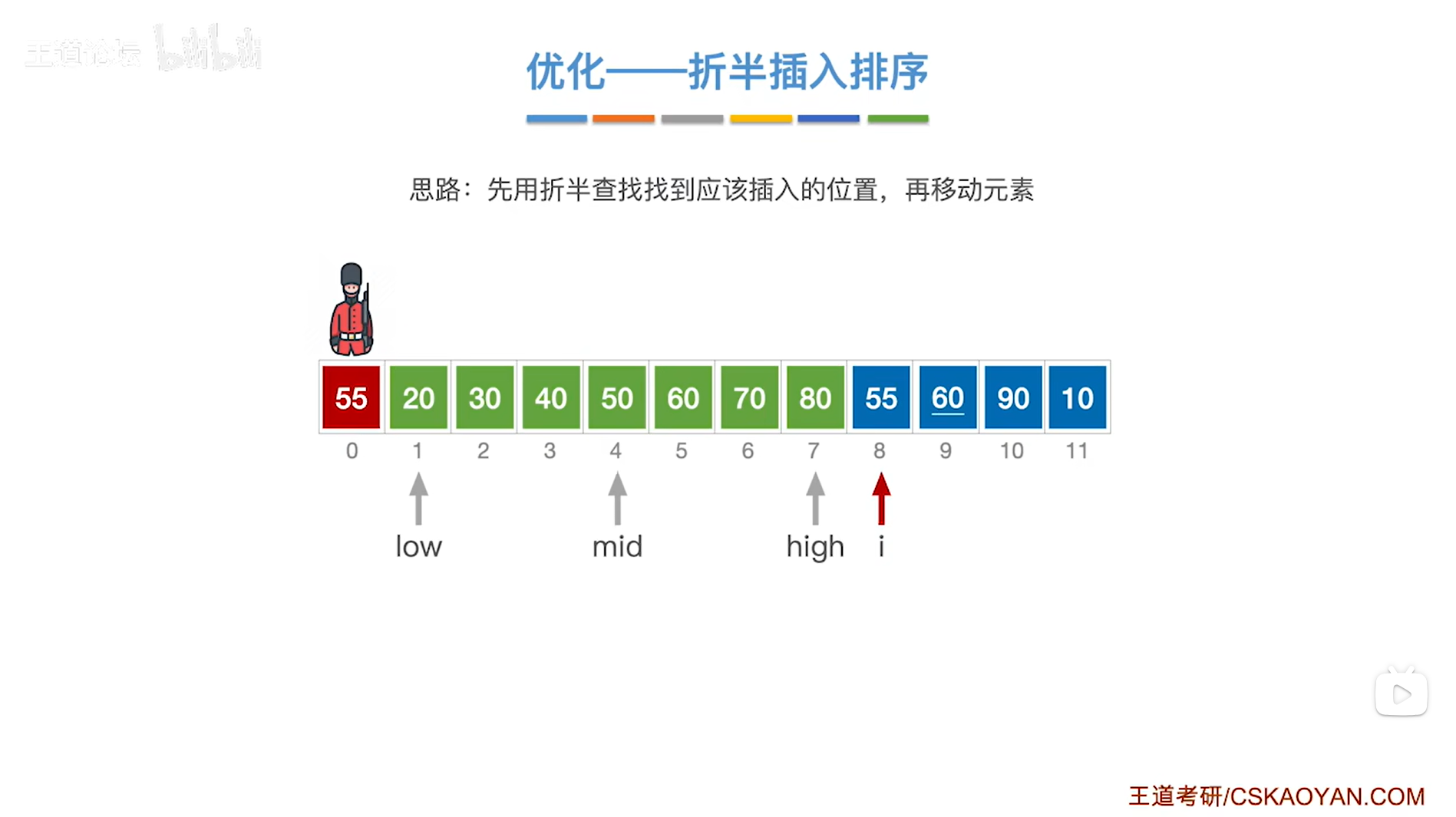 通过mid = ( low + high ) / 2可得出中间指针mid为5,因此中间指针mid指向5索引,意味着中间指针mid指向序列中5索引上的元素55;