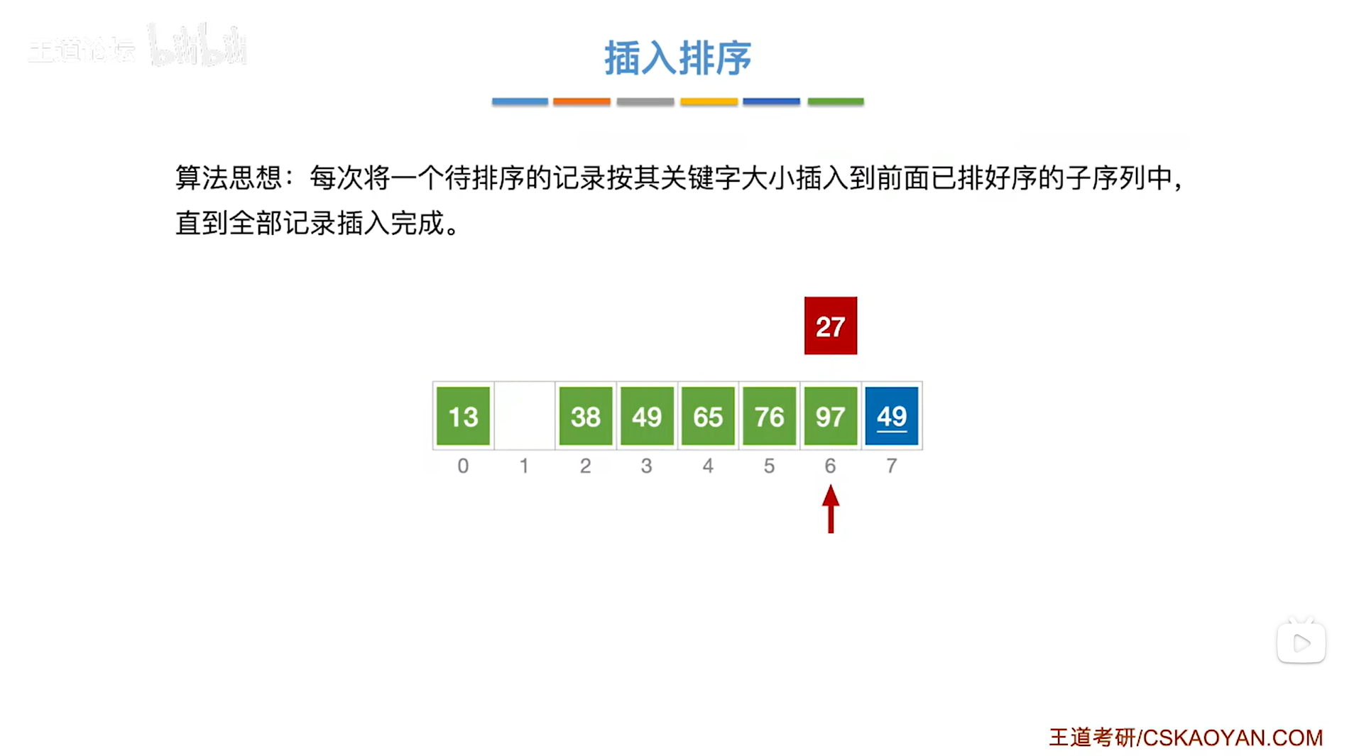 27前面已排好序的子序列依次为13、38、49、65、76、97,
