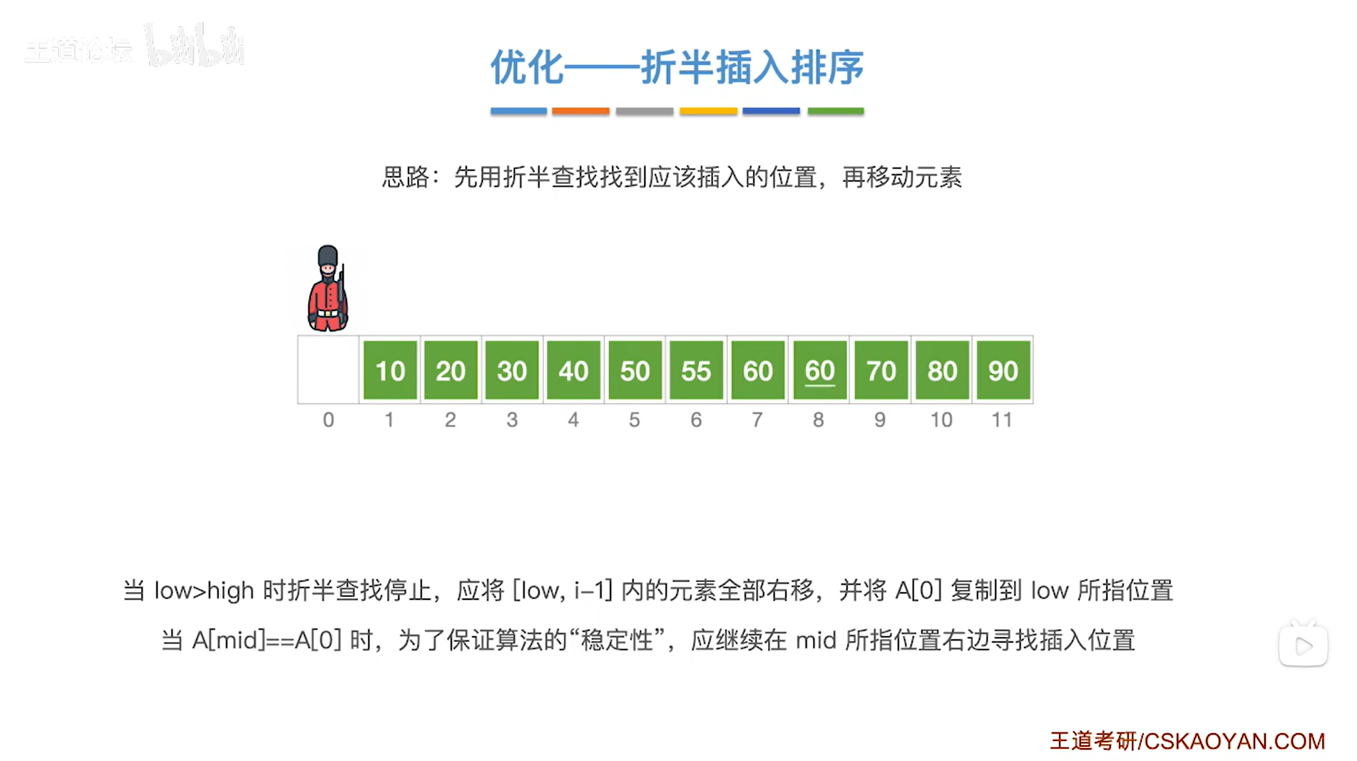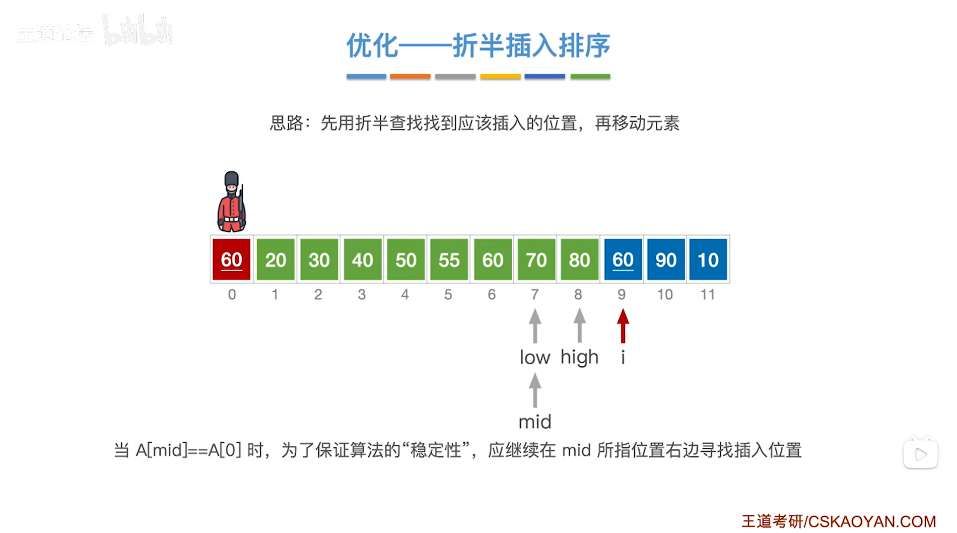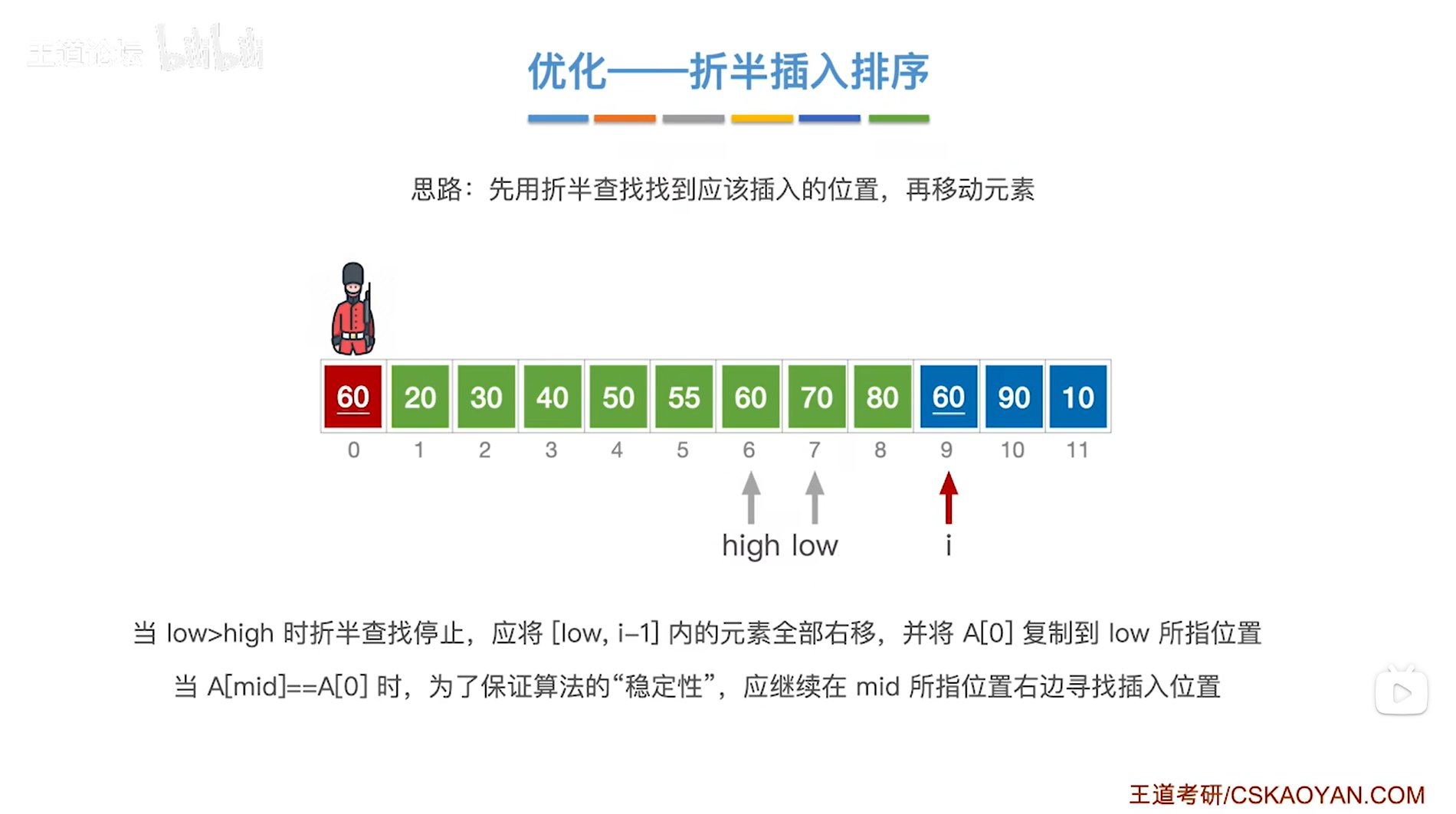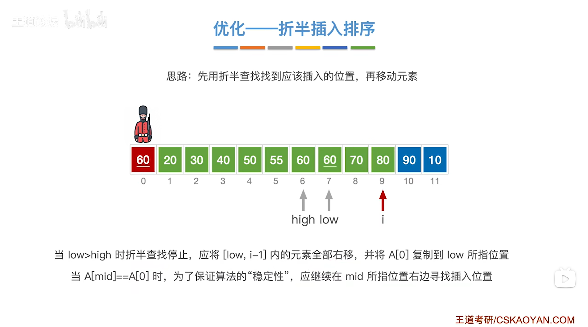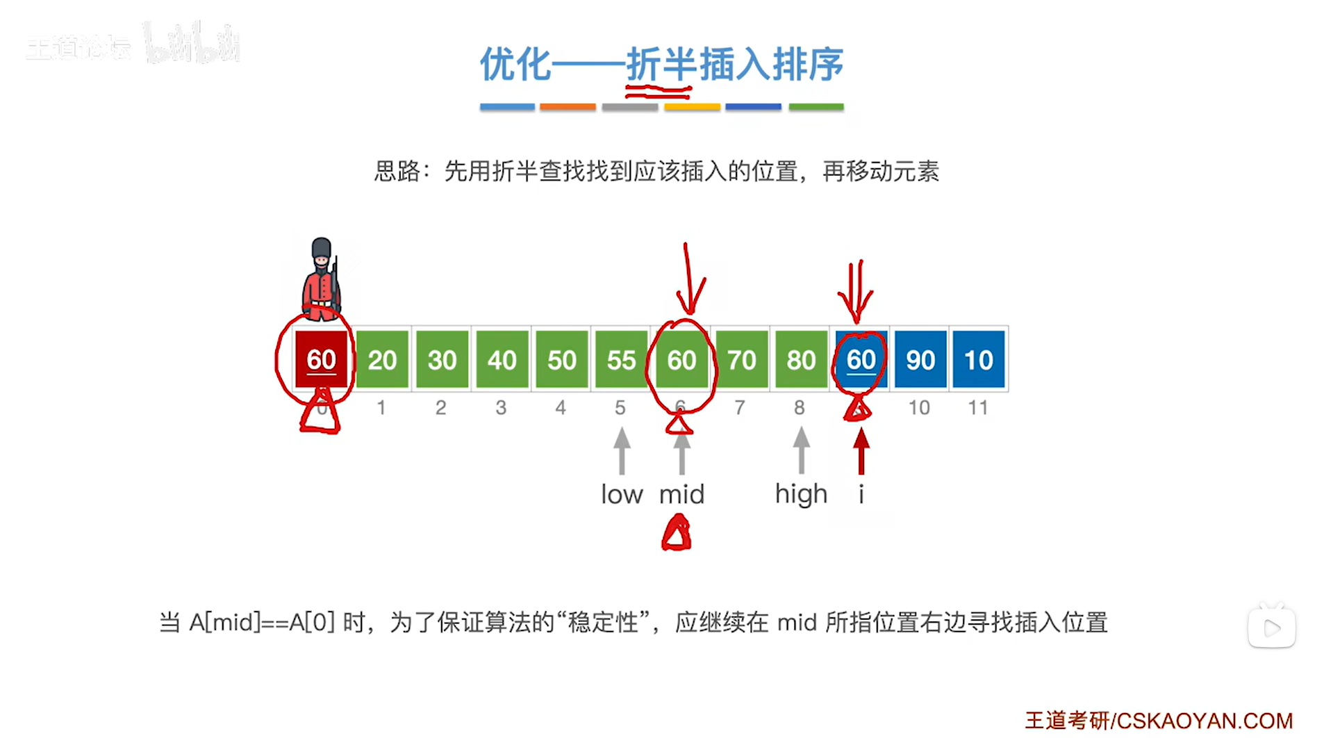 所以当发现了中间指针mid指向的元素等于当前处理的元素时并不会让折半查找停止,而是继续在mid指针所指的位置的右区间内继续查找当前处理的元素60应该插入的位置,