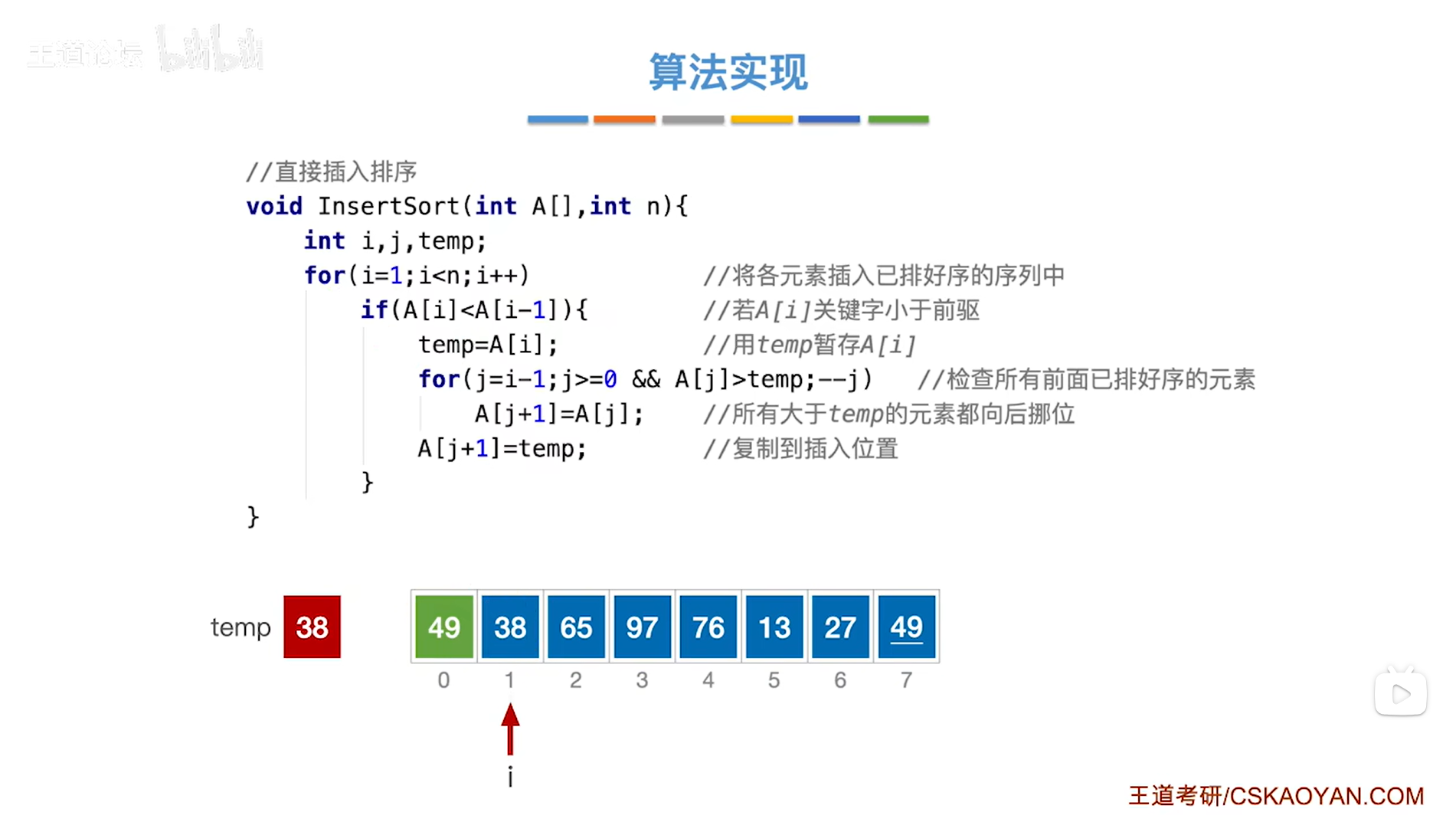 temp=A[i]; //用temp暂存A[i],防止移动元素的时候把A[i]覆盖
