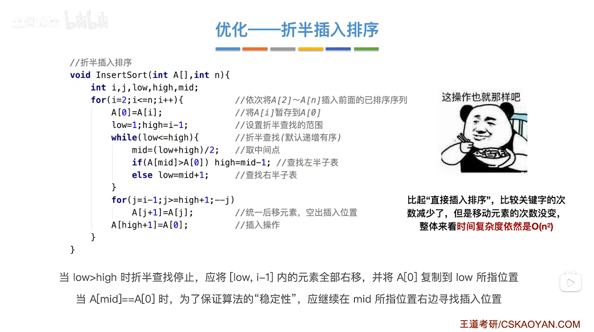 但在这个地方为了保证插入排序的稳定性,且要按照递增方式排序,若发现了中间指针mid指向的元素等于当前处理的元素时,还应该继续在中间指针mid的右半区间内继续查找,来确定当前处理的元素应插入的位置,