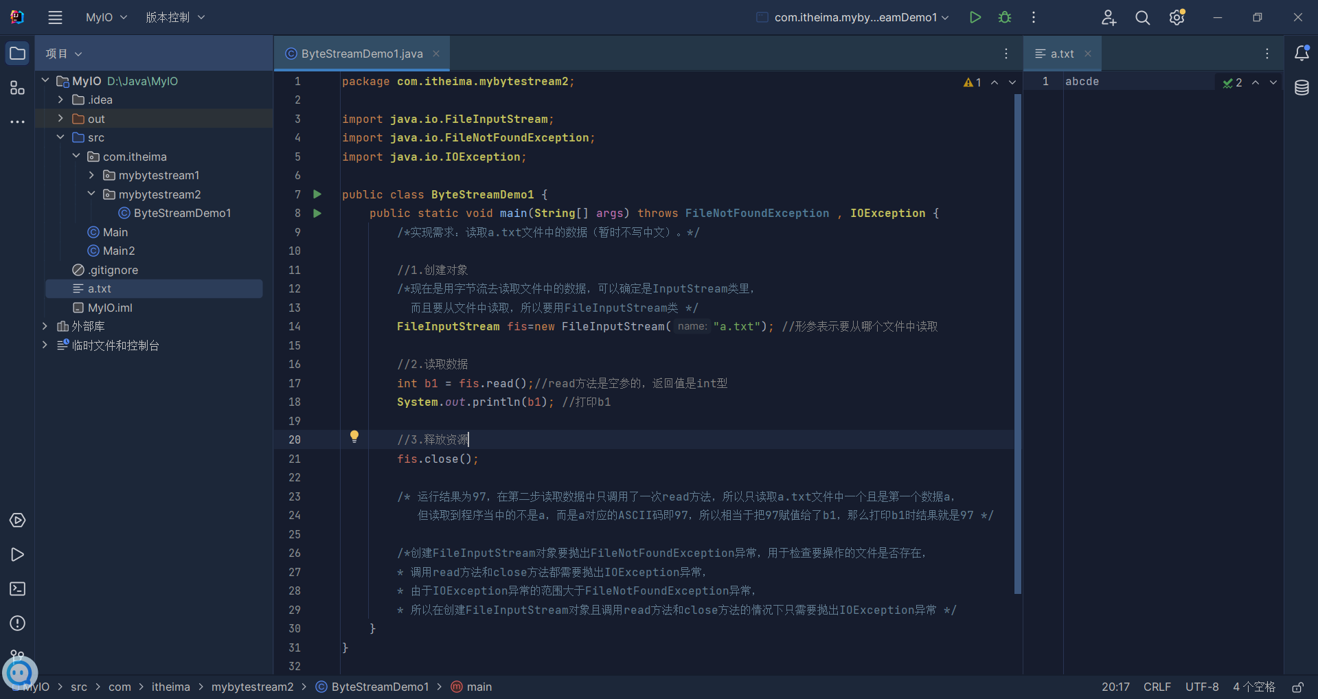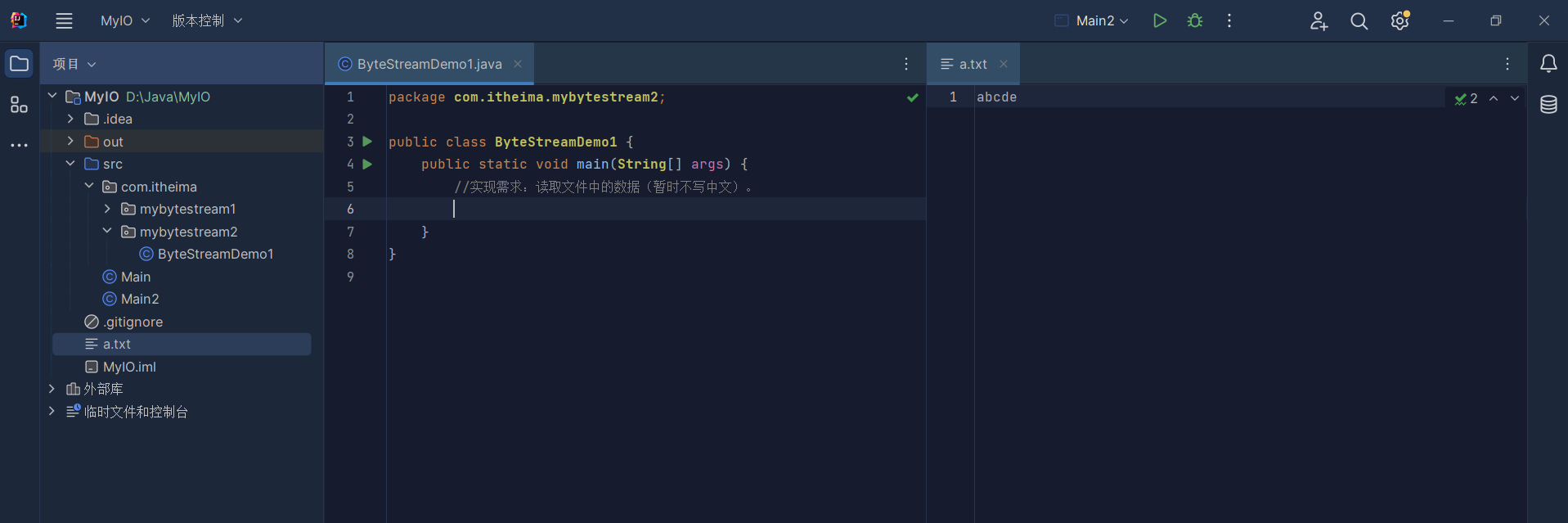 初始化测试类与文件a.txt,文件a.txt内容是abcde。