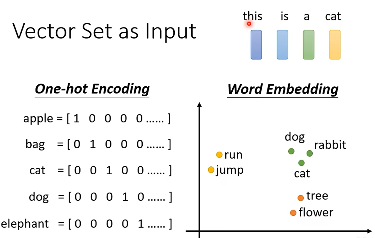 无论是预测视频观看人数还是图像处理,输入都可以看作是一个向量,输出是一个数值或类别。然而,若输入是一系列向量,长度可能会不同,例如把句子里的单词都描述为向量,那么模型的输入就是一个向量集合,并且每个向量的大小都不一样。解决这个问题的方法是One-hot Encoding以及Word Embedding,其中Word Embedding更能考虑到相似向量的语义信息,如下所示: