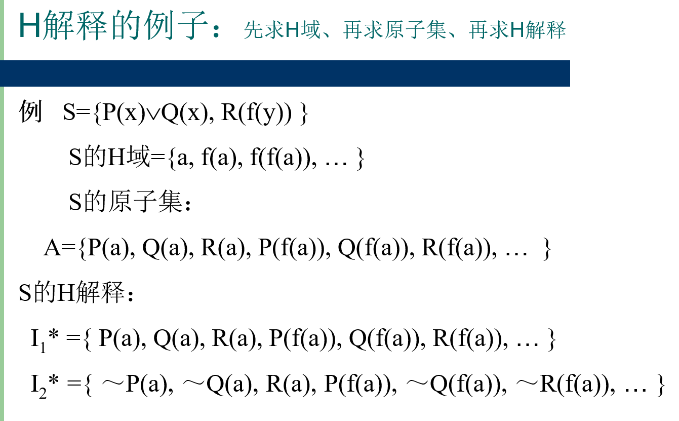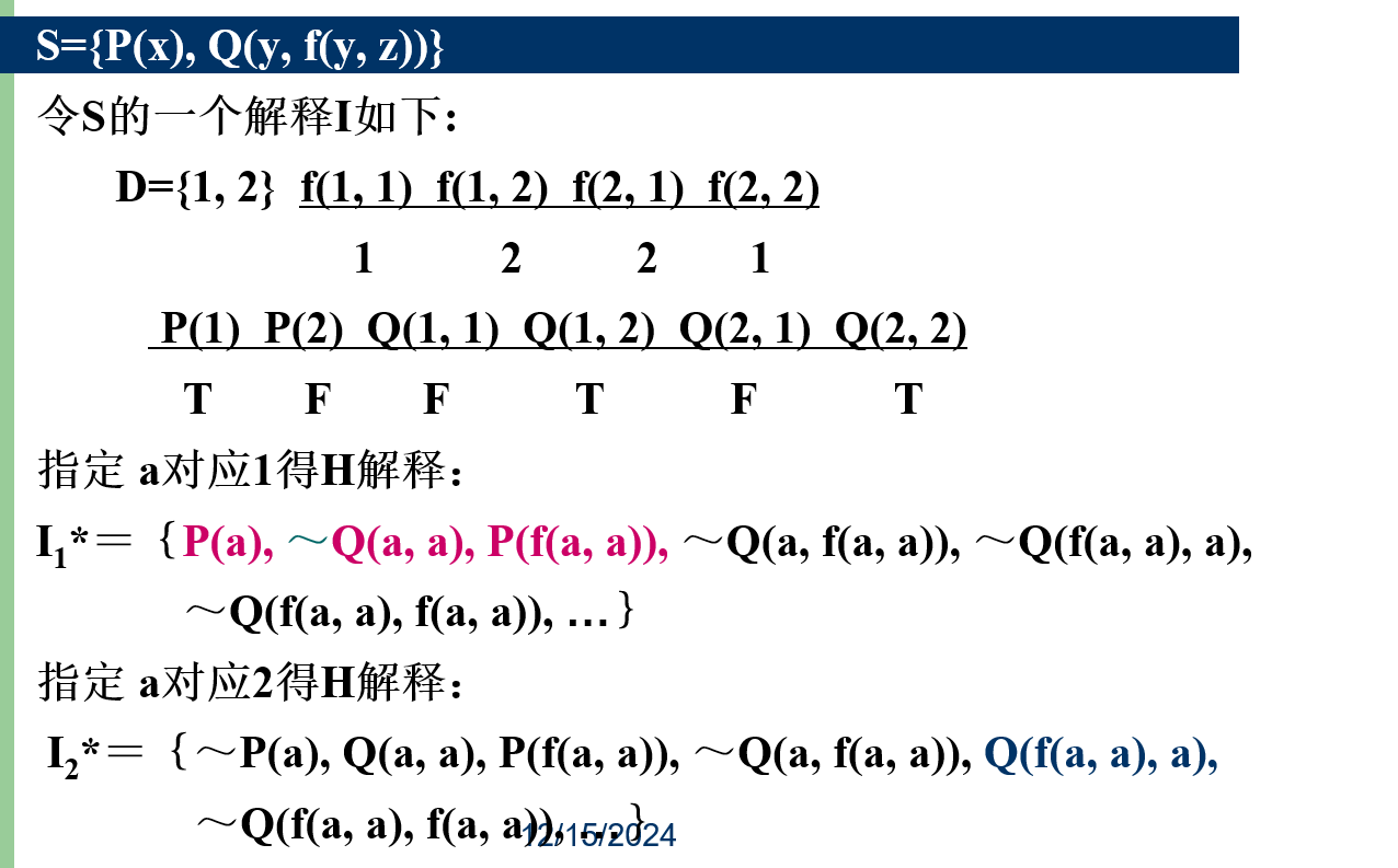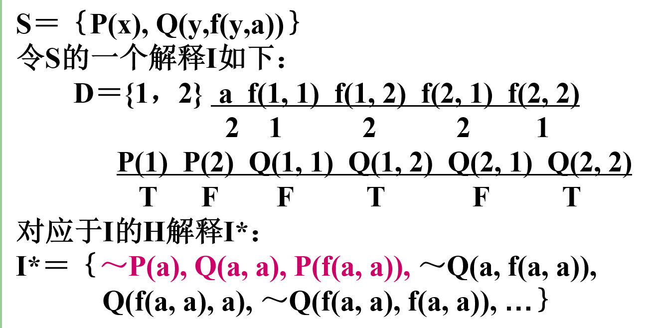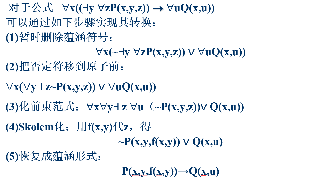 Note:对偶Skolem化:全称量词用存在量词的Skolem函数所代替,然后把存在量词删去,出现的变量假定都是存在定量的。